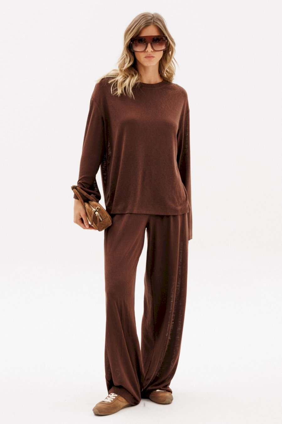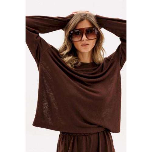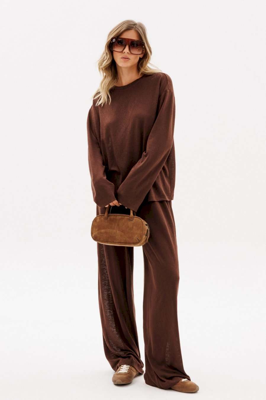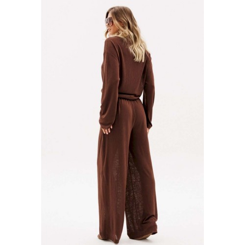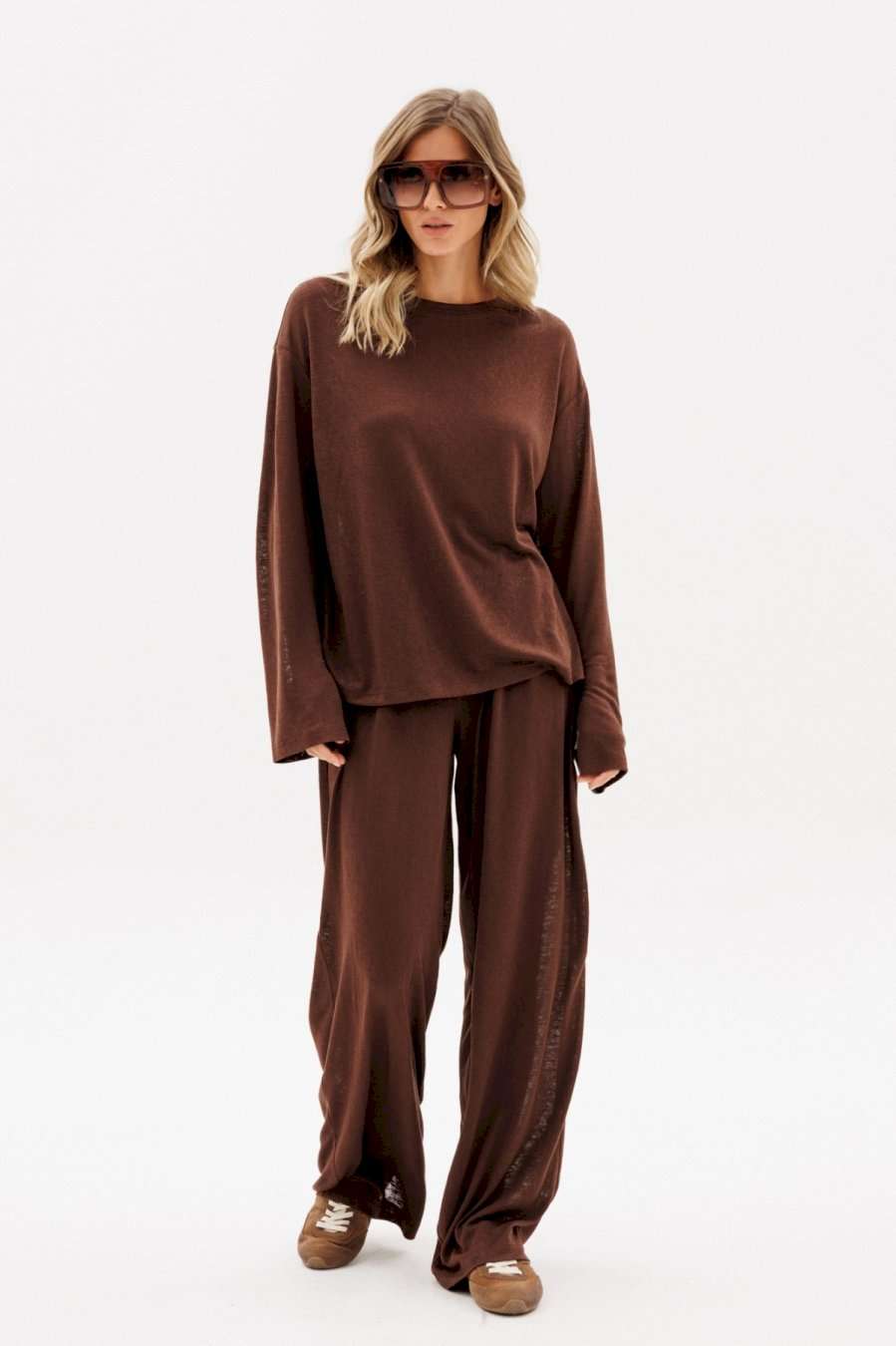 Комплект: джемпер + брюки. Комплект выполнен из трикотажного полотна. Джемпер прямого силуэта, длиной до линии бедра. Перед и спинка цельные. Горловина округлой формы, обработана широкой бейкой. Плечевой шов удлинен. Рукав рубашечного покроя, одношовный. Брюки прямого покроя, длиной в пол, на притачном поясе с эластиной тесьмой. Длина джемпера: р.44-48 - 63 см, р.50-54 - 64,5 см. Длина рукава от горловины: р.44-48 - 78 см, р.50-54 - 79 см. Длина брюкпо боковому шву: р.44-48 - 111 см, р.50-54 - 112 см.