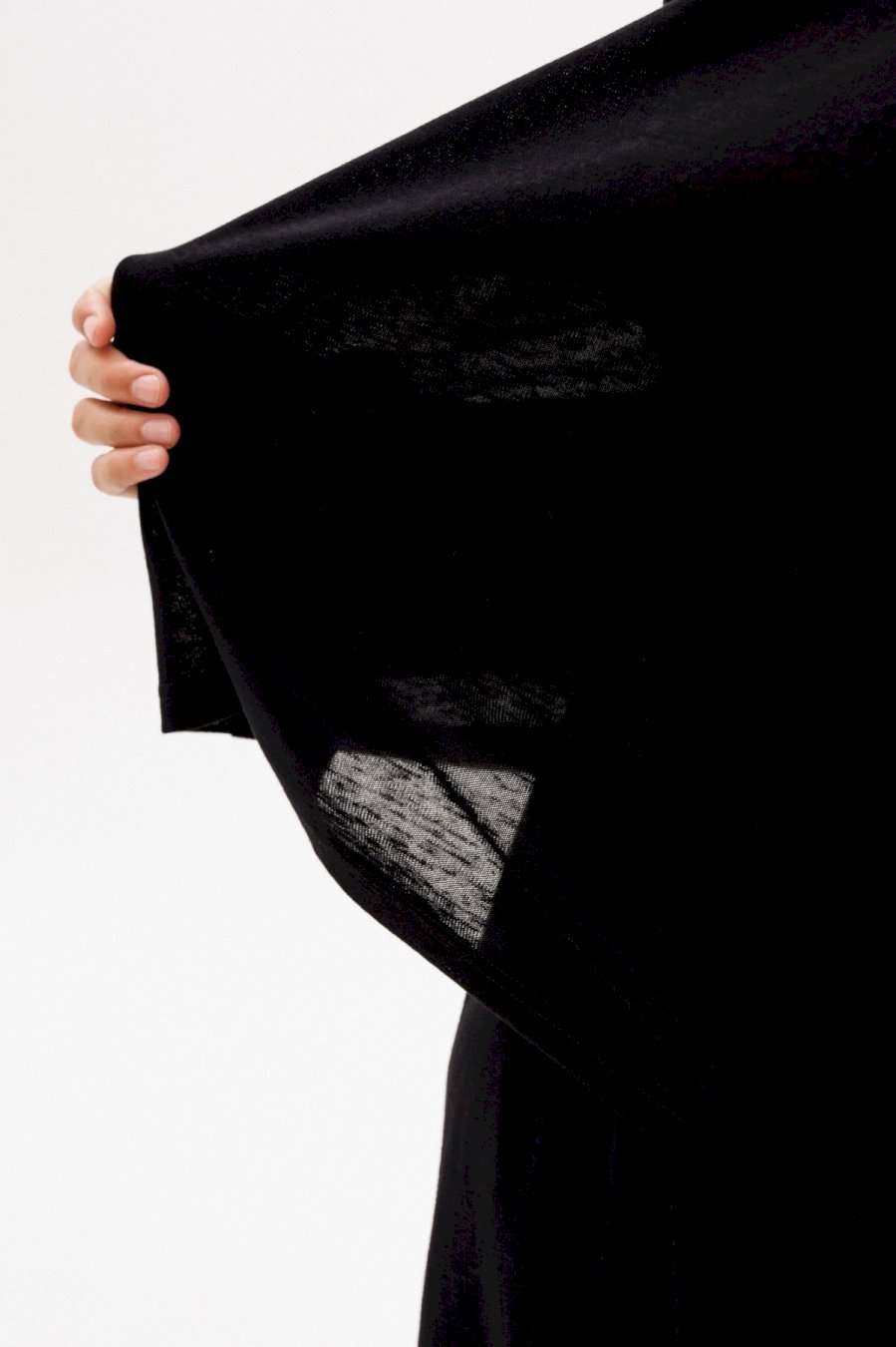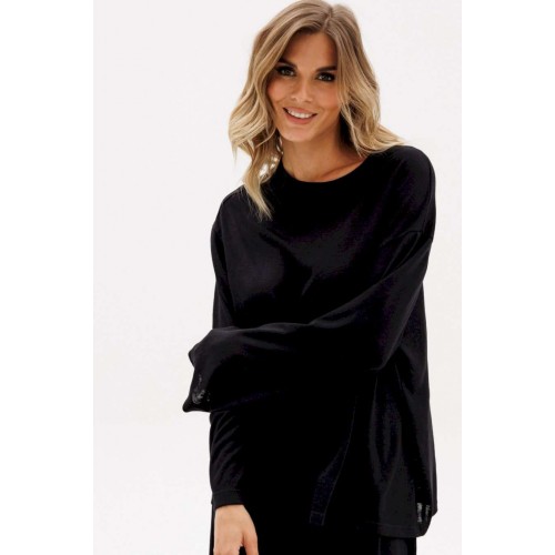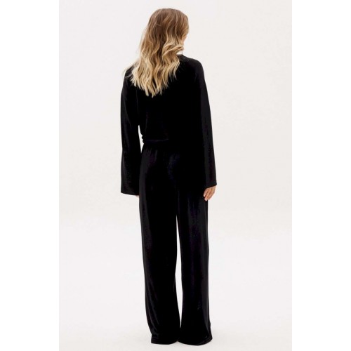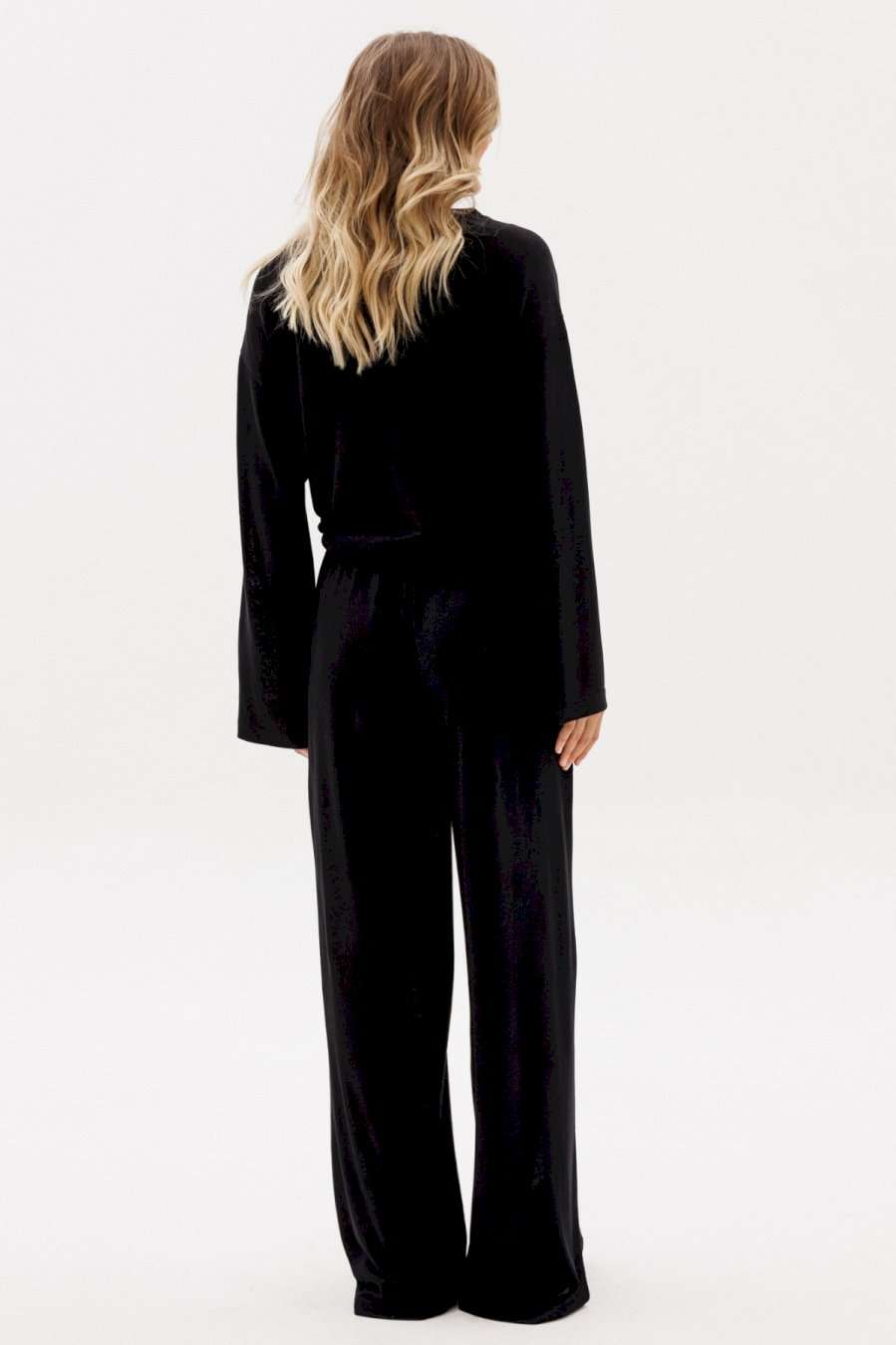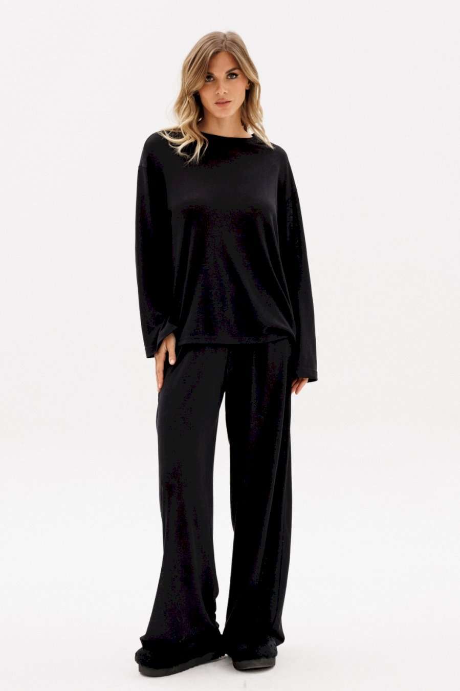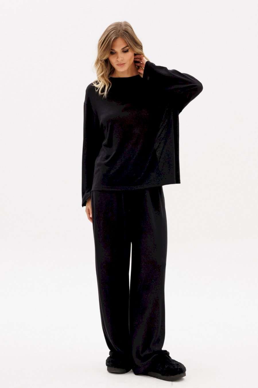 Комплект: джемпер + брюки. Комплект выполнен из трикотажного полотна. Джемпер прямого силуэта, длиной до линии бедра. Перед и спинка цельные. Горловина округлой формы, обработана широкой бейкой. Плечевой шов удлинен. Рукав рубашечного покроя, одношовный. Брюки прямого покроя, длиной в пол, на притачном поясе с эластиной тесьмой. Длина джемпера: р.44-48 - 63 см, р.50-54 - 64,5 см. Длина рукава от горловины: р.44-48 - 78 см, р.50-54 - 79 см. Длина брюкпо боковому шву: р.44-48 - 111 см, р.50-54 - 112 см.
