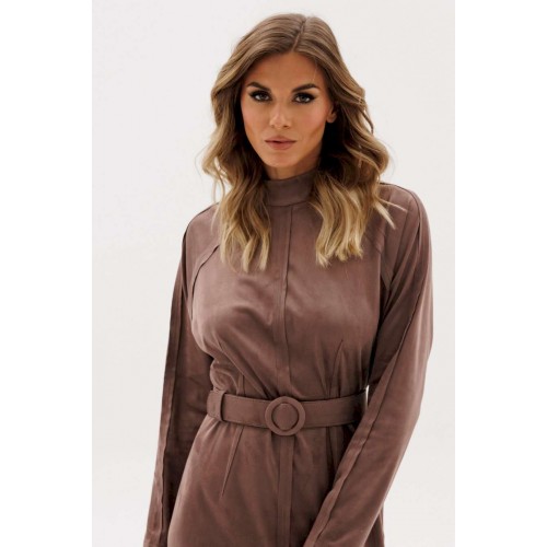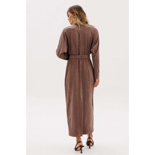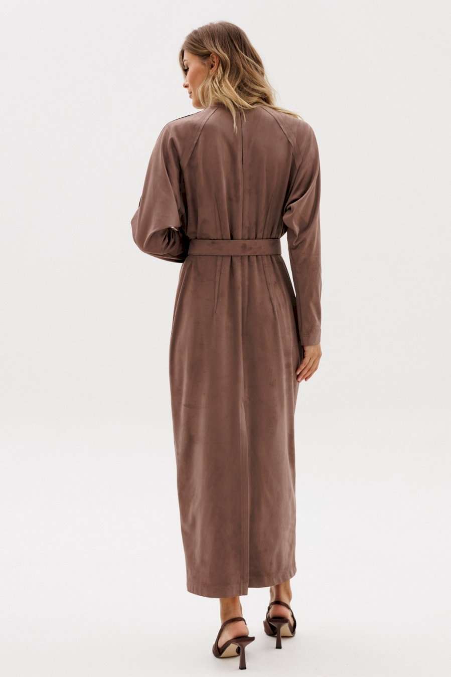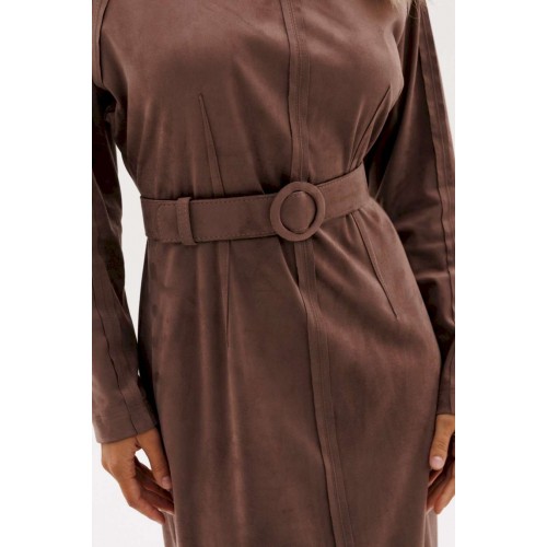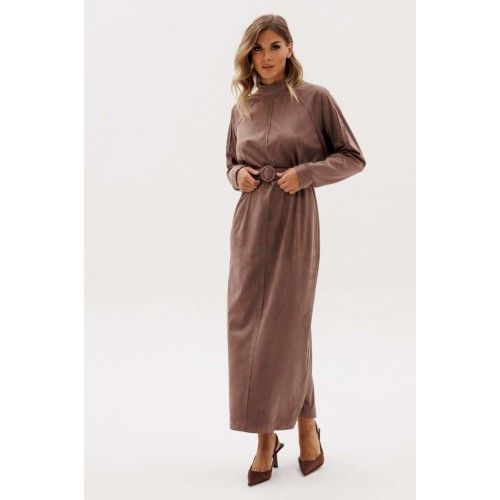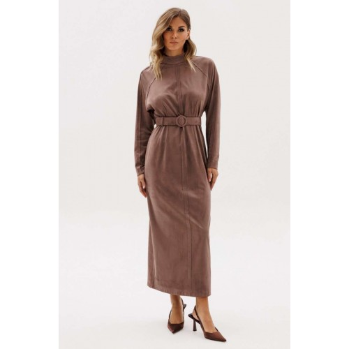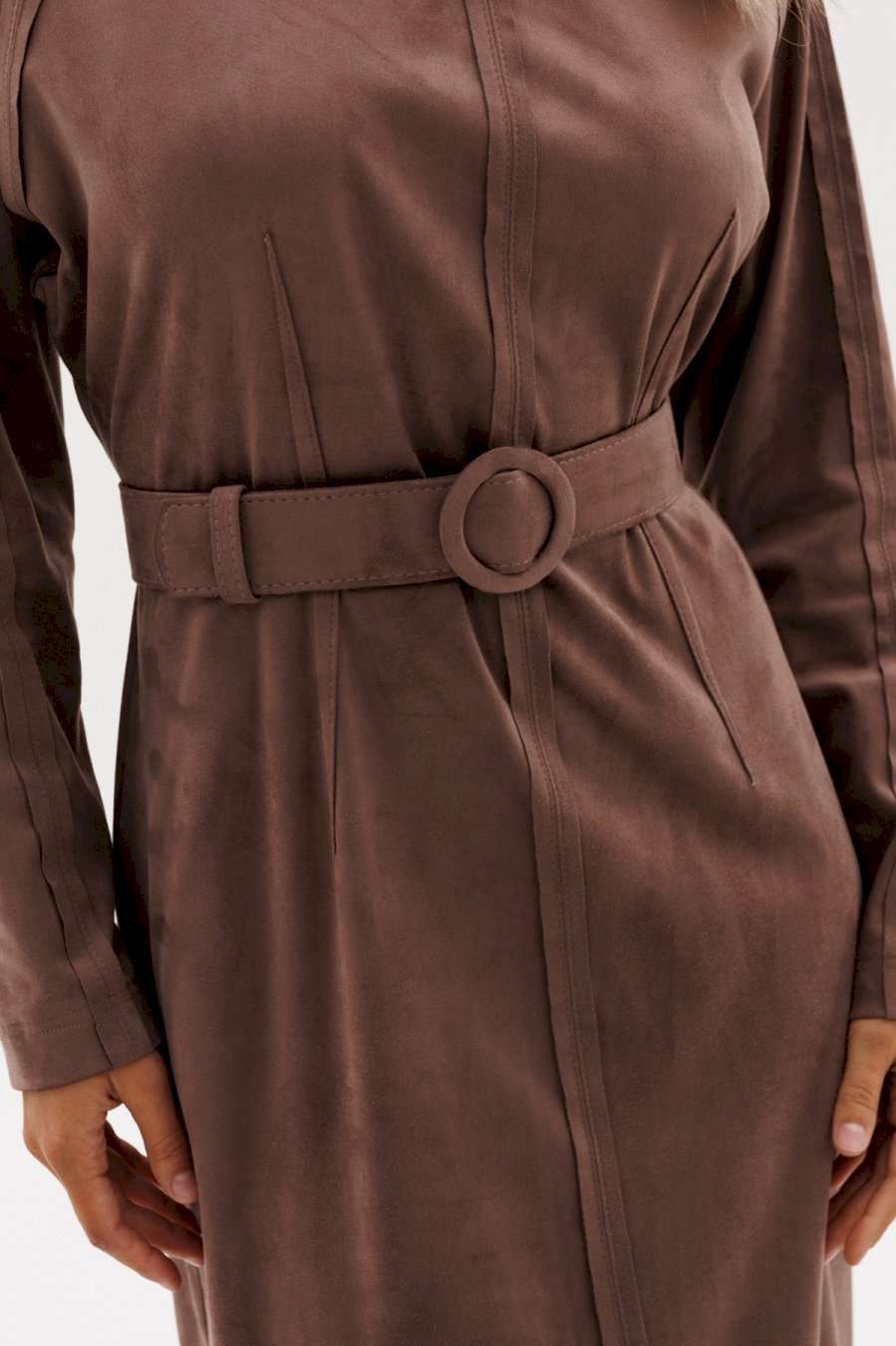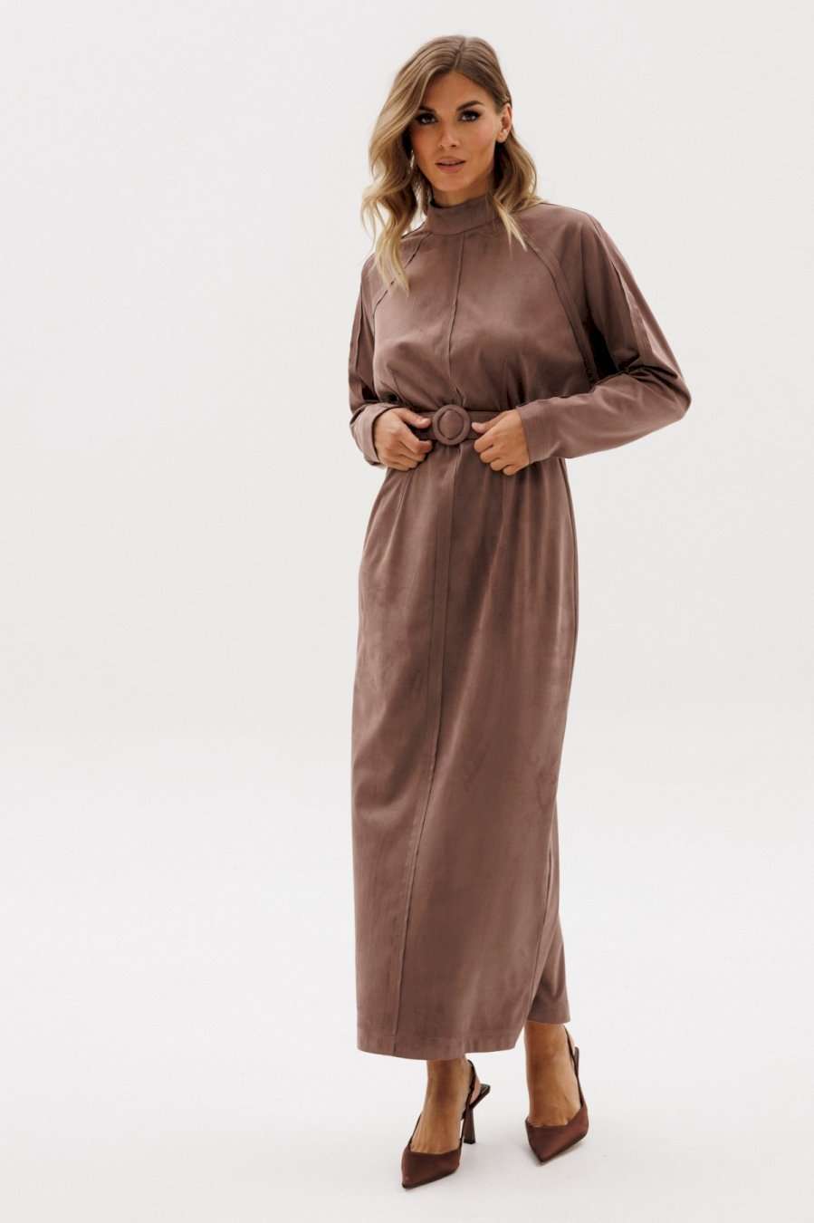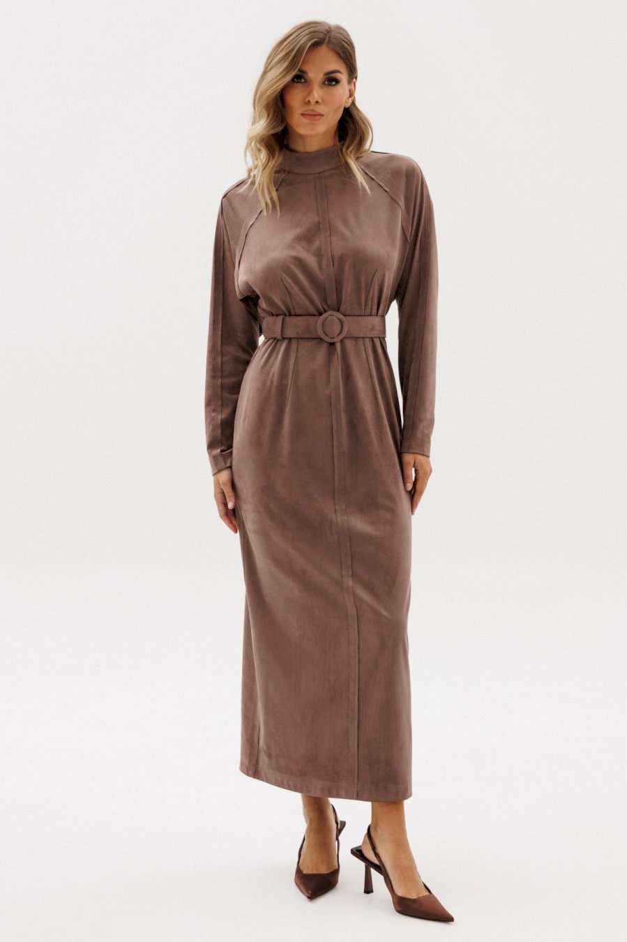 Платье выполнено из тонкой искуственной замши. Платье полуприлегающего силуэта, длиной миди. Платье отрезное по линии талии. Спереди и на спинке талиевые вытачки и средний шов. Застежка на потайную молнию в среднем шве спинки. Воротник-стойка. Рукав покроя реглан. Средний шов переда, талиевые вытачки, верхний шов рукава и линии реглана обработаны "на лицо". В комплект входит съемный ремень из основной ткани с обтяжной пряжкой. Длина платья: р.44-48 - 130 см, р. 50-54 - 131,5 см. Длина рукава от горловины: р. 44-48 - 72 см, р. 50-54 - 73 см