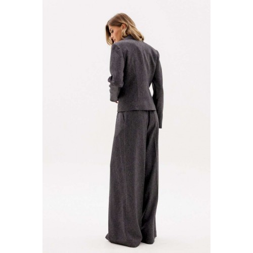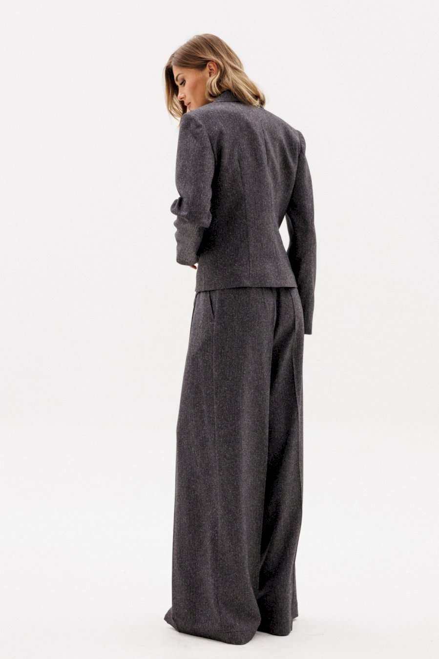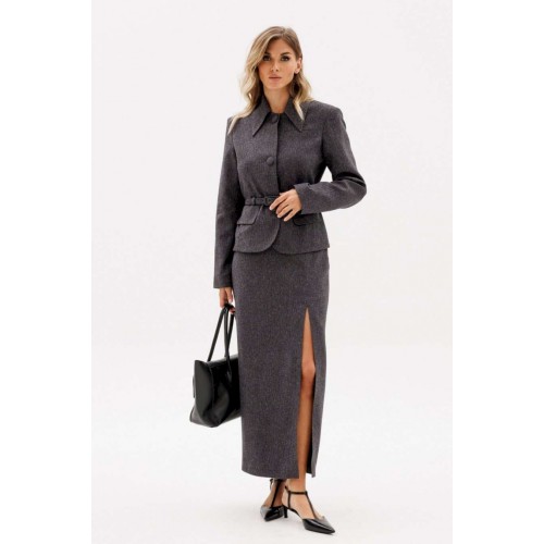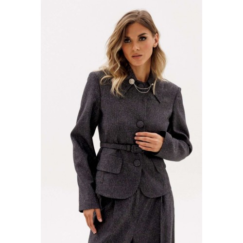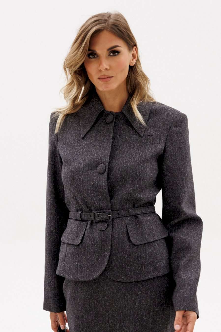 Жакет выполнен из костюмной ткани меланж. Жакет полуприлегающего силуэта длиной выше линии бедер. Спереди центральная застежка на пуговицы и декоративные клапаны. Воротник стояче-отложной. Спинка со средним швом. Рукав втачного покроя двухшовный. Жакет на притачной по низу подкладке. В комплект входит ремень из основной ткани с обтяжной пряжкой. Длина жакета: р. 44-48 - 57 см, р. 50-54 - 58,5 см. Длина рукава: р. 44-48 - 63 см, р. 50-54 - 64 см