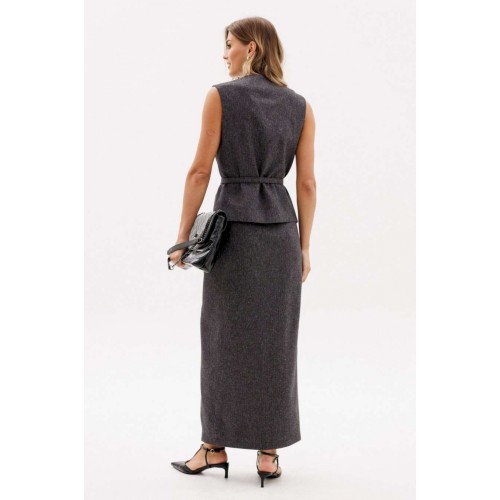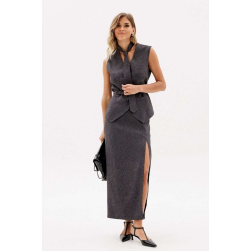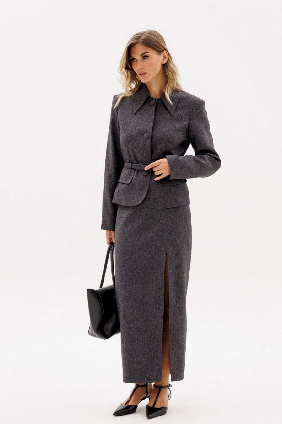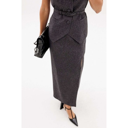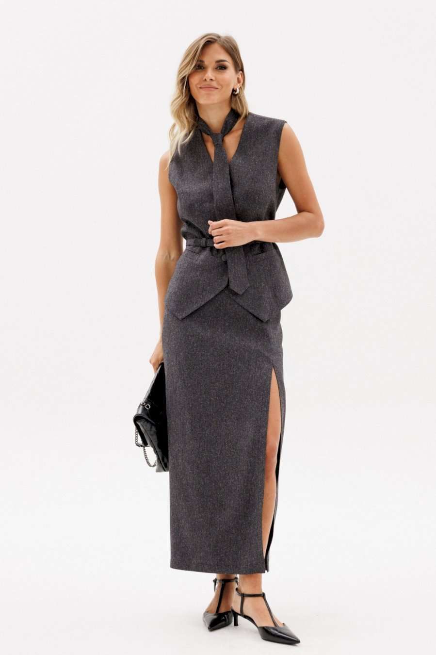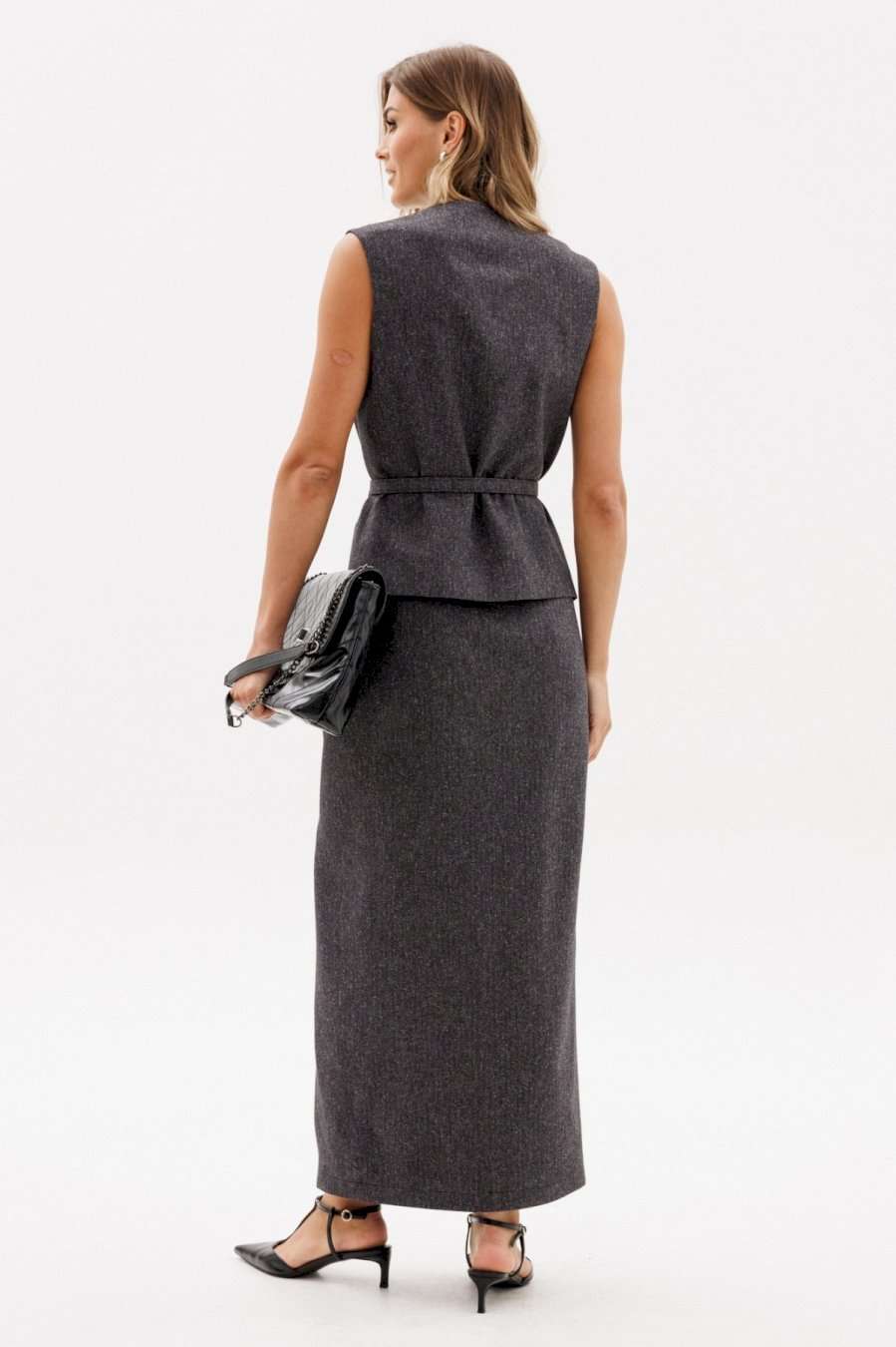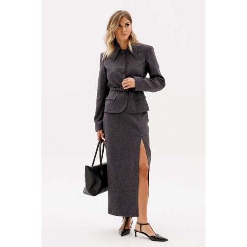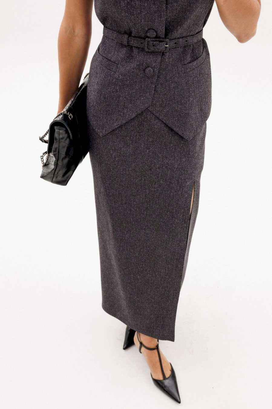 Юбка выполнена из костюмной ткани меланж. Юбка на притачном поясе, длиной выше линии щиколотки, зауженная к низу. Застежка сбоку на потайную молнию. Спереди слева разрез. Юбка на обтачной по низу подкладке. Длина юбки: р. 44-48 - 97 см, р. 50-54 - 98 см