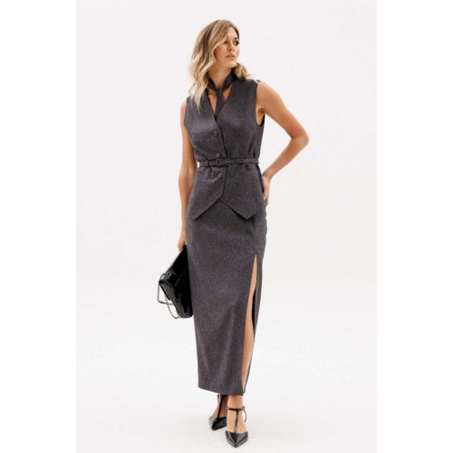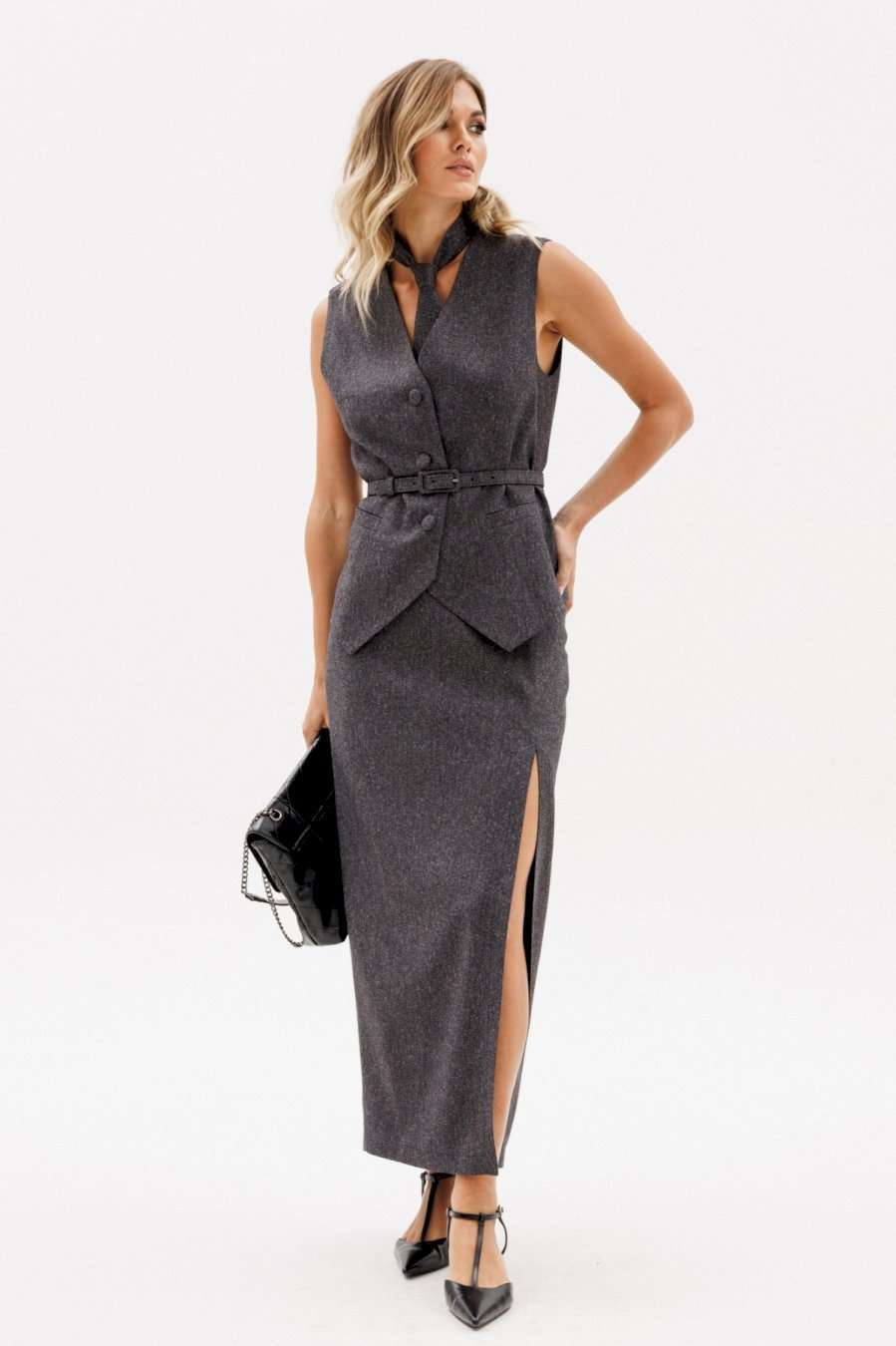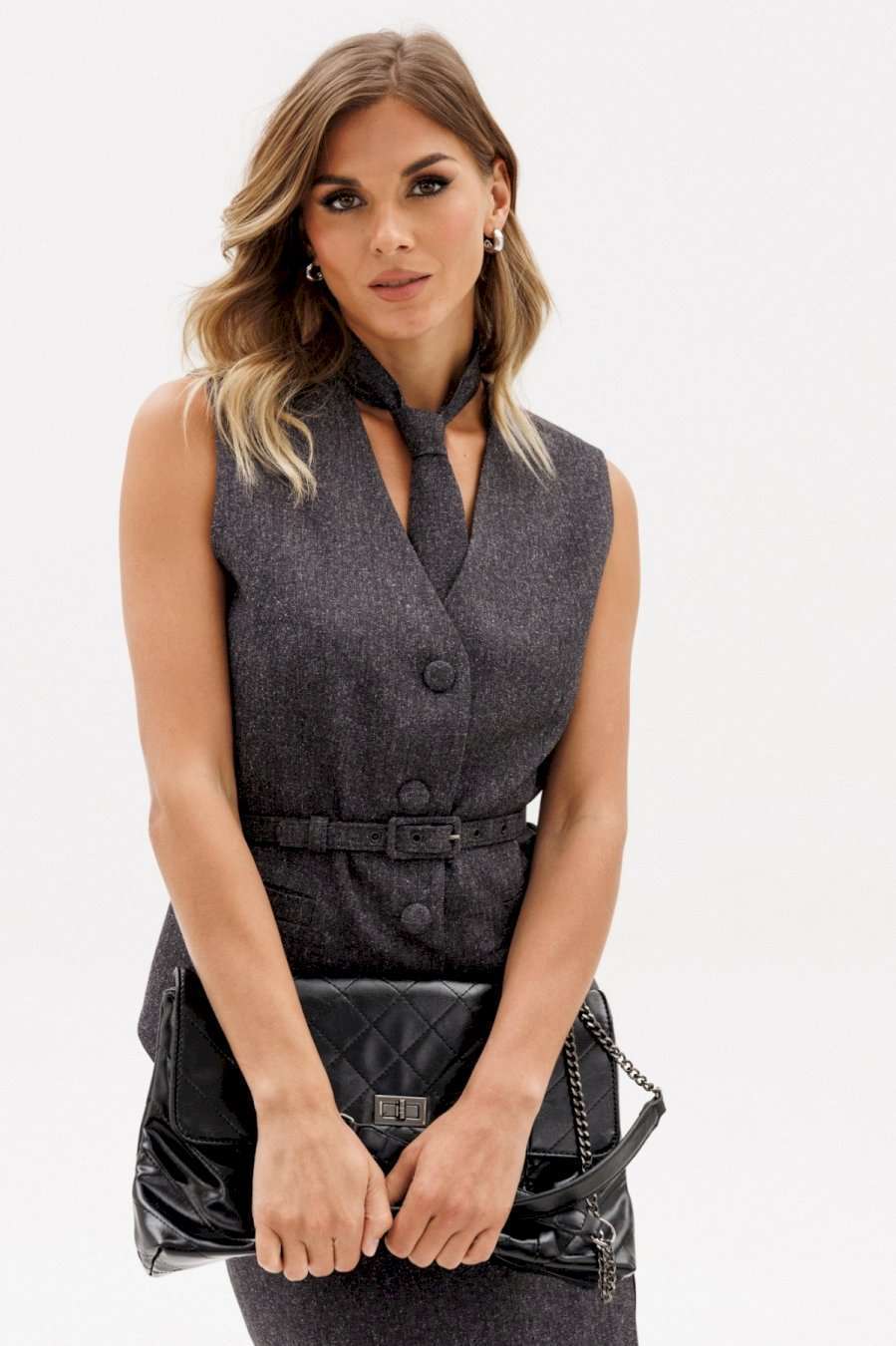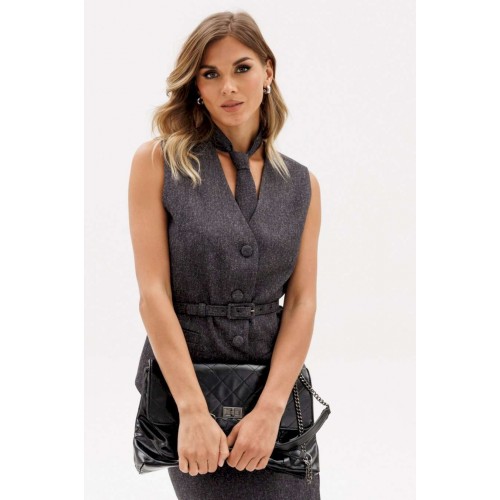 Жилет выполнен из костюмной ткани меланж. Жилет полуприлегающего силуэта, длиной до линии бедер. Низ жилета фигурной формы. Спереди декоративные карманы и центральная застежка на пуговицы. Горловина переда V-образной формы. Жилет на притачной по низу подкладке. В комплект входит ремень из основной ткани с обтяжной пряжкой. Галстук продается отдельно м.0064. Длина жилета: р. 44-48 - 56 см, р. 50-54 - 57,5 см.