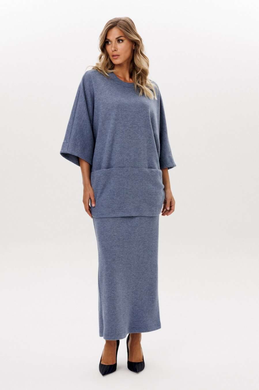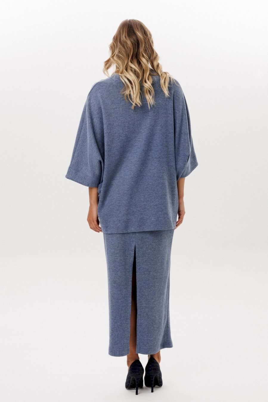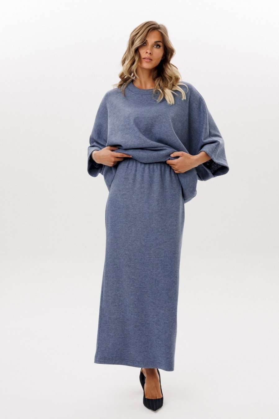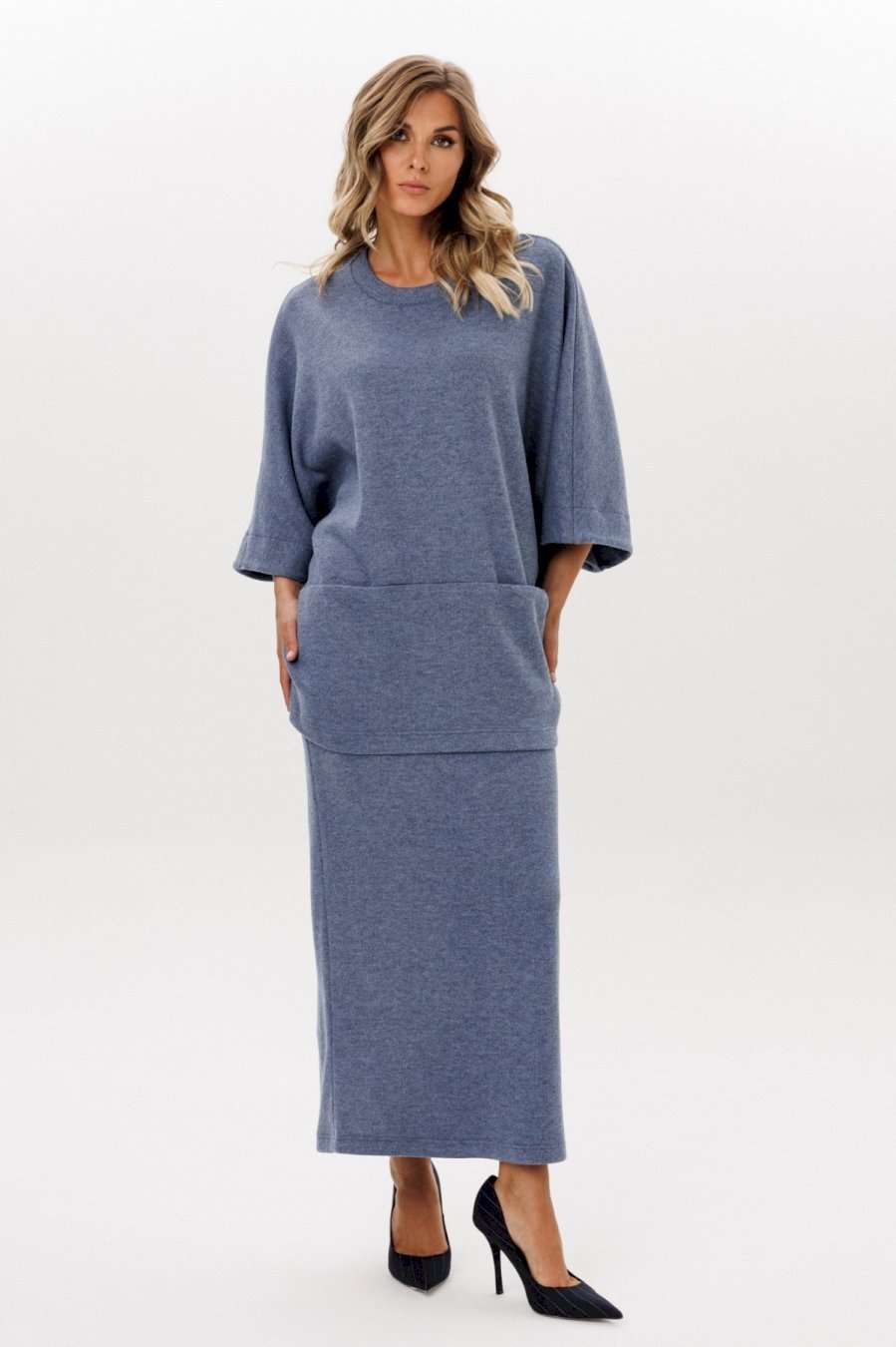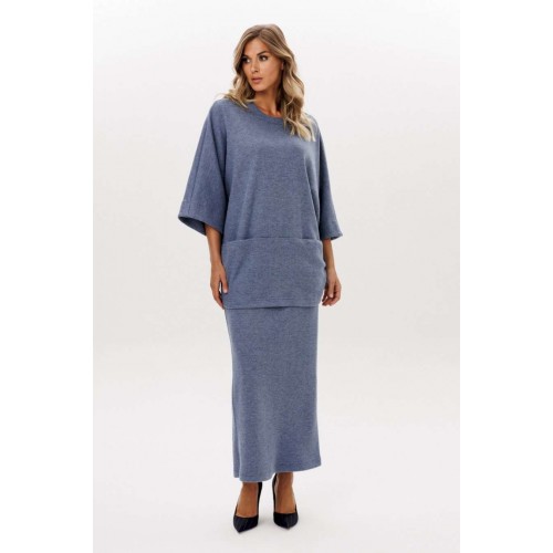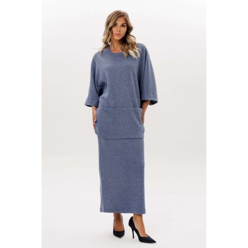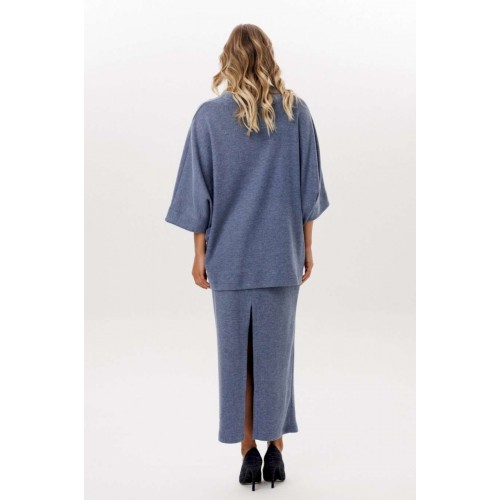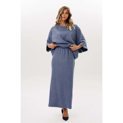 Юбка выполнена из трикотажного полотна. Юбка прямого силуэта, длиной миди, на цельнокроенном поясе с эластичной тесьмой. Сзади разрез в среднем шве. Длина юбки: р. 44-48 - 96 см, р. 50-54 - 97 см