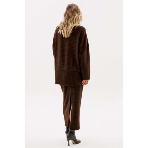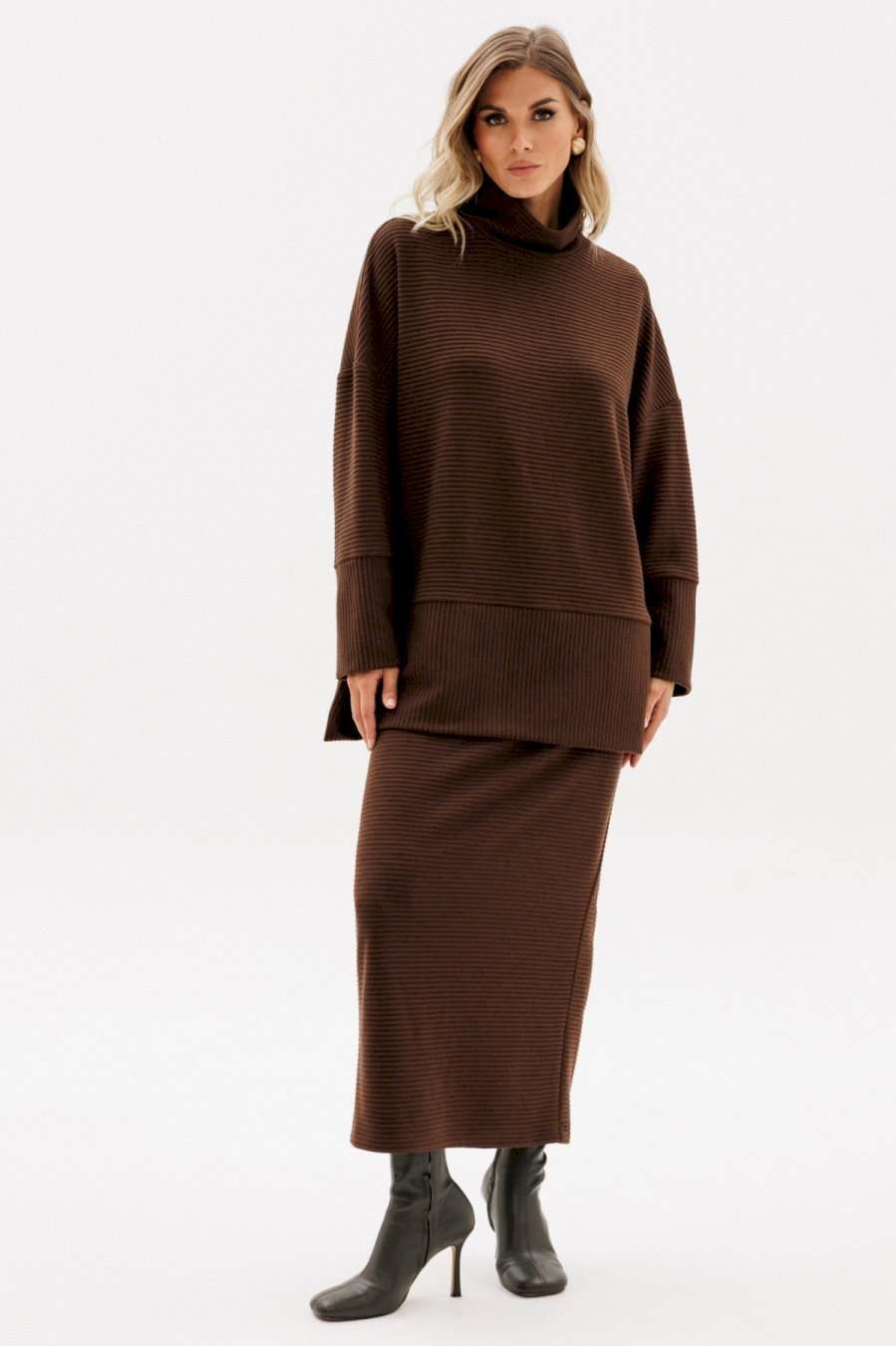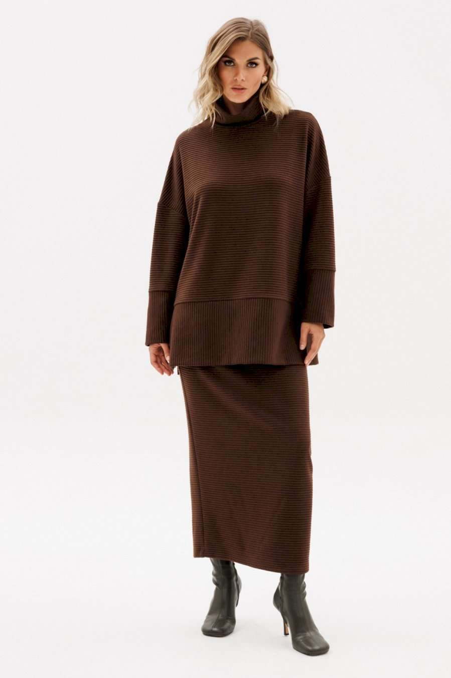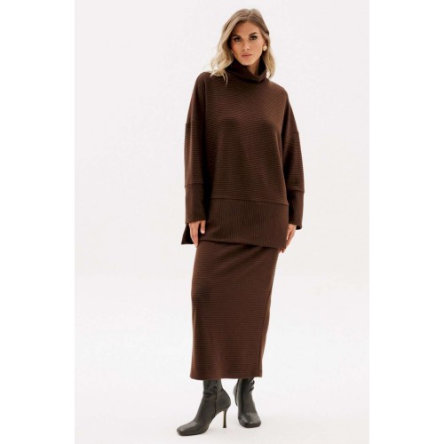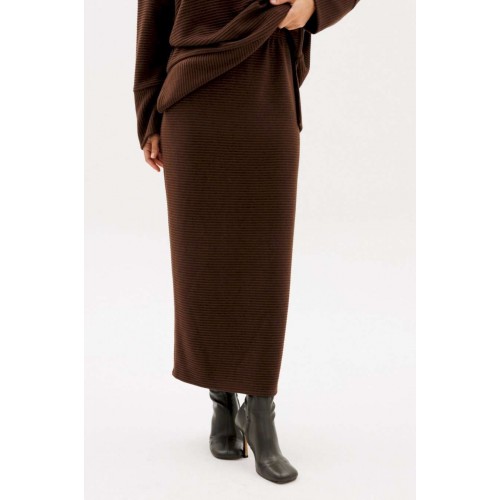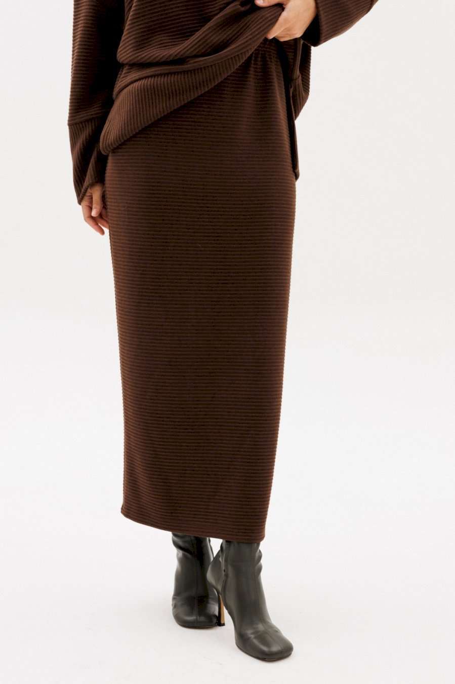 Юбка выполнена из трикотажного полотна в рубчик. Юбка прямого силуэта, длиной миди, на цельнокроеном поясе с эластичной тесьмой. Сзади разрез в среднем шве. Длина юбки: р. 44-48 - 92 см, р. 50-54 - 93 см