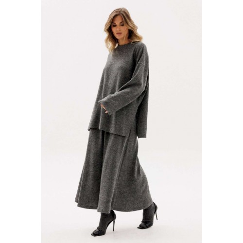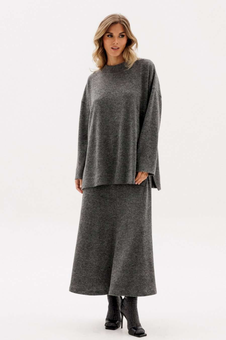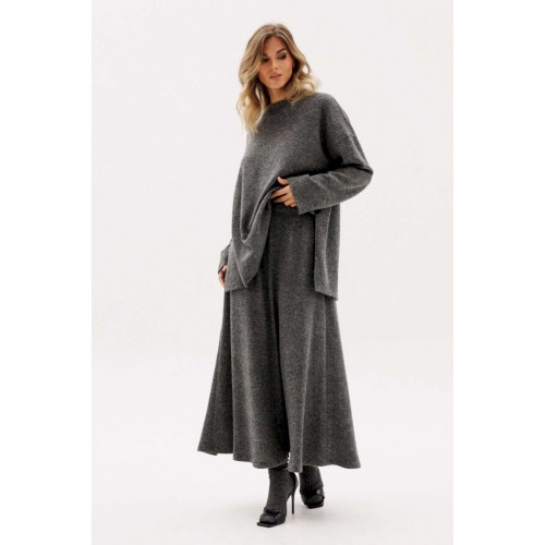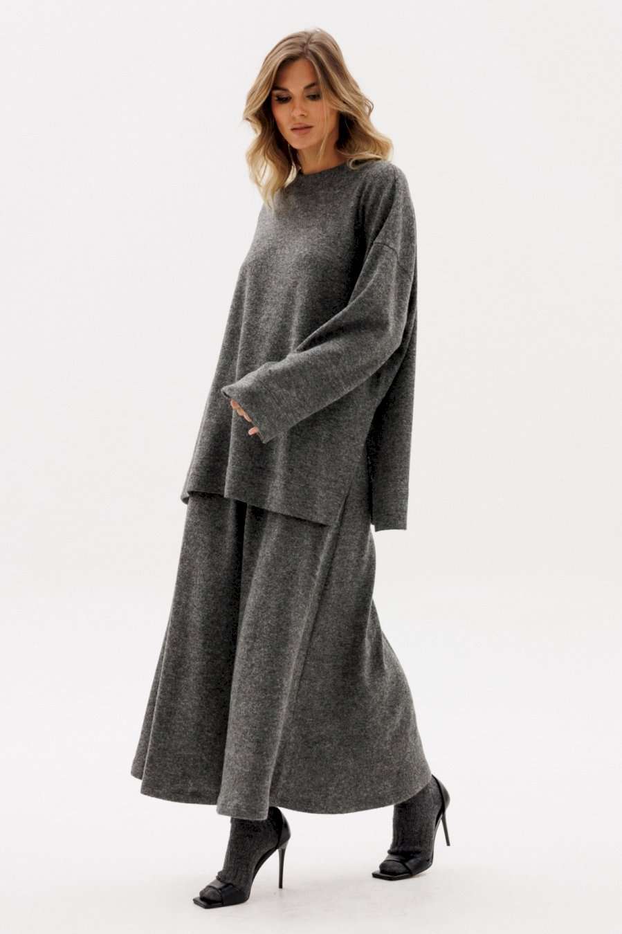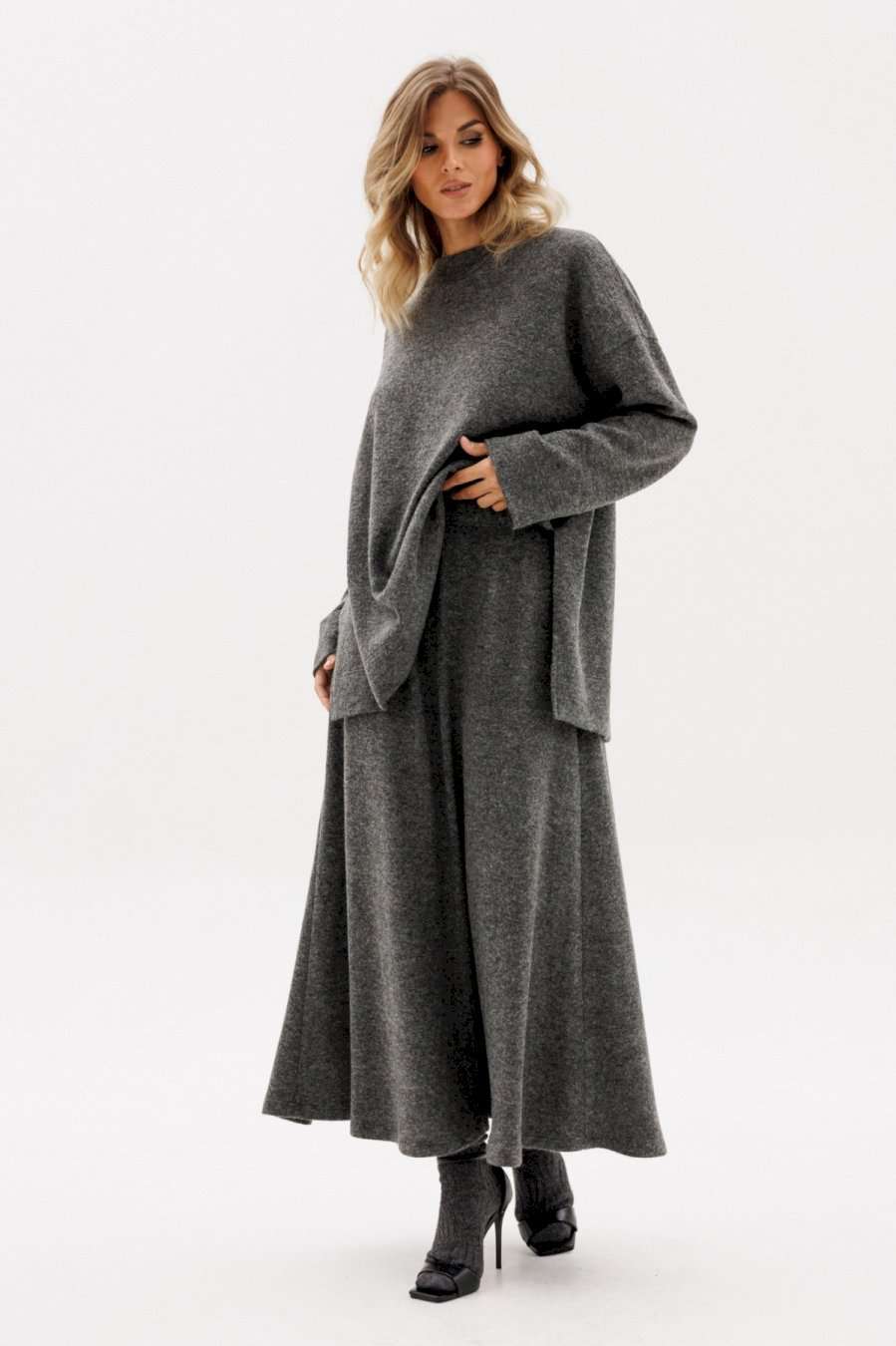Юбка выполнена из трикотажного полотна. Юбка-годе А-образного силуэта, длиной миди, на цельнокроеном поясе с эластичной тесьмой. Юбка состоит из четырех клиньев, юбка без подкладки. Длина юбки: р. 44-48 - 92 см, р. 50-54 - 93 см