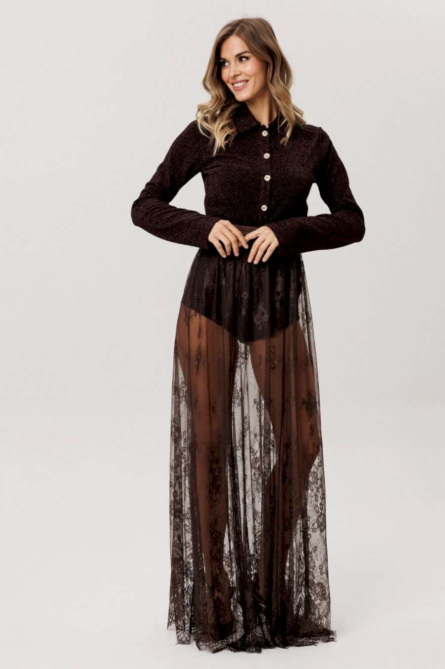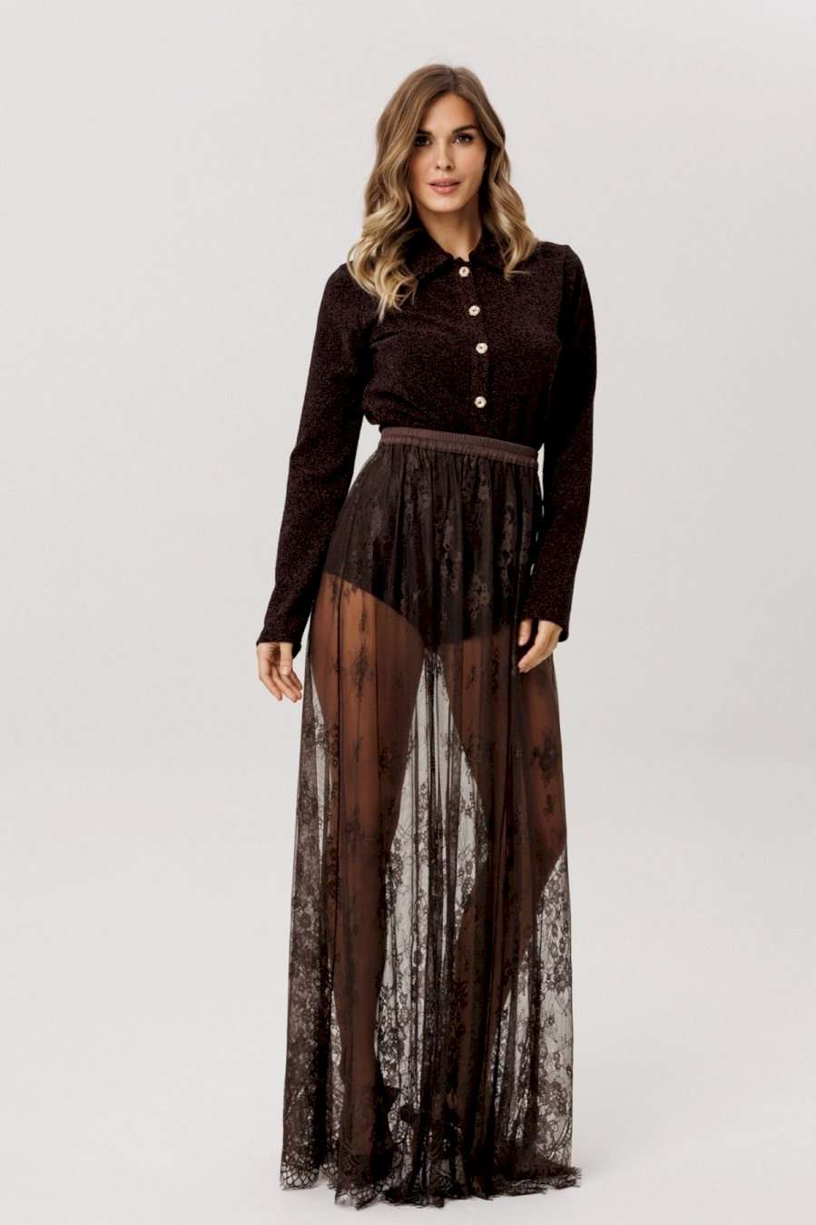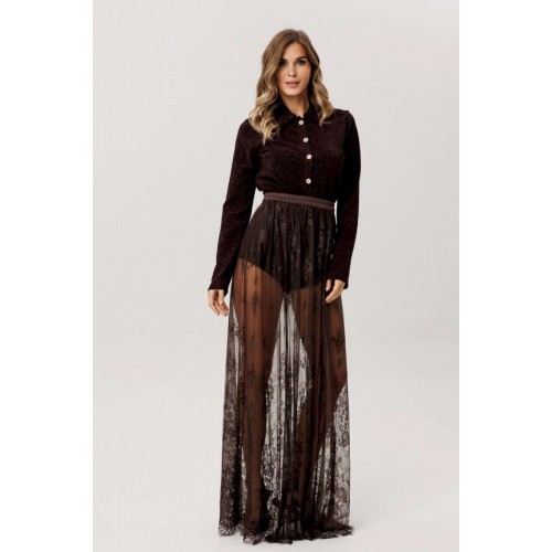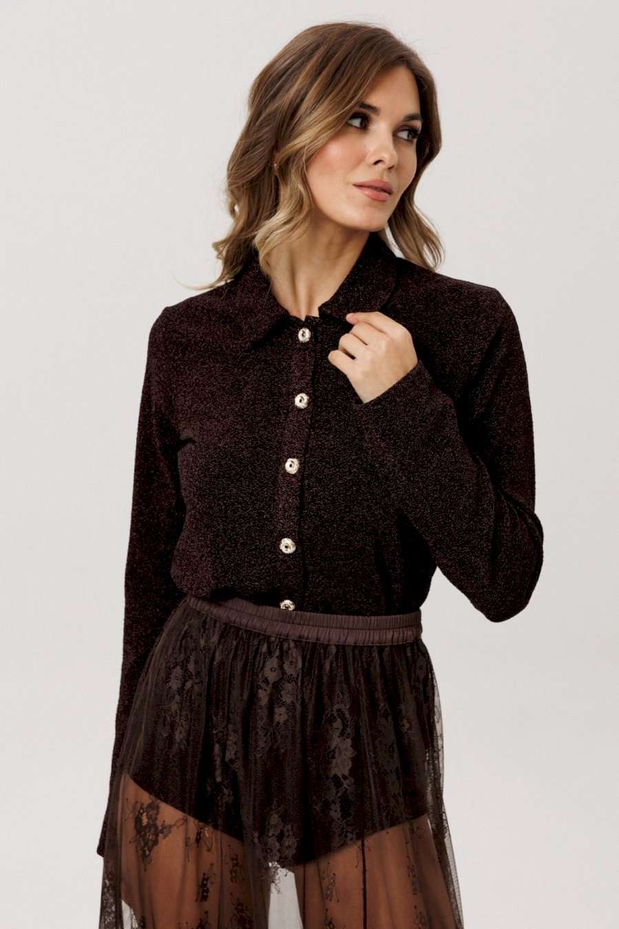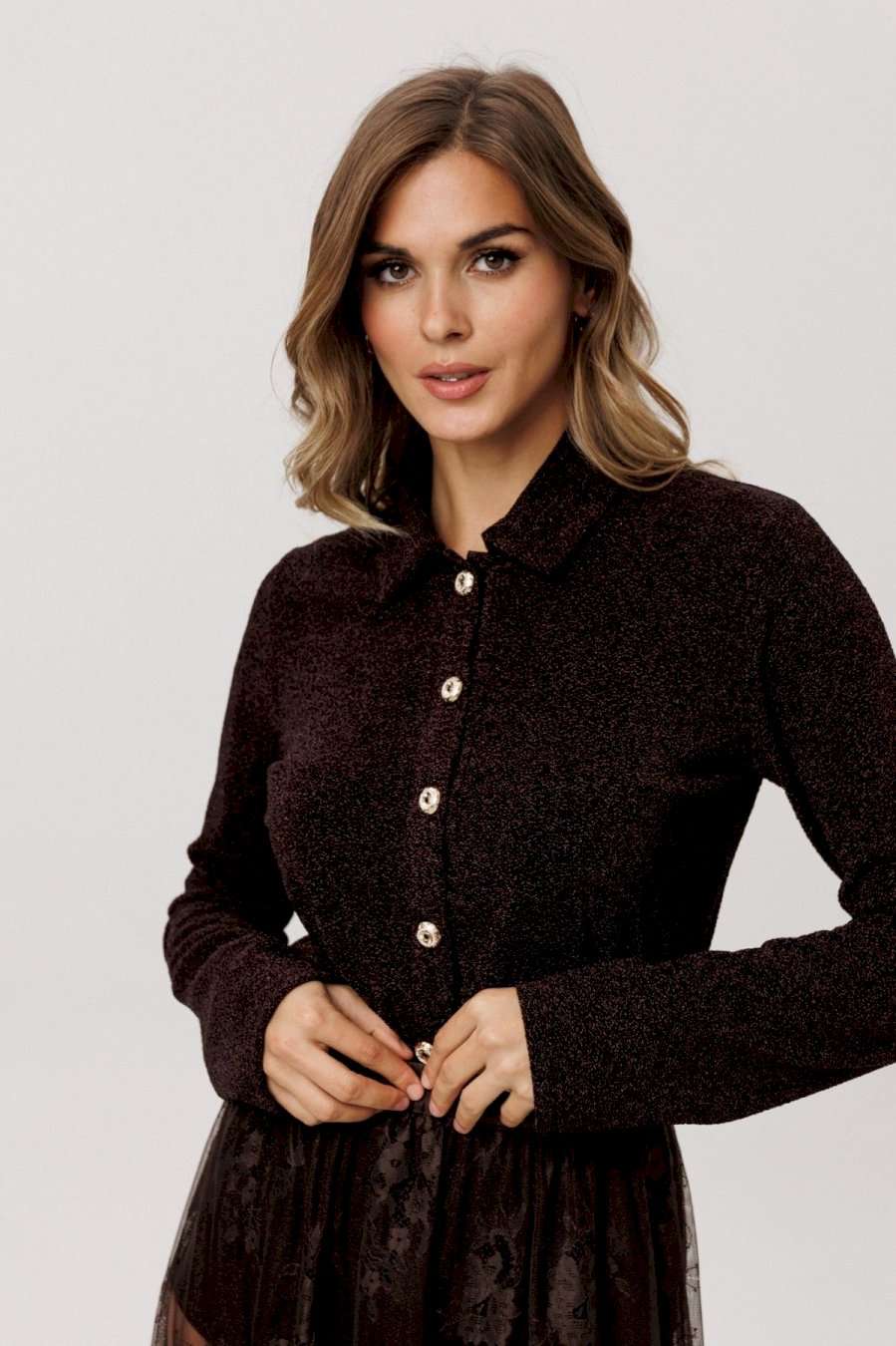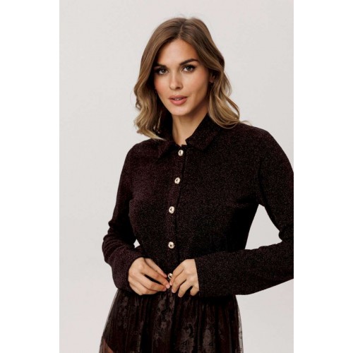 Джемпер выполнен из трикотажного полотна с блеском. Джемпер полуприлегающего силуэта, длиной выше линии бедер. Воротник стояче-отложной. Плечевой шов удлинен. Рукав втачного покроя, одношовный. Застежка по планке на петли и декоративные пуговицы. Длина джемпера: р. 42-46 -61 см, р. 48-52 -62,5 см. Длина рукава от горловины: р. 42-46 -61 см, р. 48-52 -62,5 см.