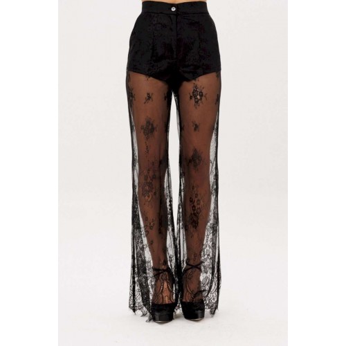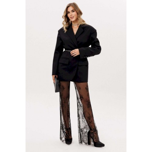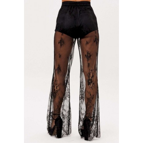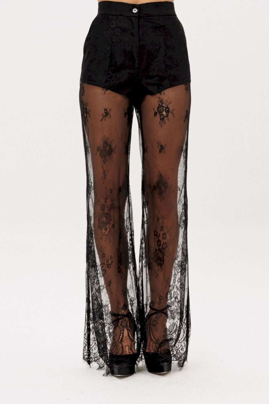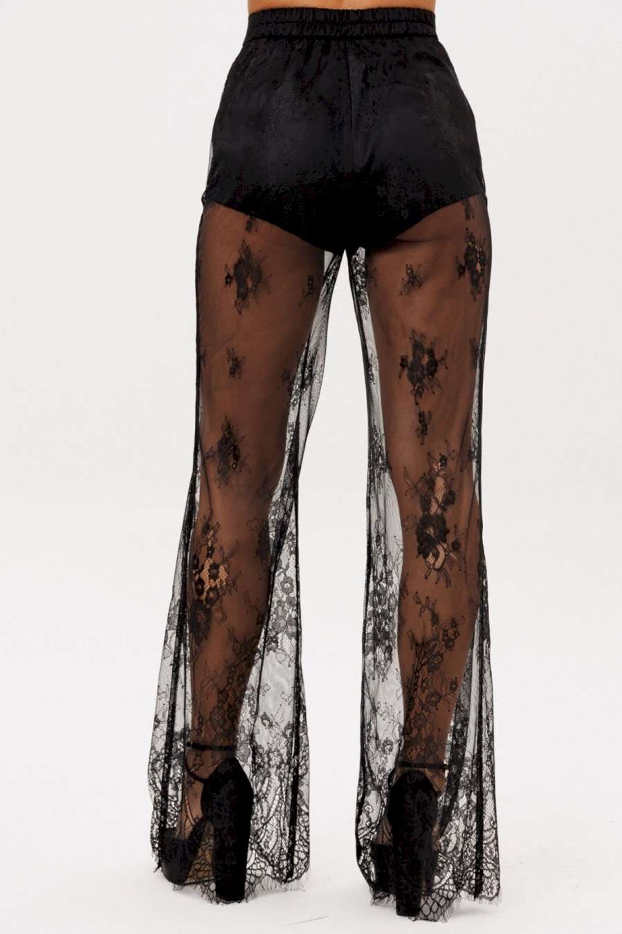 Брюки выполнены из гипюра. Брюки покроя \"\" клеш\"\", длиной в пол, на притачном поясе. Спереди застежка на пуговицу и молнию. По задней части пояса эластичная тесьма. По низу брюк фестоны. Брюки на отлетной по низу подкладке в виде мини-шорт из атласа. Длина брюк с поясом - 116 см 42 44 46 Длина сбоку 116 116 116 Объем по талии 66/74 70/78 74/82 Объем по бедрам 95 99 103 Ширина пояса 4 4 4