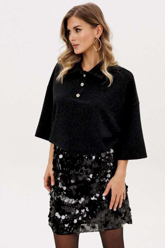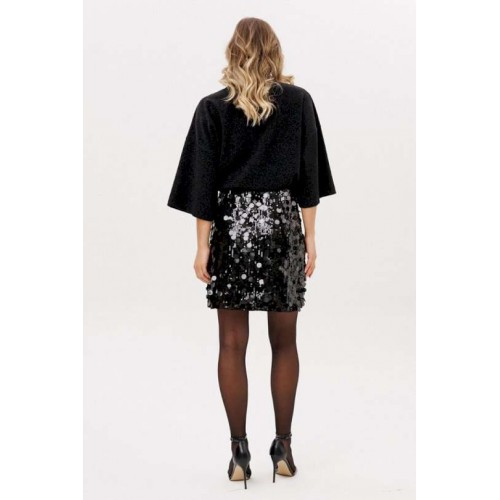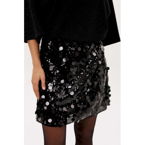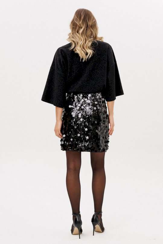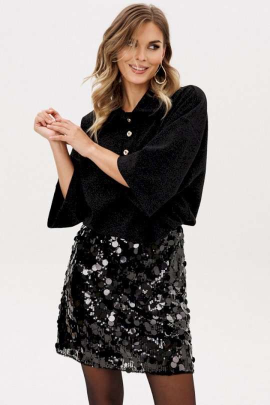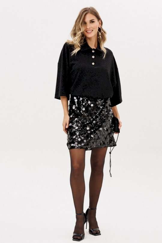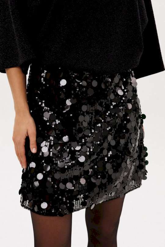 Юбка выполнена из трикотажного полотна в крупные пайетки на сетке. Юбка прямого силуэта, длиной выше колена. Юбка на притачном поясе из бархата, с эластичной тесьмой. Юбка на отлетной по низу подкладке. Длина юбки с поясом: р. 44-48 - 50,5 см, р. 50-54 - 52 см.