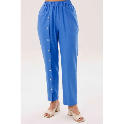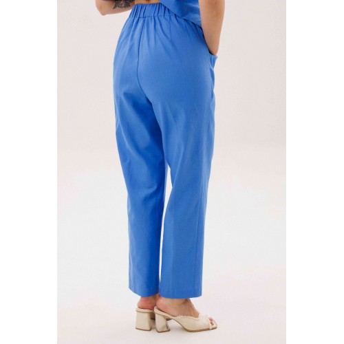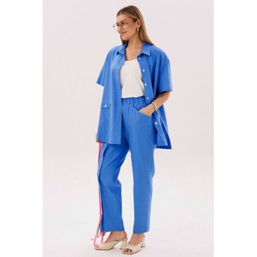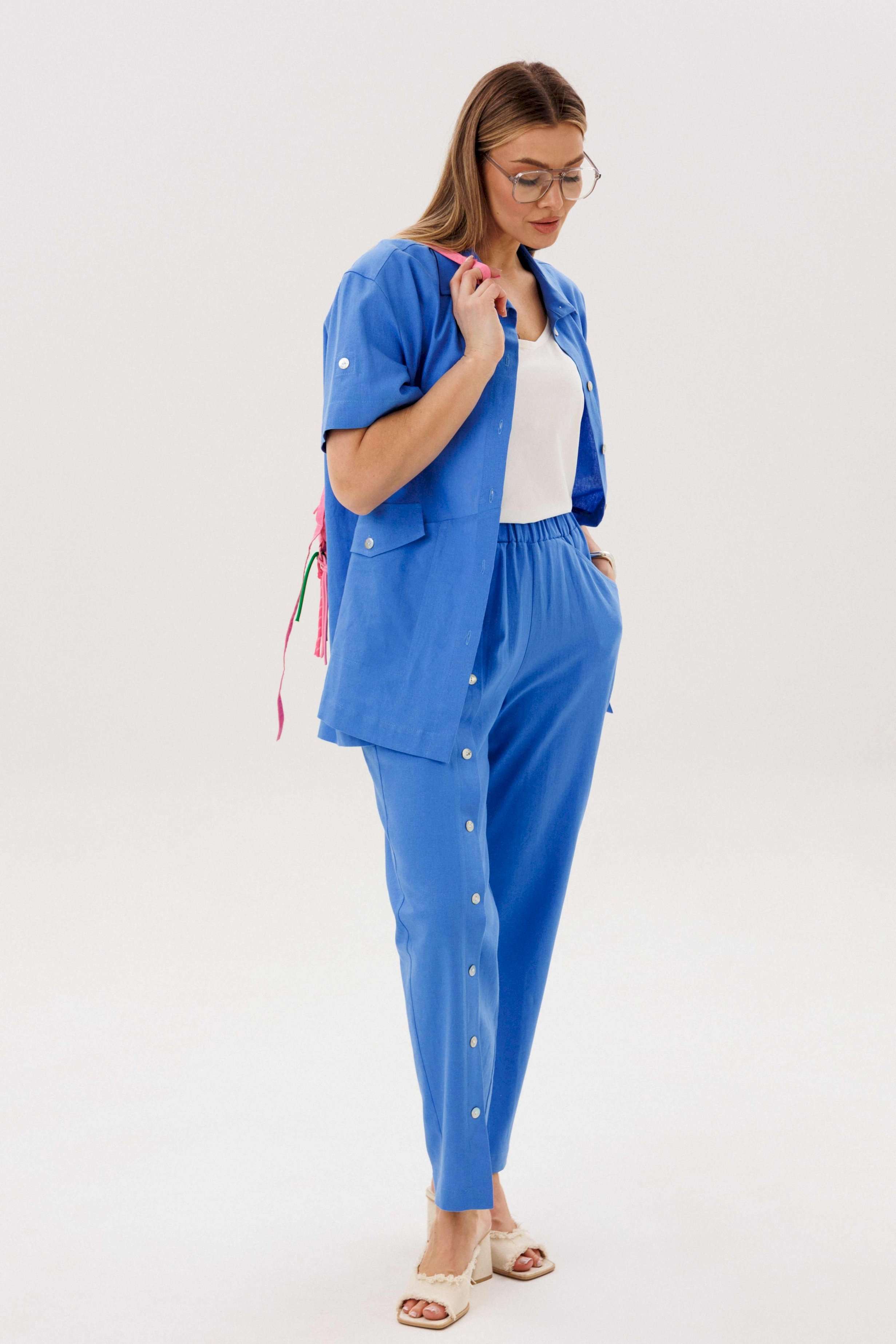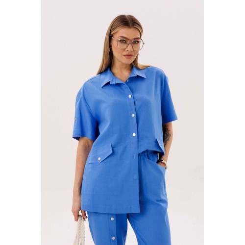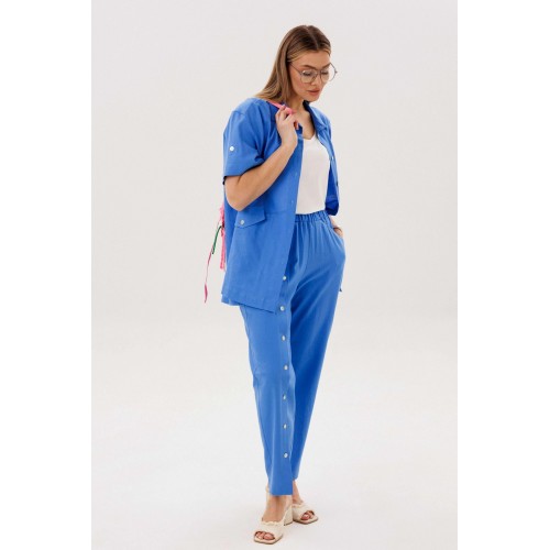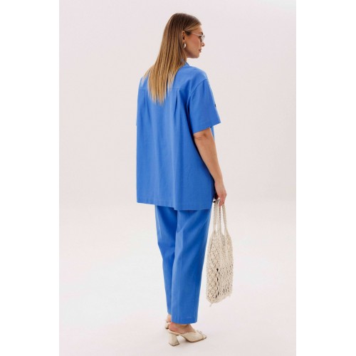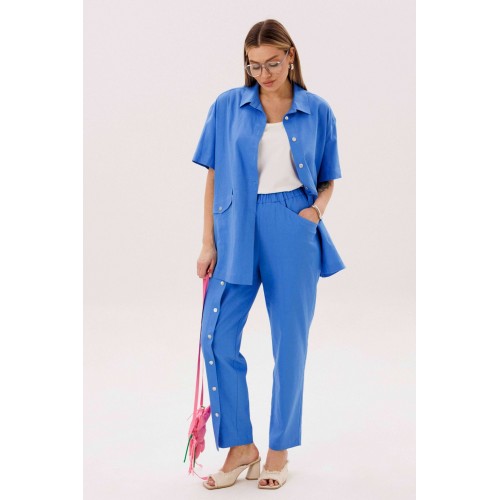 Главный тренд этого года и самый востребованный материал в жаркий сезон, конечно же лён. Модницы, которые ценят комфорт и универсальность, обязательно имеют в своем гардеробе вещи из этого уникального полотна. Брючный комплект всегда смотрится эффектно и дорого. Свободная, упрямлённая рубашка и брюки в расслабленном стиле. Покрой - рубашечный, воротник классический рубашечный, застёжка центральная. Полочка с диагональным членением и карманом с клапаном. Спинка с отрезной кокеткой и мягкими складками. В боковых швах - разрезы. Рукав с отделочной пуговицей. Брюки свободные, слегка зауженные к низу, на эластичном поясе с наклонными карманами. Правая передняя половинка брюк со сквозной шлицей и пуговицами. Длина брюк около 102 см. Длина рубашки около 77 см. Длина рукава около 20 см.