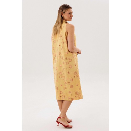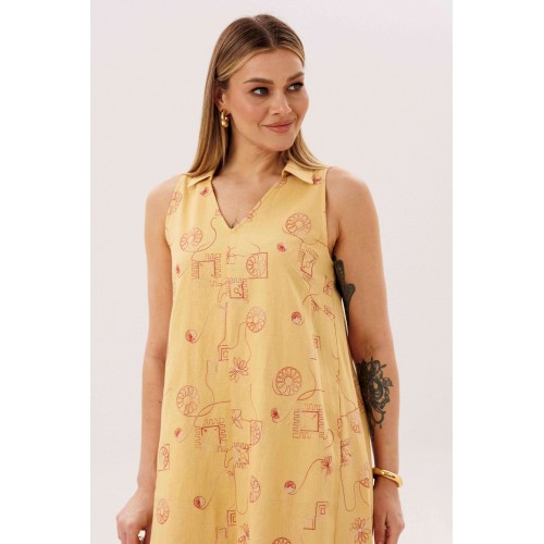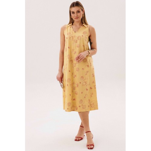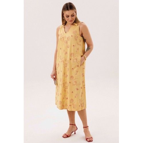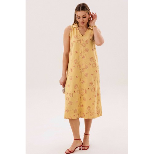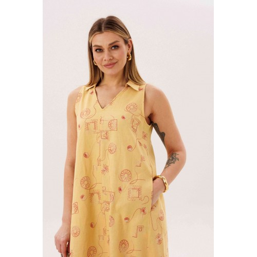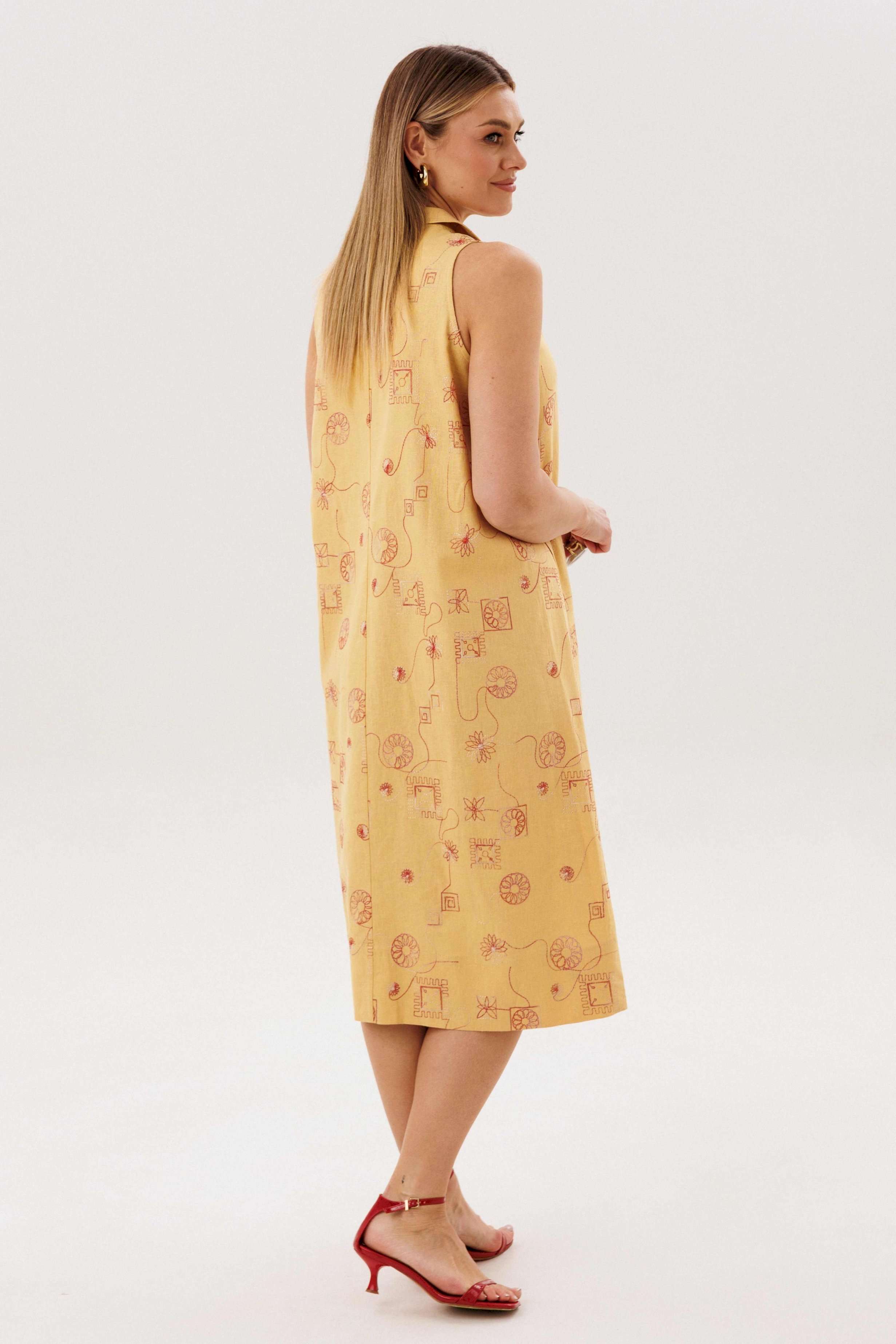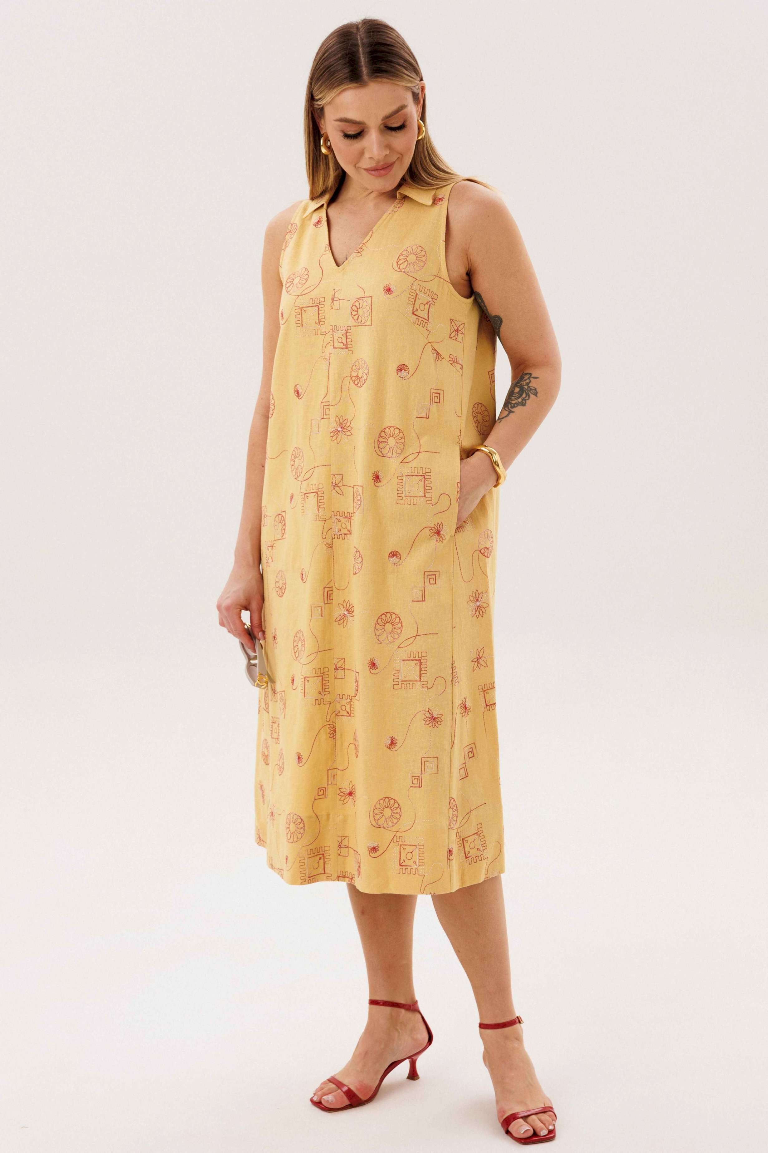 Льняное платье-это про натуральность и комфорт. Оно идеально для жарких дней, выглядит обворожительно и наряду с этим крайне удобно и красиво. Свободный А-силуэт, английская пройма, V-образный вырез, воротник, фигурная линия низа. Полочка с центральным швом, боковыми рельефами с фигурными карманами. Спинка со средним швом, боковыми рельефами. Особую привлекательность модели придает широкая подгибка низа. Длина платья около 117 см.