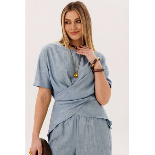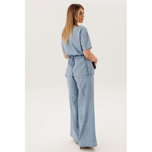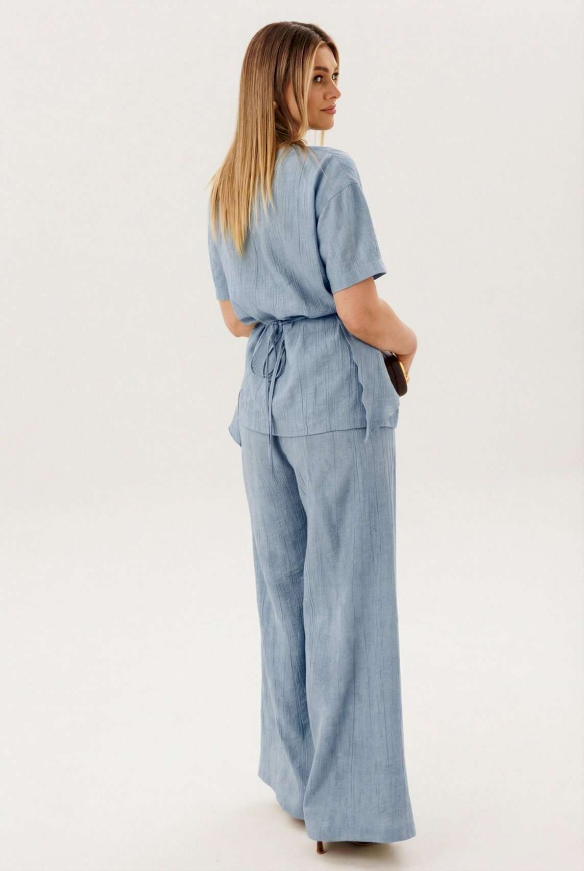 Этот стильный костюм — воплощение летней элегантности и комфорта. Модель выполнена из вискозной ткани с эффектом жатки, что не только актуально в этом сезоне, но и крайне практично: одежда меньше мнется и сохраняет безупречный вид в течение всего дня. Широкие, длинные, струящиеся брюки-палаццо - одна из самых актуальных моделей брюк. Они обладают свойством добавлять нотку расслабленного шика любому образу, и, несомненно, они особенно эффектно выглядят в нарядных комплектах. Брюки свободные, на притачном эластичном поясе. Длина брюк около 108 см. Оригинальная блуза с драпировкой мягко подчеркивает талию, создавая женственный и притягательный силуэт. Свободный силуэт, рубашечный покрой, рукав короткий, эффектная драпировка по переду и кокетливый пояс-завязка по спинке. Длина блузы около 80 см.