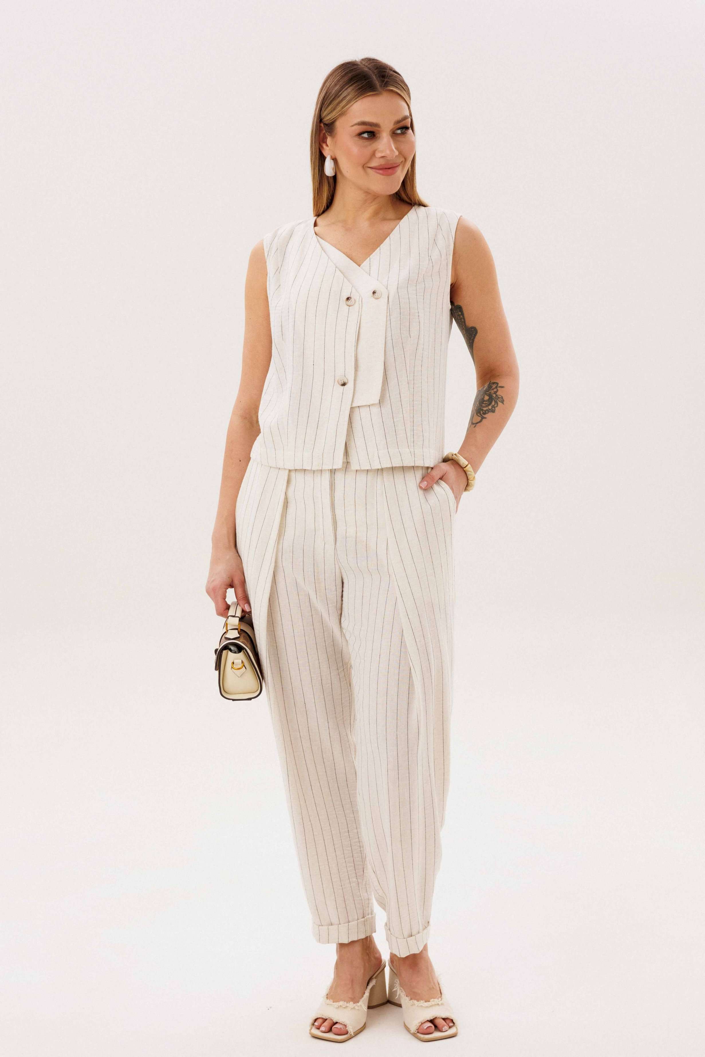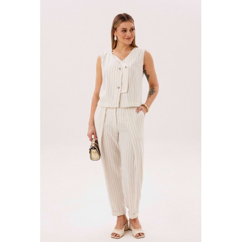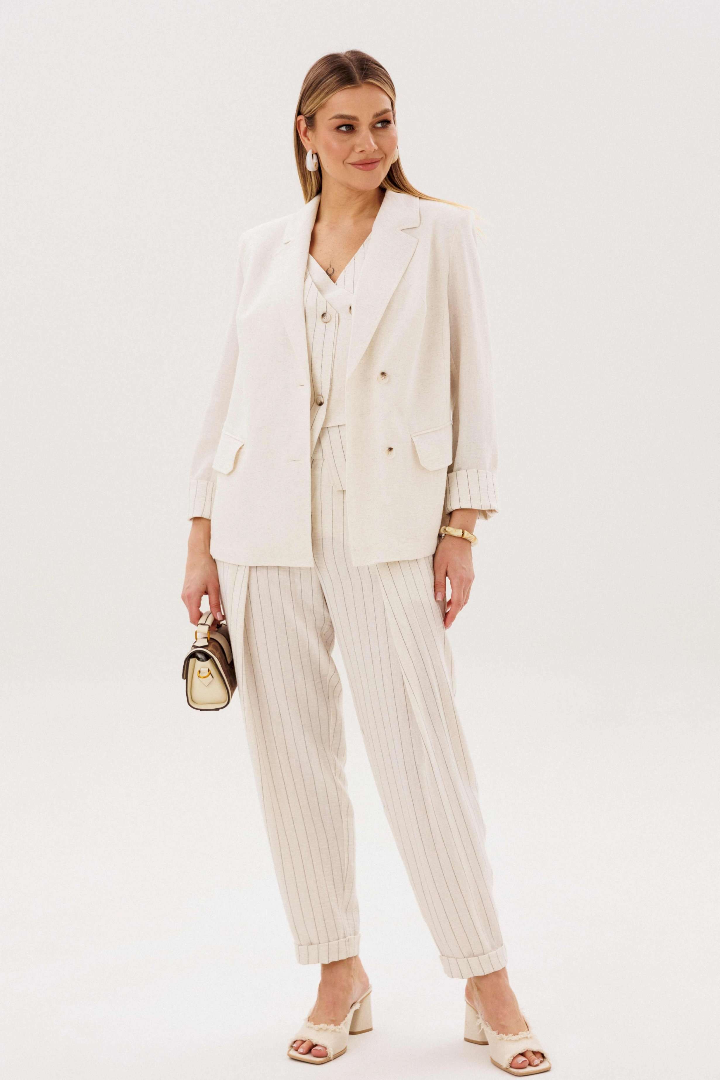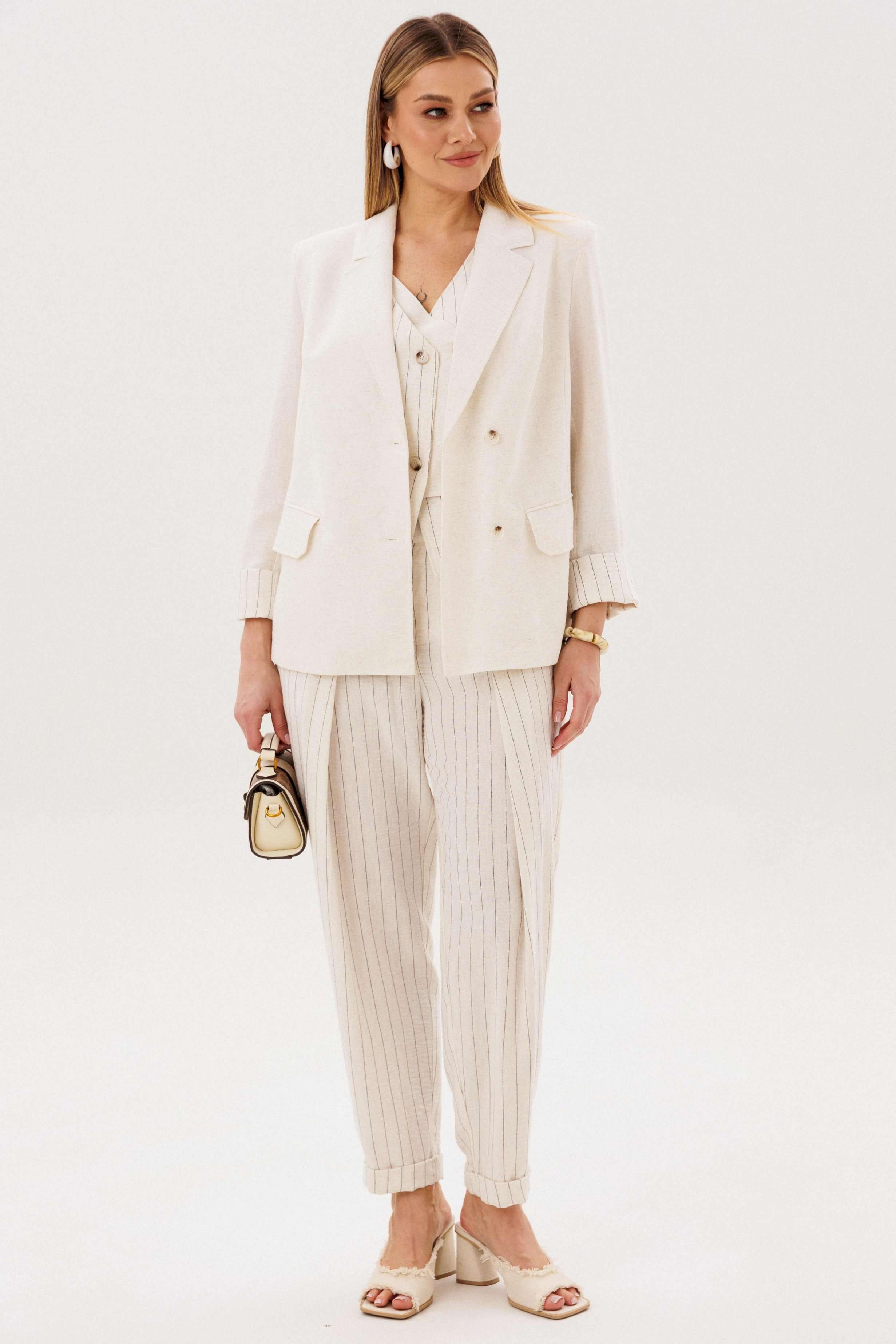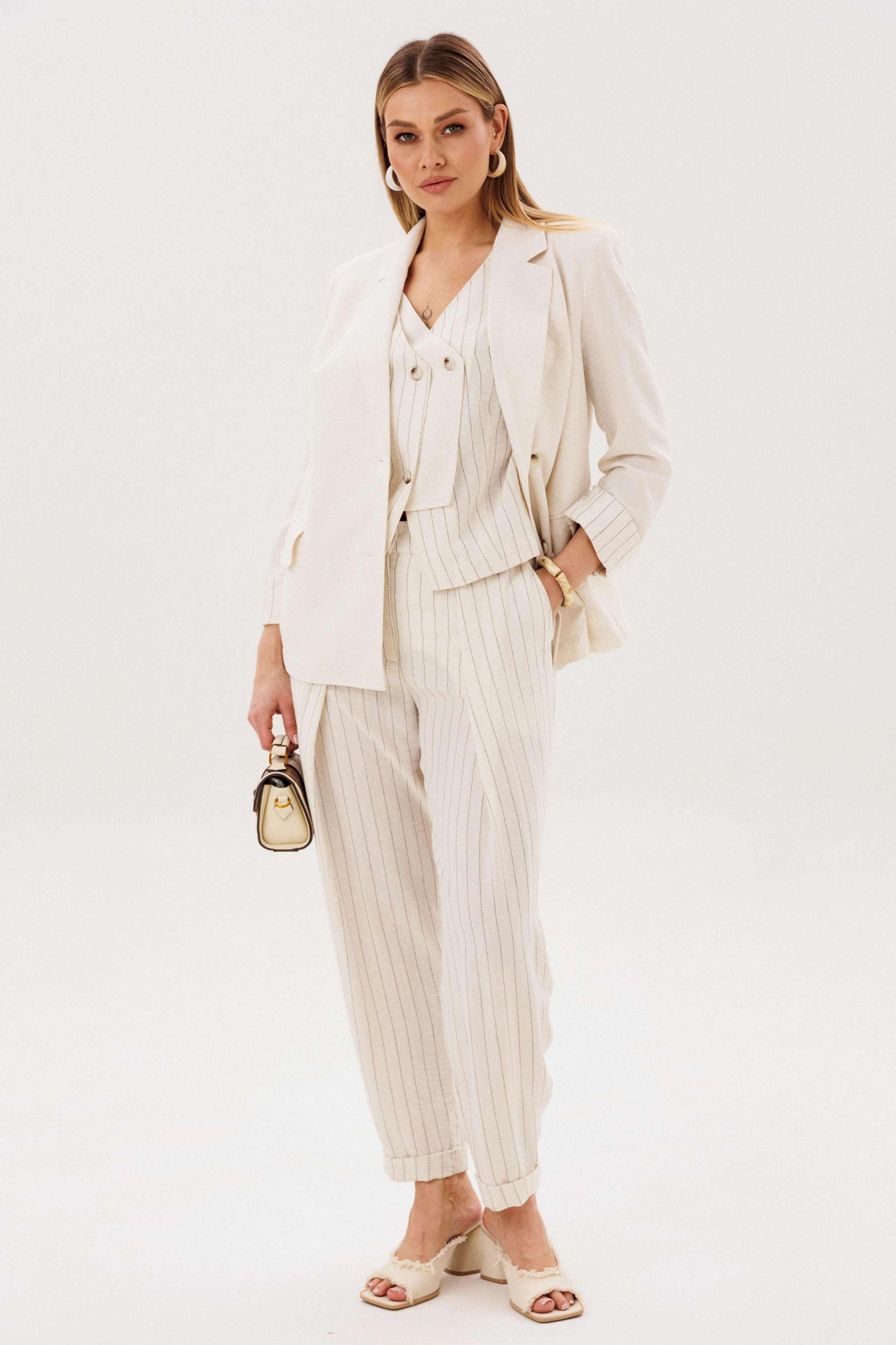 Элегантный брючный комплект-тройка — современная интерпретация классики с акцентом на лёгкость и утончённость. Идеальный выбор для делового гардероба и стильных городских образов. В комплект входит: Жилет в тонкую вертикальную полоску с V-образным вырезом Брюки в полоску с комфортной посадкой и зауженным силуэтом Лаконичный жакет из однотонного смесового полотна со льном Жилет и брюки выполнены в изящной полоске, которая визуально вытягивает силуэт и придаёт образу стройность. Жилет аккуратно подчёркивает линию талии, добавляя образу женственности и структурности. Однотонный жакет из смесовой ткани с добавлением льна гармонично дополняет комплект. Лёгкий, дышащий материал обеспечивает комфорт даже в тёплую погоду, а минималистичный крой делает образ сдержанным и элегантным. Преимущества комплекта: актуальный формат «тройка» натуральные волокна в составе ткани визуально вытягивающая полоска универсальность: можно носить как комплектом, так и по отдельности Комплект легко адаптируется под разные стили: с обувью на каблуке — для деловых встреч и мероприятий, с более расслабленными аксессуарами — для повседневных образов. Идеальное сочетание классики, комфорта и современного дизайна.