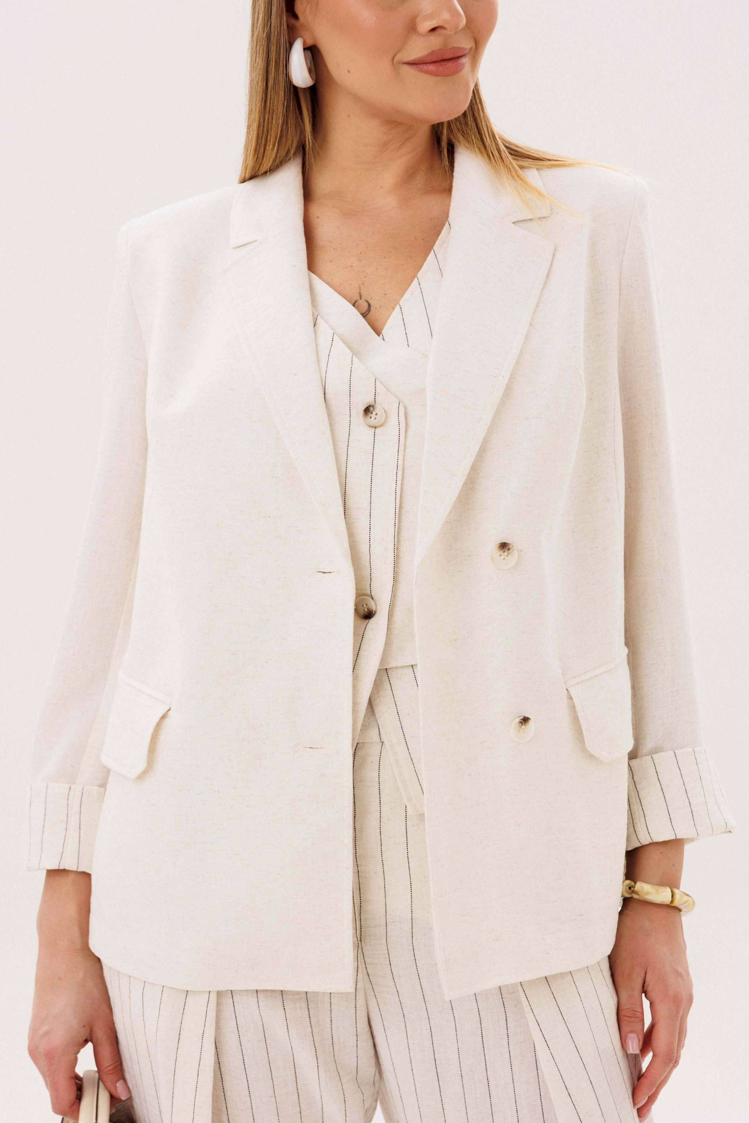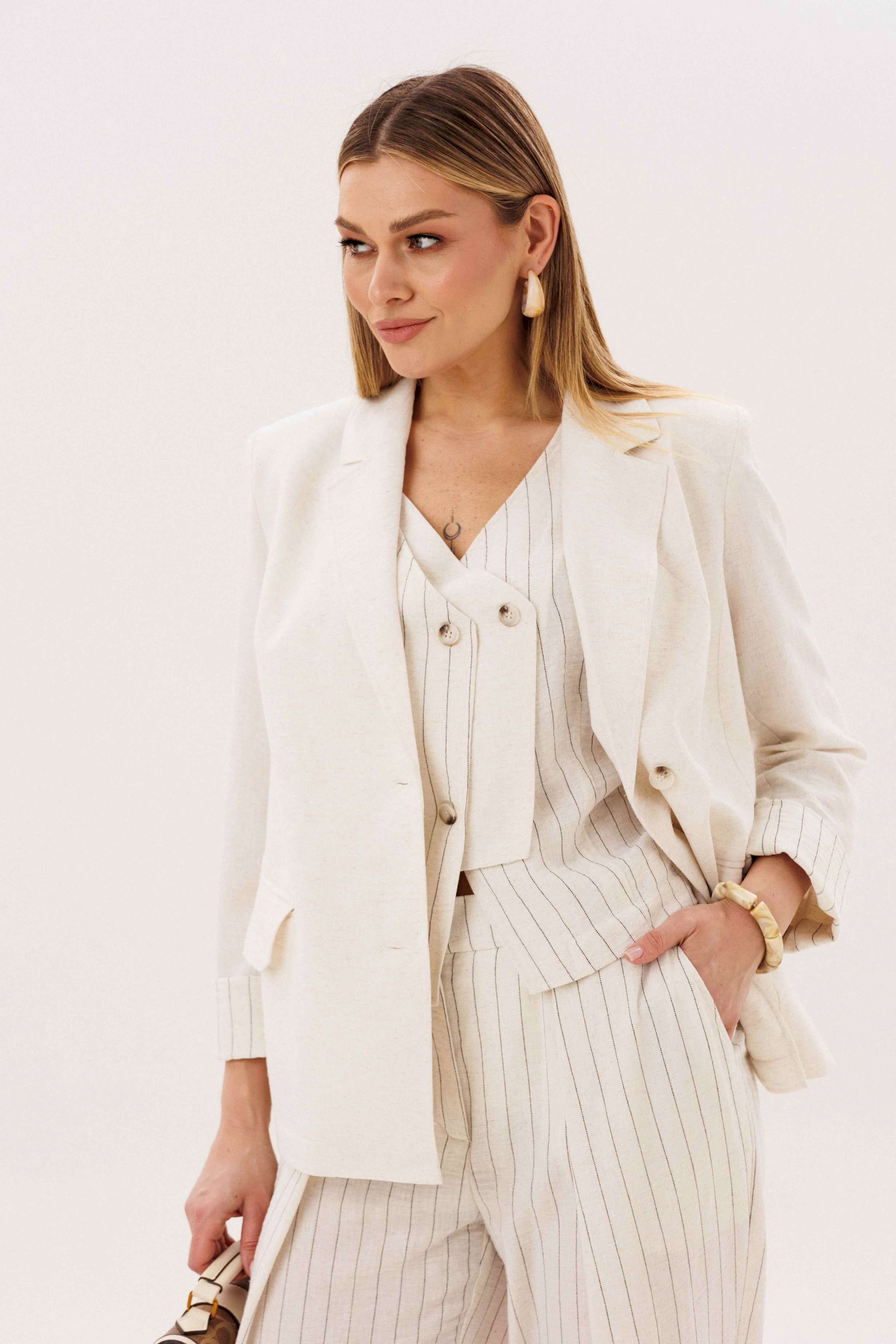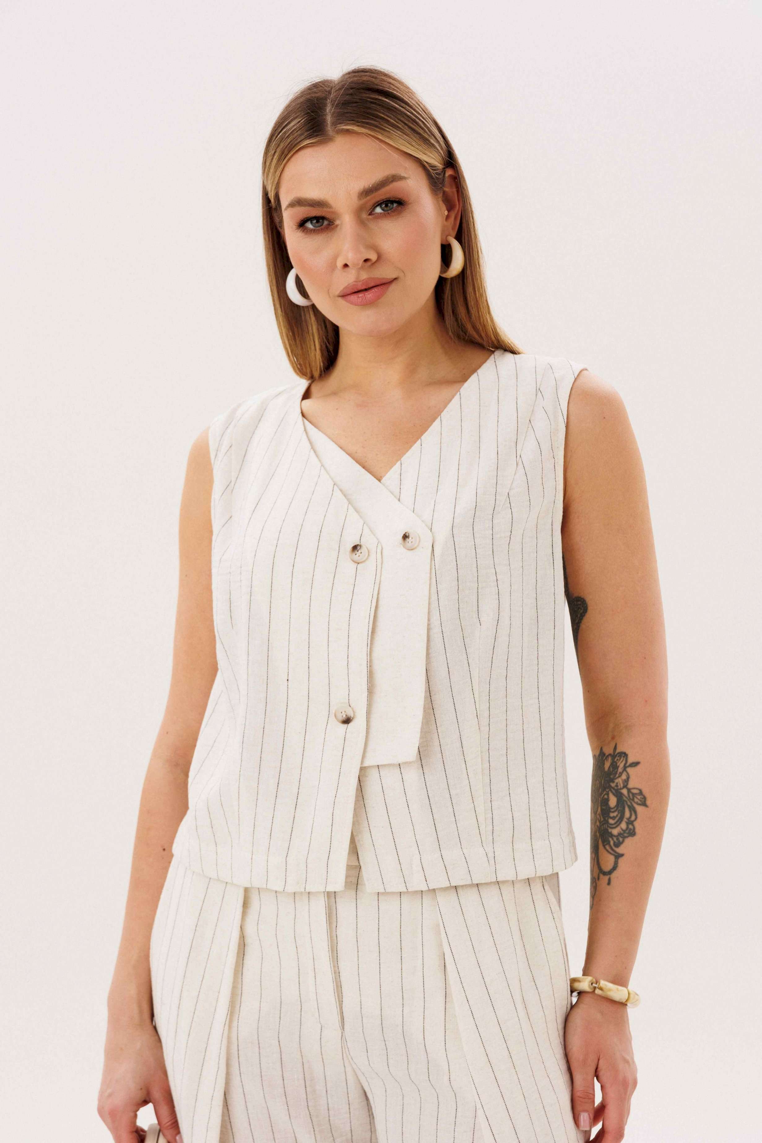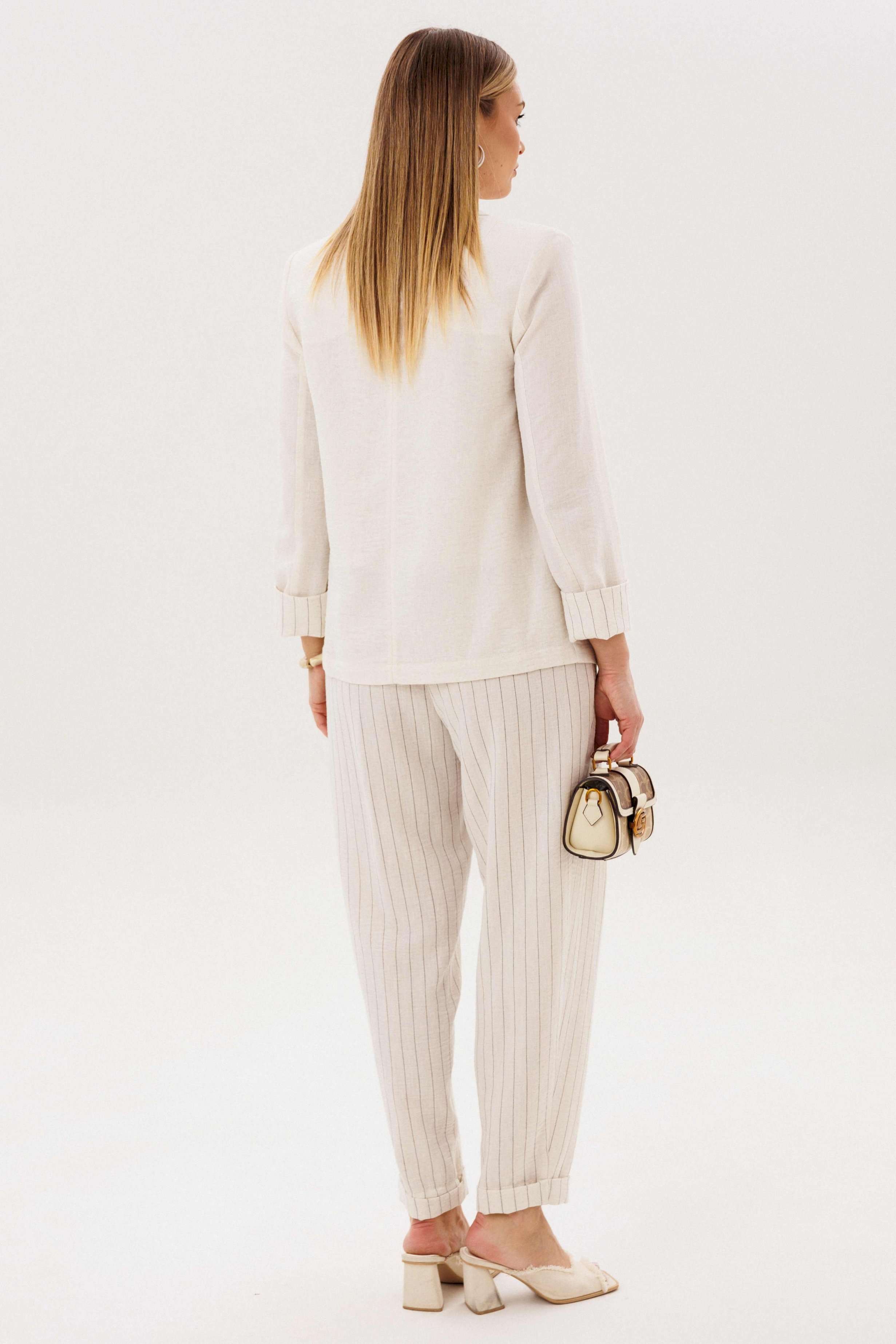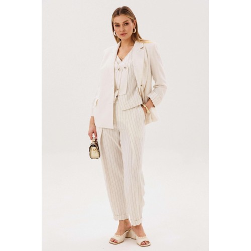 Элегантный брючный комплект-тройка — современная интерпретация классики с акцентом на лёгкость и утончённость. Идеальный выбор для делового гардероба и стильных городских образов. В комплект входит: Жилет в тонкую вертикальную полоску с V-образным вырезом Брюки в полоску с комфортной посадкой и зауженным силуэтом Лаконичный жакет из однотонного смесового полотна со льном Жилет и брюки выполнены в изящной полоске, которая визуально вытягивает силуэт и придаёт образу стройность. Жилет аккуратно подчёркивает линию талии, добавляя образу женственности и структурности. Однотонный жакет из смесовой ткани с добавлением льна гармонично дополняет комплект. Лёгкий, дышащий материал обеспечивает комфорт даже в тёплую погоду, а минималистичный крой делает образ сдержанным и элегантным. Преимущества комплекта: актуальный формат «тройка» натуральные волокна в составе ткани визуально вытягивающая полоска универсальность: можно носить как комплектом, так и по отдельности Комплект легко адаптируется под разные стили: с обувью на каблуке — для деловых встреч и мероприятий, с более расслабленными аксессуарами — для повседневных образов. Идеальное сочетание классики, комфорта и современного дизайна.