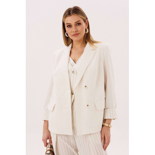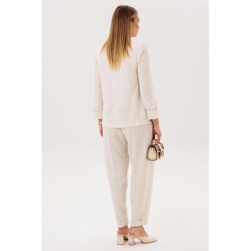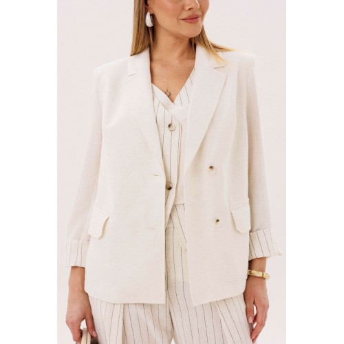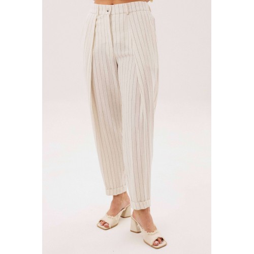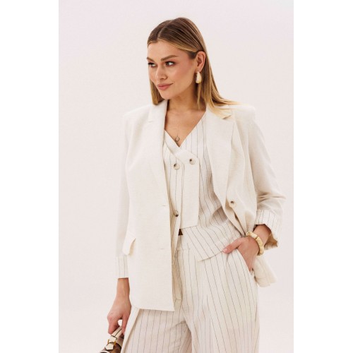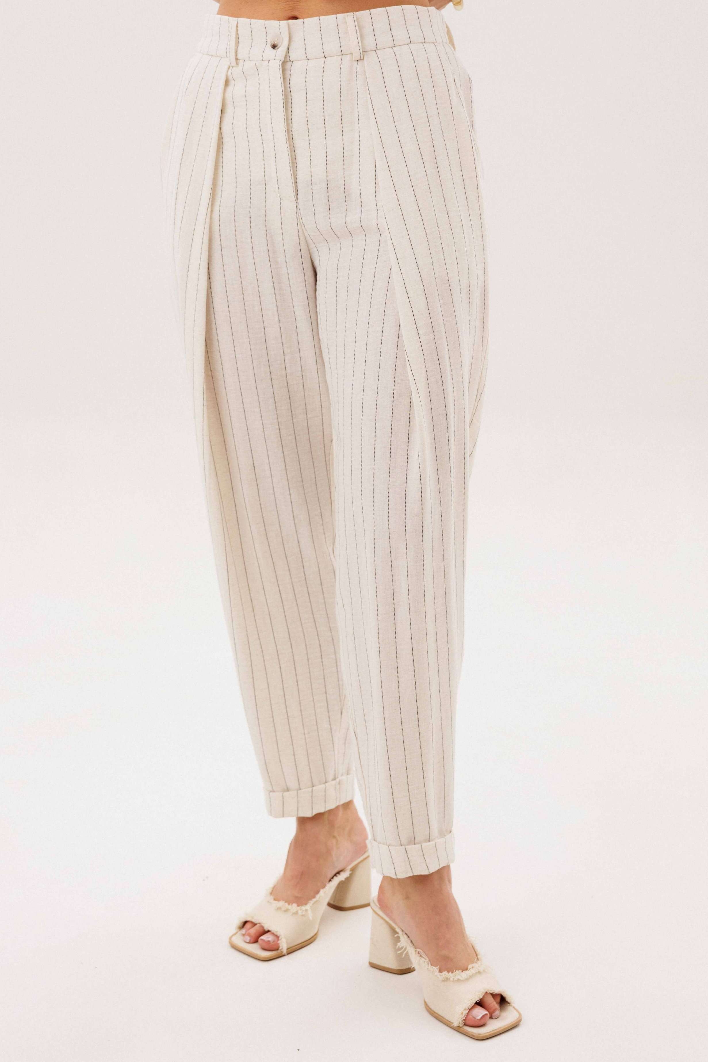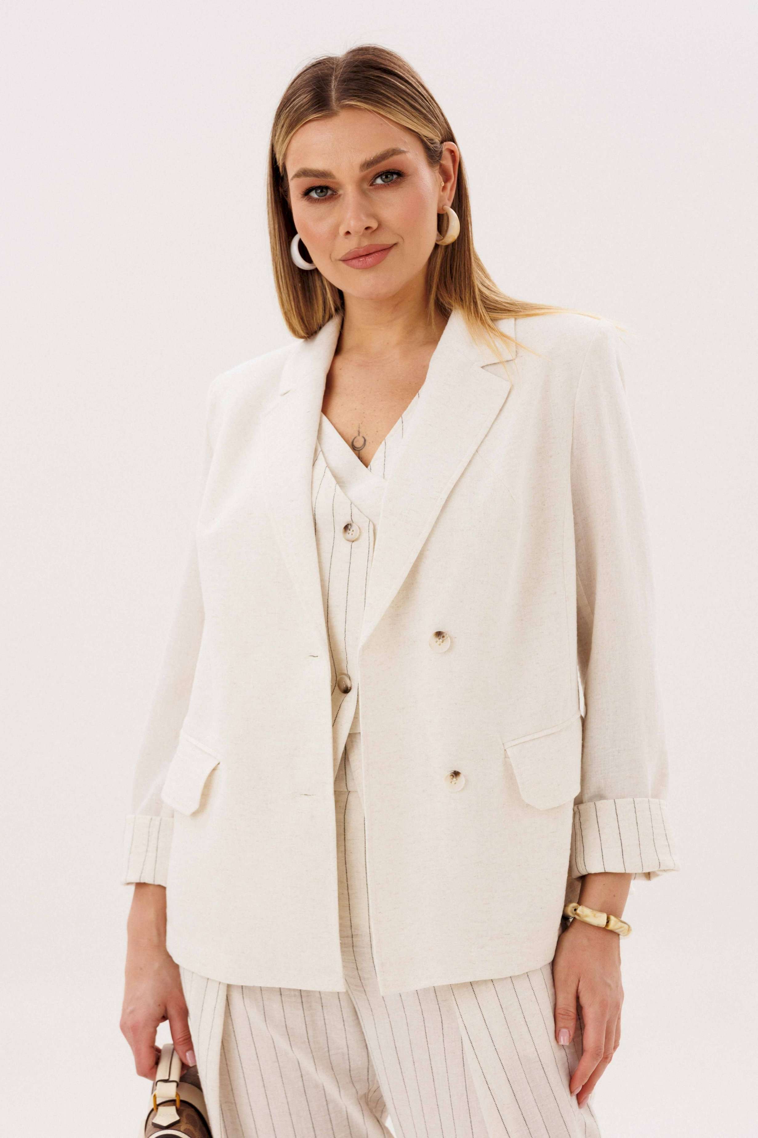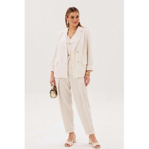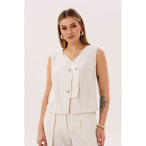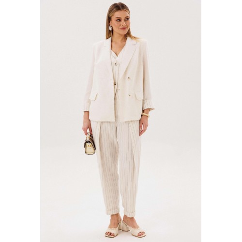 Элегантный брючный комплект-тройка — современная интерпретация классики с акцентом на лёгкость и утончённость. Идеальный выбор для делового гардероба и стильных городских образов. В комплект входит: Жилет в тонкую вертикальную полоску с V-образным вырезом Брюки в полоску с комфортной посадкой и зауженным силуэтом Лаконичный жакет из однотонного смесового полотна со льном Жилет и брюки выполнены в изящной полоске, которая визуально вытягивает силуэт и придаёт образу стройность. Жилет аккуратно подчёркивает линию талии, добавляя образу женственности и структурности. Однотонный жакет из смесовой ткани с добавлением льна гармонично дополняет комплект. Лёгкий, дышащий материал обеспечивает комфорт даже в тёплую погоду, а минималистичный крой делает образ сдержанным и элегантным. Преимущества комплекта: актуальный формат «тройка» натуральные волокна в составе ткани визуально вытягивающая полоска универсальность: можно носить как комплектом, так и по отдельности Комплект легко адаптируется под разные стили: с обувью на каблуке — для деловых встреч и мероприятий, с более расслабленными аксессуарами — для повседневных образов. Идеальное сочетание классики, комфорта и современного дизайна.