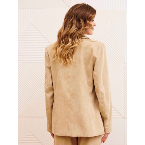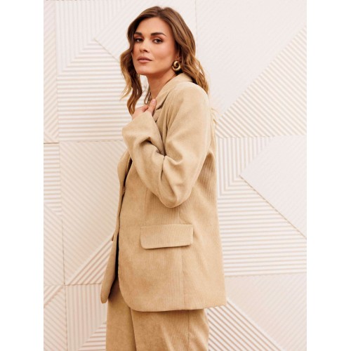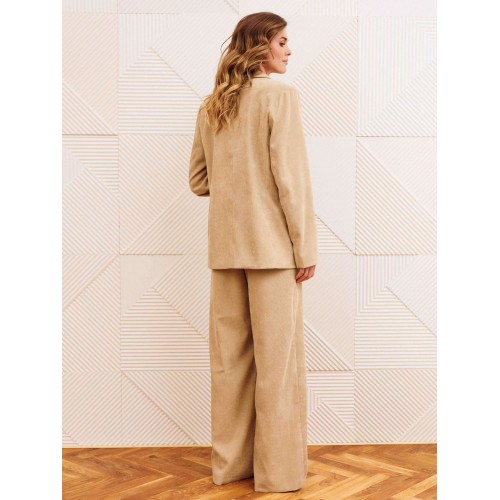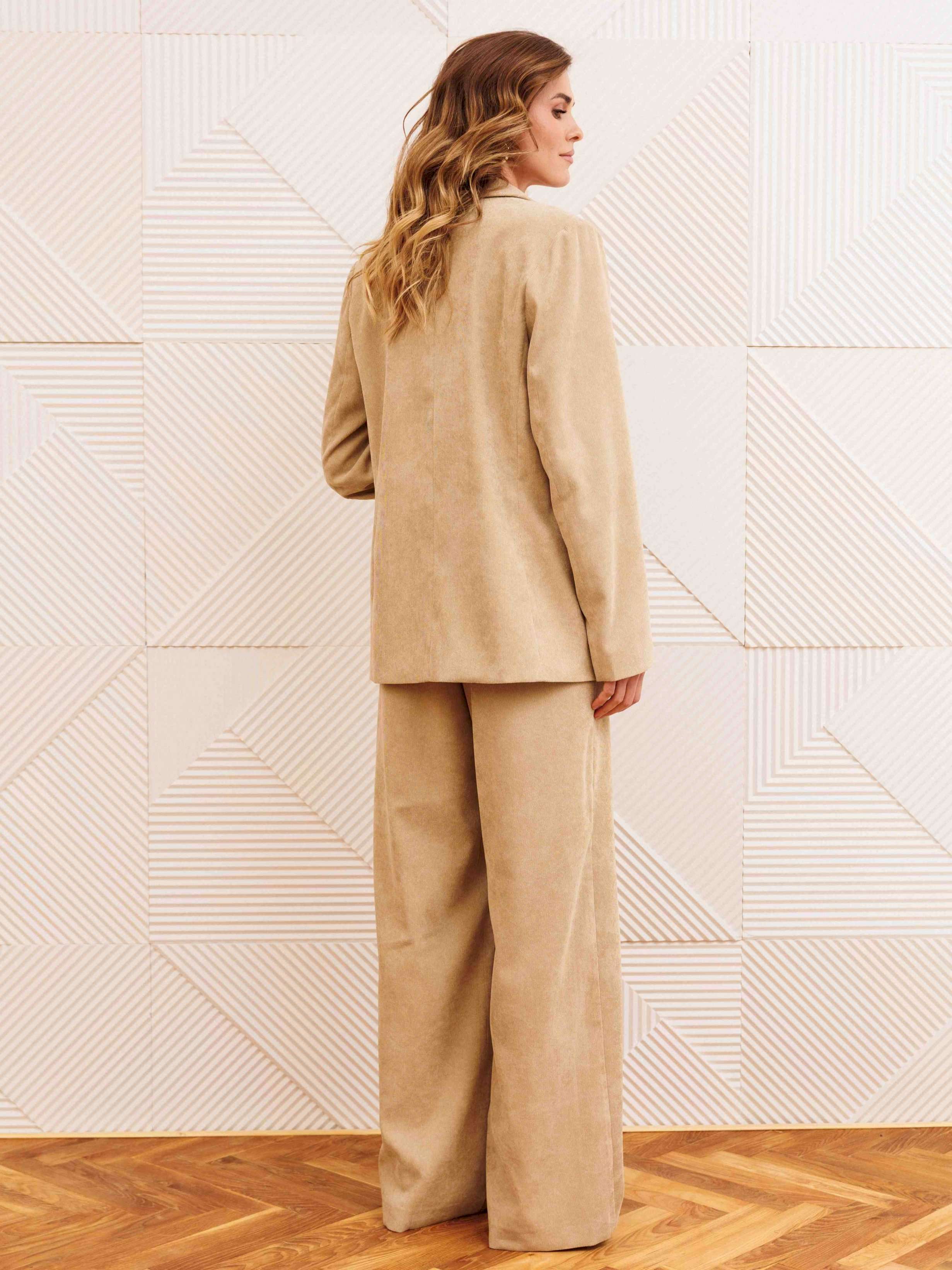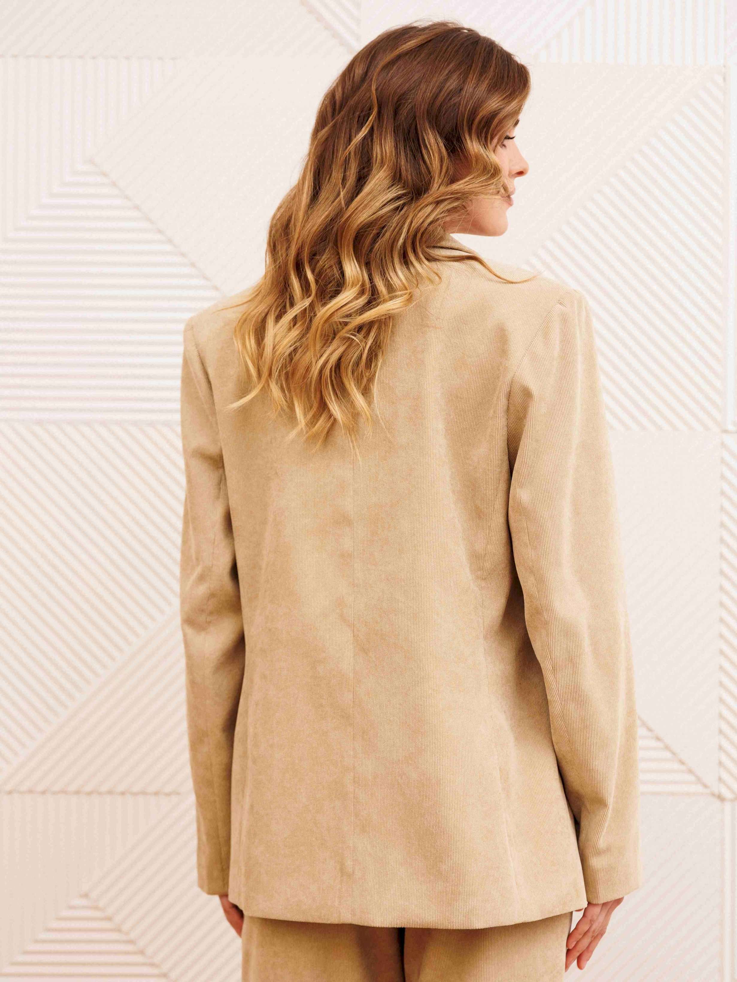 Жакет полуприлегающего силуэта из мягкой вельветовыой ткани. Застежка однобортная на две пуговицы, воротник пиджачного типа. Перед с талиевой вытачкой, рельефом и декоративным клапаном. Спинка с рельефами из проймы и средним швом. Рукав втачной двухшовный. Жакет на подкладке. Длина жакета - 68 см, длина рукава жакета - 60 см.