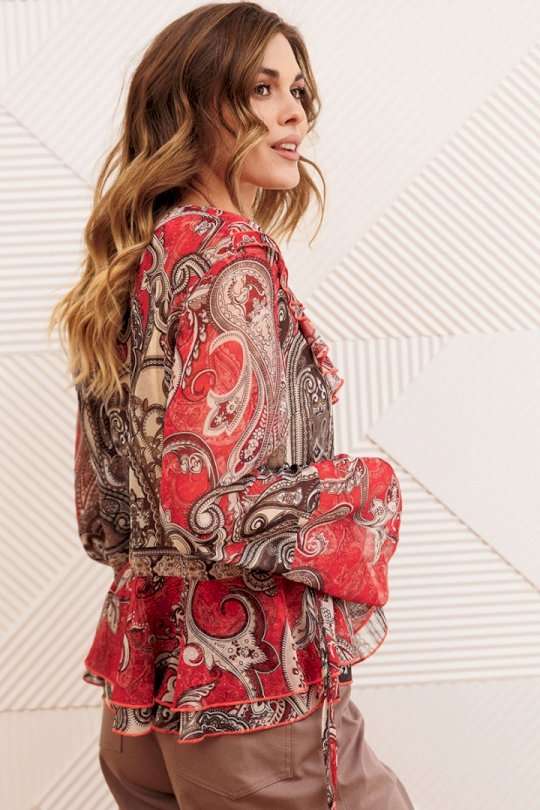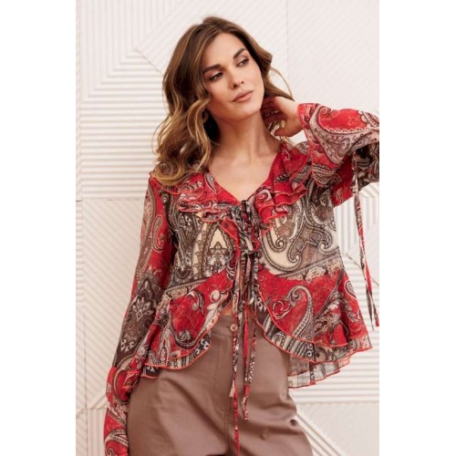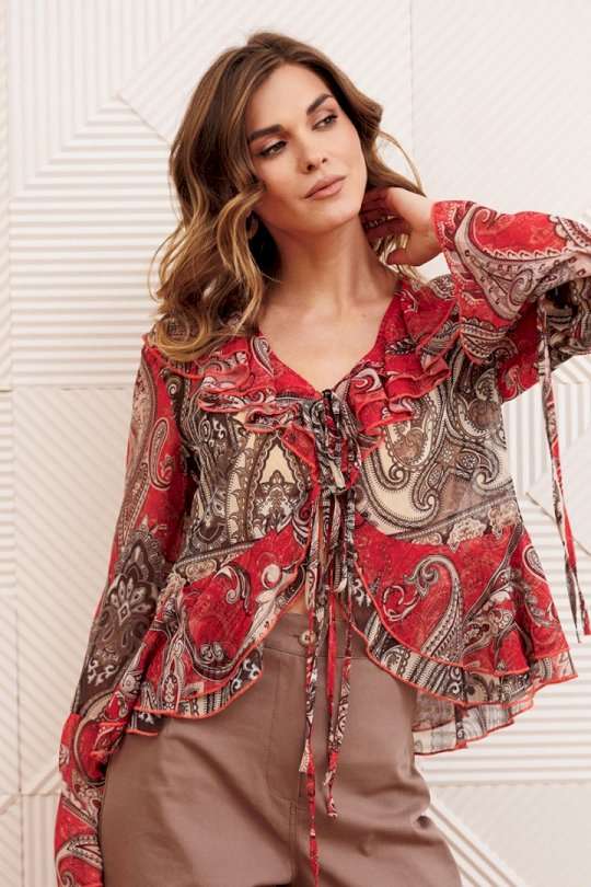 Блузка свободного силуэта в стиле бохо. Перед с нагрудными вытачками. Вдоль горловины, вдоль борта с переходом на спинку двойные рюши. Блузка спереди на завязках. Рукав втачной одношовный. Низ рукава с притачной рюшей и завязками. Длина блузки- 58 см, длина рукава блузки - 62 см.
