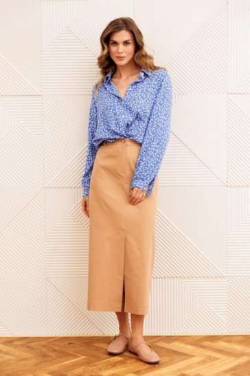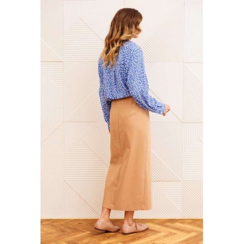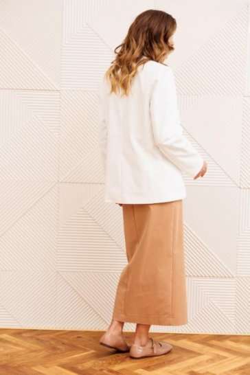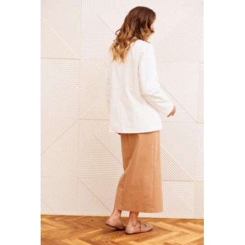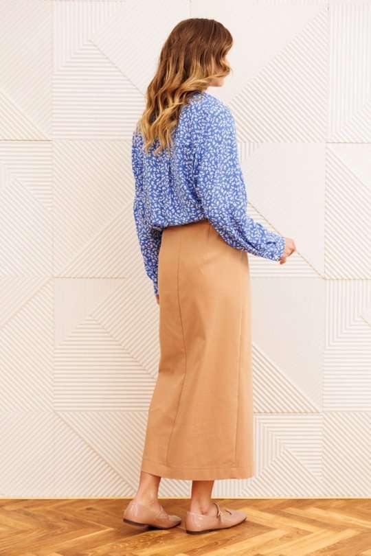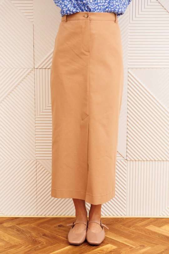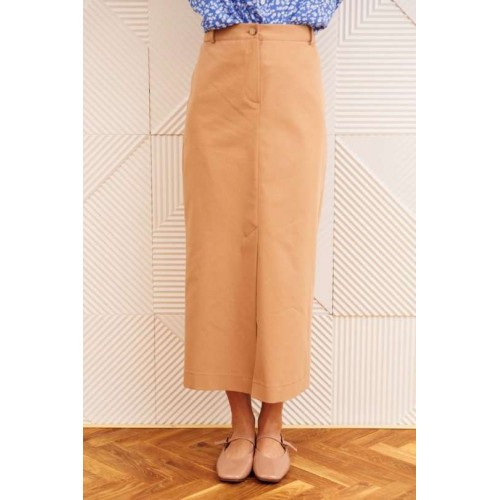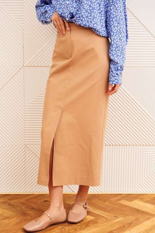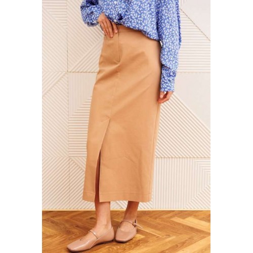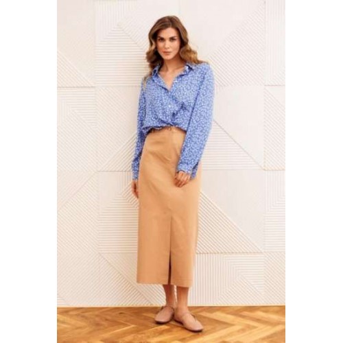 Юбка прямого силуэта выполненная из джинсовой ткани. Передняя честь юбки с вытачками, со средним швом и застежкой гульфиком на молнии и щлицей спереди. Задняя часть юбки с вытачками. Юбка на притачном поясе с затежкой на петлю и пуговицу спереди и резинками по бокам. Длина юбки с учетом пояса - 90 см.
