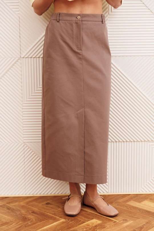 Юбка прямого силуэта выполненная из джинсовой ткани. Передняя честь юбки с вытачками, со средним швом и застежкой гульфиком на молнии и щлицей спереди. Задняя часть юбки с вытачками. Юбка на притачном поясе с затежкой на петлю и пуговицу спереди и резинками по бокам. Длина юбки с учетом пояса - 90 см.