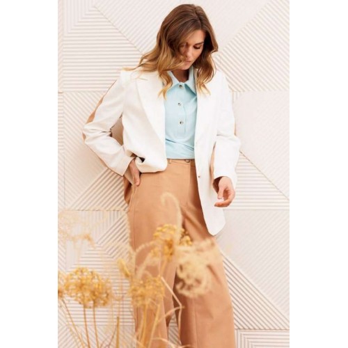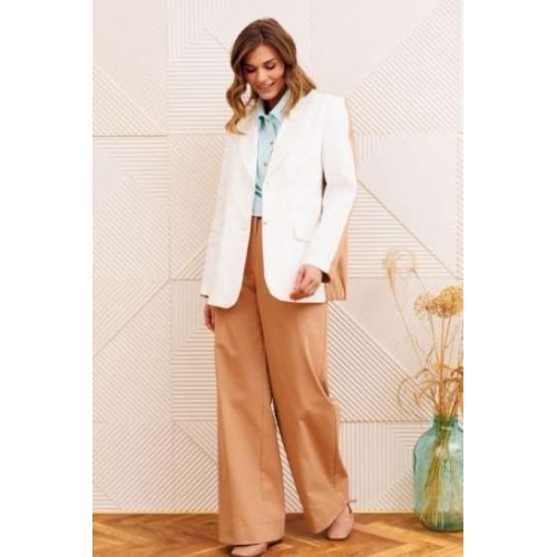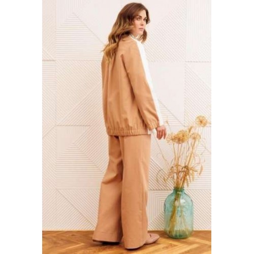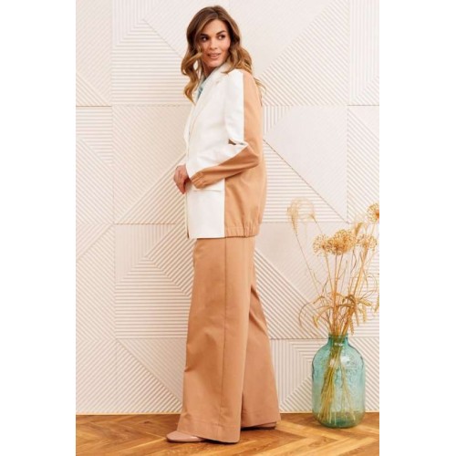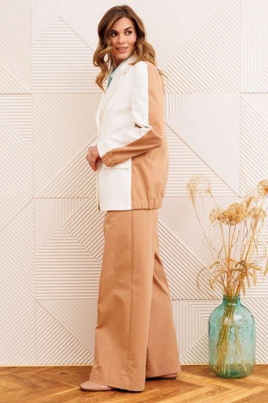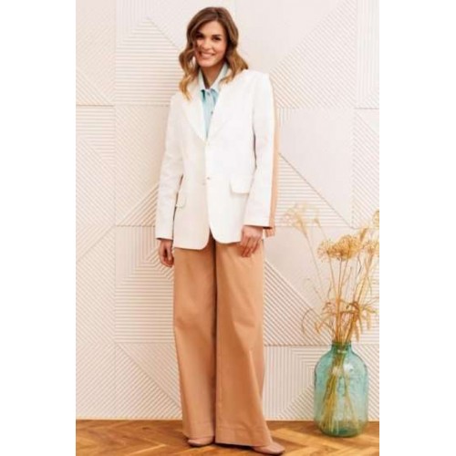 Костюм состоит из жакета и брюк. Жакет прямого силуэта сзади с имитацией куртки выполнен из хлопковой джинсовой ткани. Застежка однобортная на 2 петли и пуговицы. Воротник пиджачного типа. Перед с талиевой вытачкой, рельефом и декоративным клапаном. Спинка скокеткой и складкой. Рукав втачной двухшовный. Низ спинки и нижней части рукава собраны на резинку. Брюки расширеные книзу на притачном поясе. По поясу настрочены шлевки. По передним и задним частям брюк вытачки. На задних частях брюк настрочены карманы. Карманы, вытачки, пояс, низ брюк отделаны отделочной строчкой. Длина жакета - 70 см, длина рукава - 60 см. Длина брюк с учетом пояса -107 см