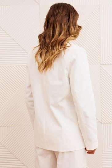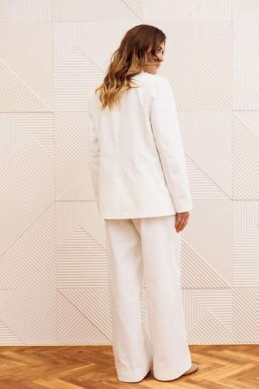 Костюм состоит из жакета и брюк из джинсовой хлопковой ткани. Жакет полуприлегающего силуэта с воротником пиджачного типа. Застежка однобортная на две пуговицы. Перед с талиевой вытачкой, рельефом и декоративным клапаном. Спинка с рельефами из проймы и средним швом. Рукав втачной двухшовный. Брюки расширеные книзу на притачном поясе. По поясу настрочены шлевки. По передним и задним частям брюк вытачки. На задних частях брюк настрочены карманы. Карманы, вытачки, пояс, низ брюк отделаны отделочной строчкой. Длина жакета - 68см, длина рукава жакета - 60 см, длина брюк с учетом пояса -107 см