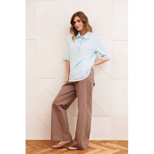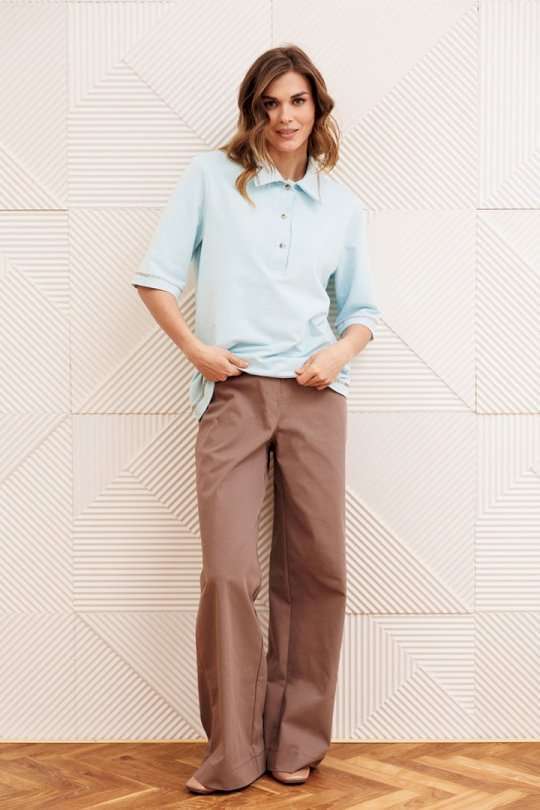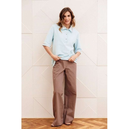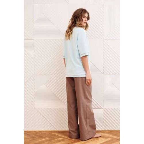Джемпер прямого силуэта с воротником поло. Рукав втачной одношовный. По низу изделия, по низу рукава и по воротнику проложена отделочная строчка. Брюки расширеные книзу на притачном поясе. По поясу настрочены шлевки. По передним и задним частям брюк вытачки. На задних частях брюк настрочены карманы. Карманы, вытачки, пояс, низ брюк отделаны отделочной строчкой. Длина брюк с учетом пояса - 109 см, длина джемпера- 66 см, длина рукава - 30 см,