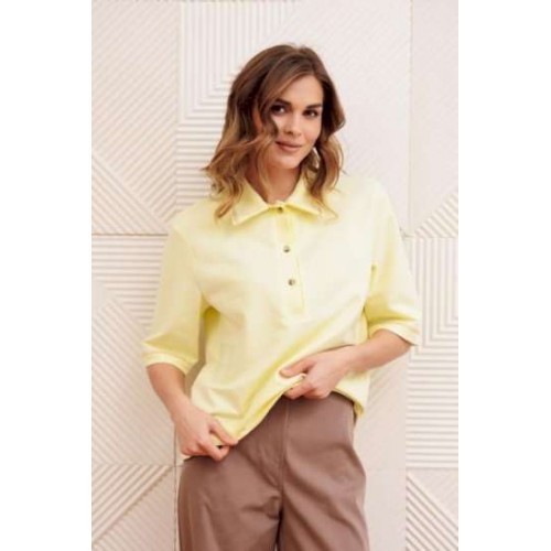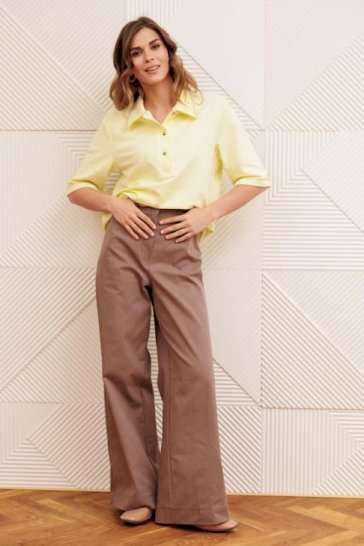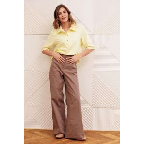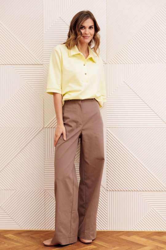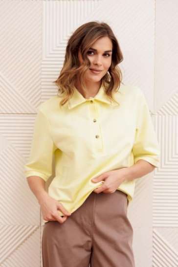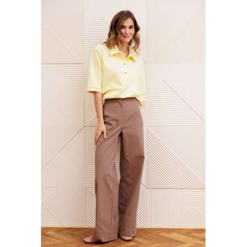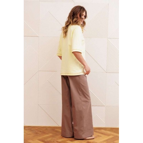 Джемпер прямого силуэта с воротником поло. Рукав втачной одношовный. По низу изделия, по низу рукава и по воротнику проложена отделочная строчка. Брюки расширеные книзу на притачном поясе. По поясу настрочены шлевки. По передним и задним частям брюк вытачки. На задних частях брюк настрочены карманы. Карманы, вытачки, пояс, низ брюк отделаны отделочной строчкой. Длина брюк с учетом пояса - 109 см, длина джемпера- 66 см, длина рукава - 30 см,