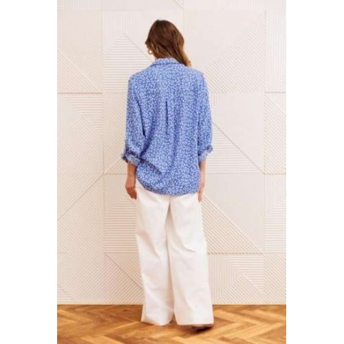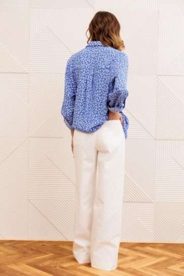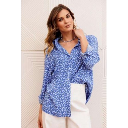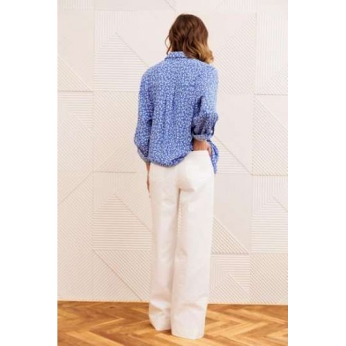 Костюм состоит из рубашки и брюк. Рубашка прямого силуэта с центральной застежкой на петли и пуговицы и воротником со стойкой. Спинка с кокеткой и складкой от кокетки. Рукав втачной с манжетой и патой. Брюки расширеные книзу на притачном поясе из джинсовой хлопковой ткани. По поясу настрочены шлевки. По передним и задним частям брюк вытачки. На задних частях брюк настрочены карманы. Карманы, вытачки, пояс, низ брюк отделаны отделочной строчкой. Длина брюк с учетом пояса - 109 см, длина блузки- 58 см, Длина рубашки - 70 см, длина рукава - 60 см.