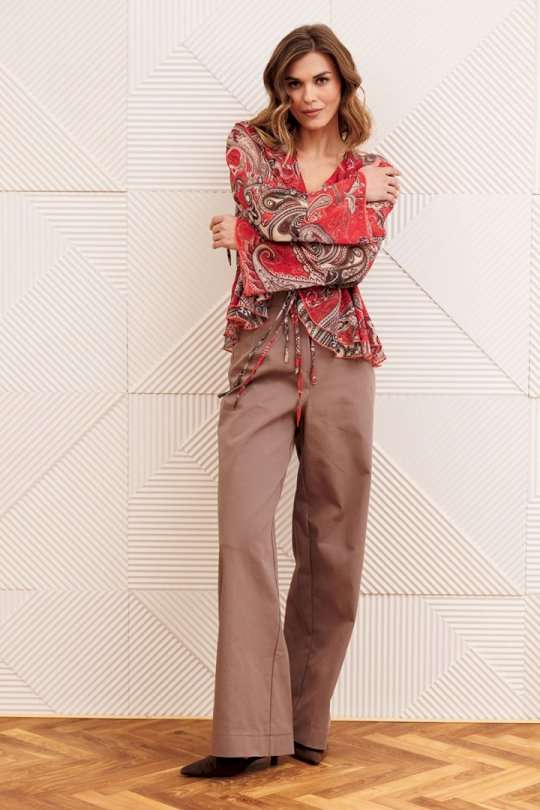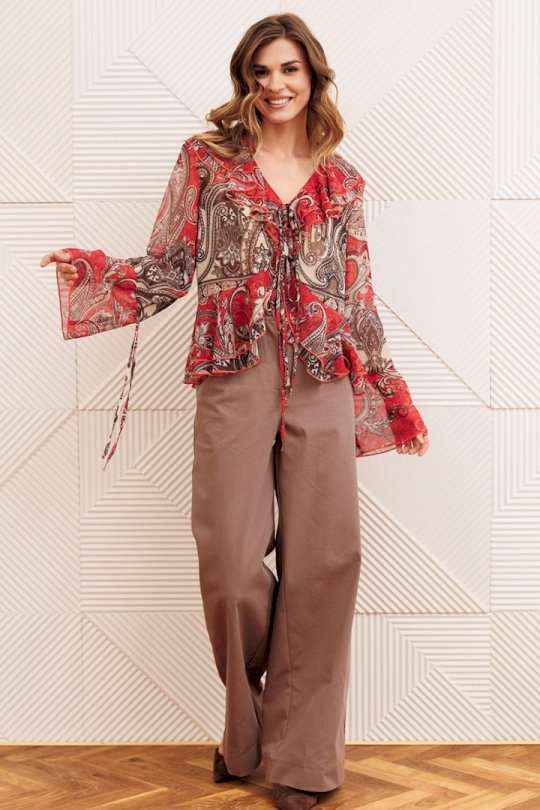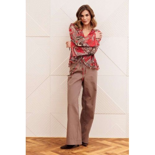 Костюм сосотоит из блузки и брюк. Блузка свободного силуэта в стиле бохо. Перед с нагрудными вытачками. Вдоль горловины, вдоль борта с переходом на спинку двойные рюши. Блузка спереди на завязках. Рукав втачной одношовный. Низ рукава с притачной рюшей и завязками. Брюки расширеные книзу на притачном поясе из джинсовой хлопковой ткани. По поясу настрочены шлевки. По передним и задним частям брюк вытачки. На задних частях брюк настрочены карманы. Карманы, вытачки, пояс, низ брюк отделаны отделочной строчкой. Длина брюк с учетом пояса - 109 см, длина блузки- 58 см, длина рукава блузки - 62 см.