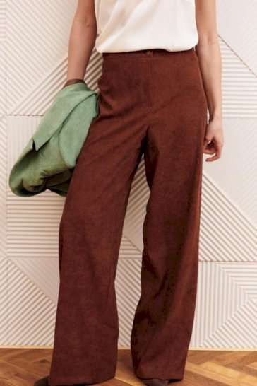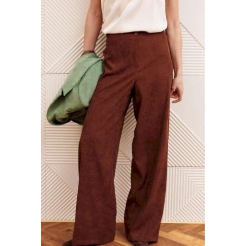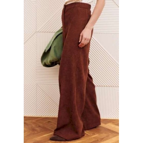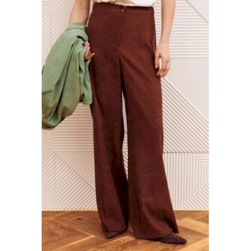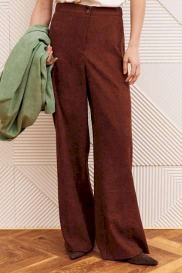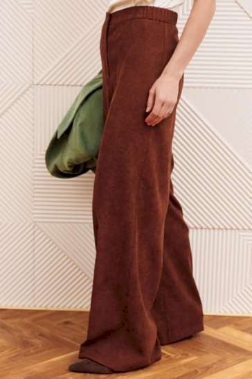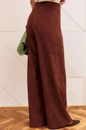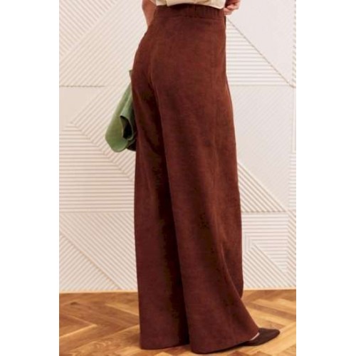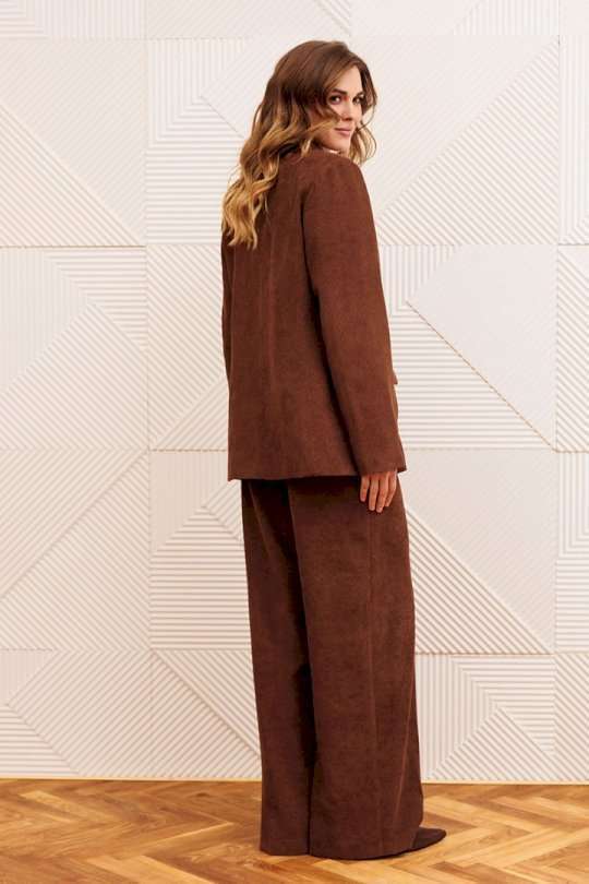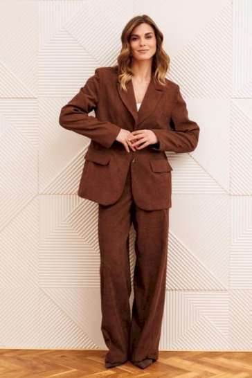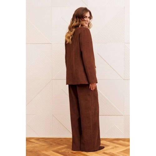 Костюм состоит из жакета и брюк из мягкой вельветовой ткани приятного цвета морского неба. Жакет полуприлегающего силуэта. Застежка однобортная на две пуговицы, воротник пиджачного типа. Перед с талиевой вытачкой, рельефом и декоративным клапаном. Спинка с рельефами из проймы и средним швом. Рукав втачной двухшовный. Жакет на подкладке. Брюки палаццо с притачным поясом . Спереди застежка гульфик на молнии и петлей и пуговицей по поясу. По задней частям брюк вытачки. Пояс с резинкой в боковых частях. Брюки с заутюженными стрелками. Длина жакета - 68 см, длина рукава жакета - 60 см. Длина брюк с учетом пояса - 109 см.