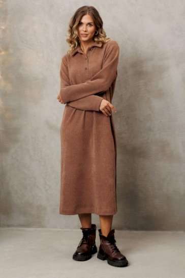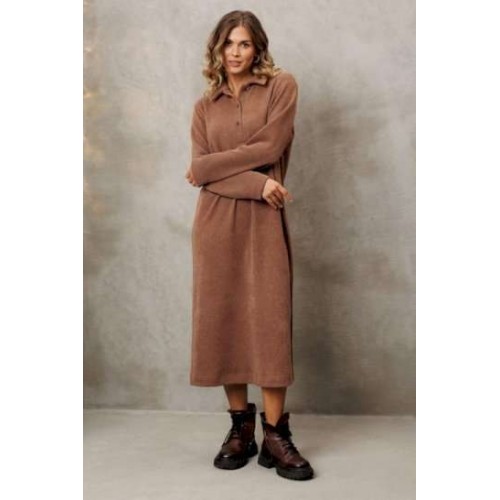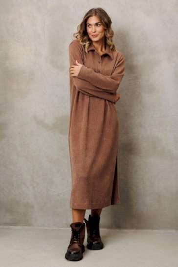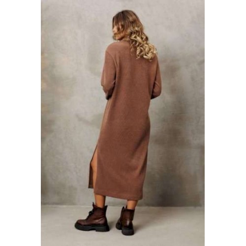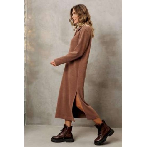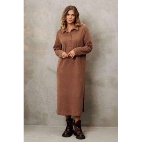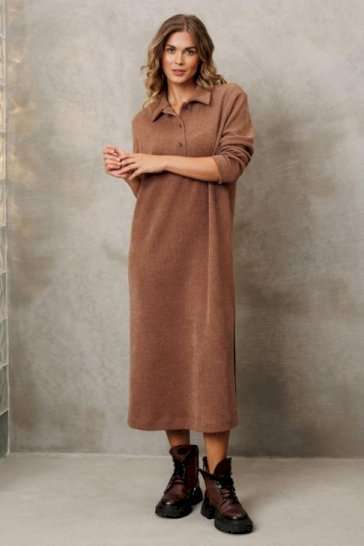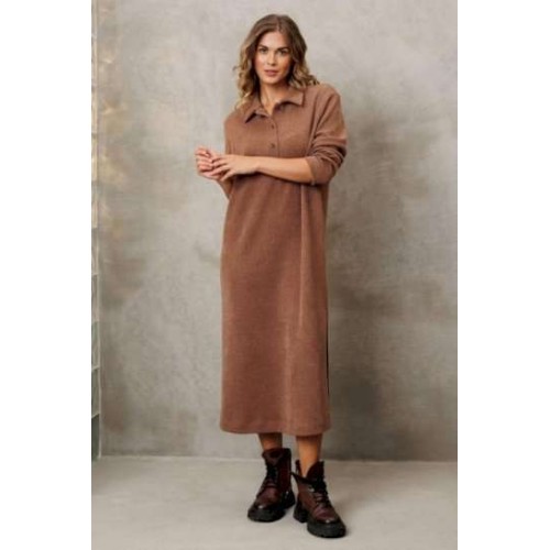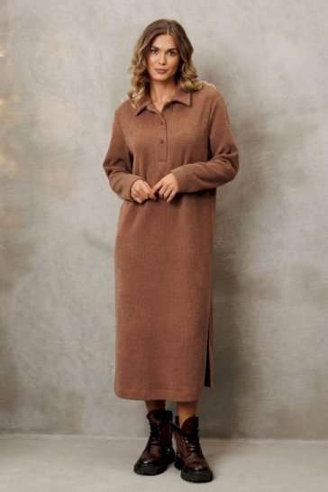 Платье прямого силуэта с воротником поло из теплого трикотажного полотна. Рукав втачной одношовный. Длина платья - 120 см. Длина рукава - 60 см