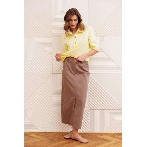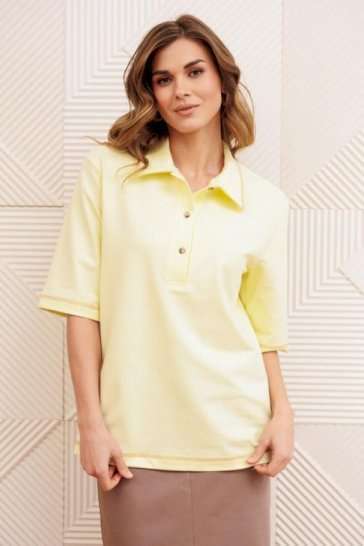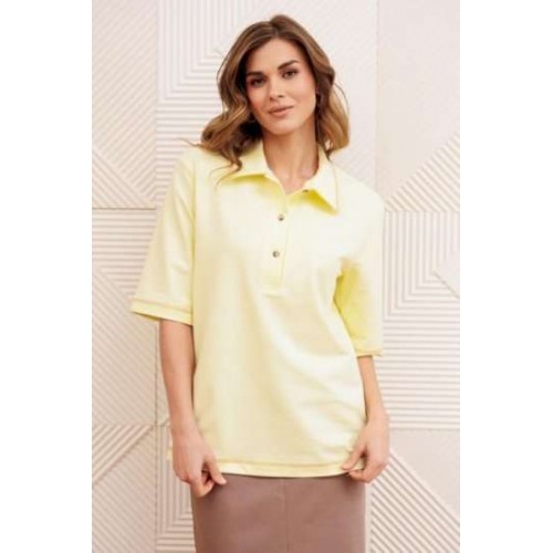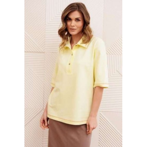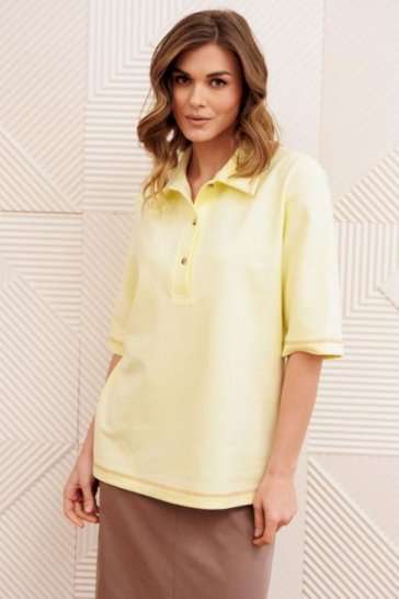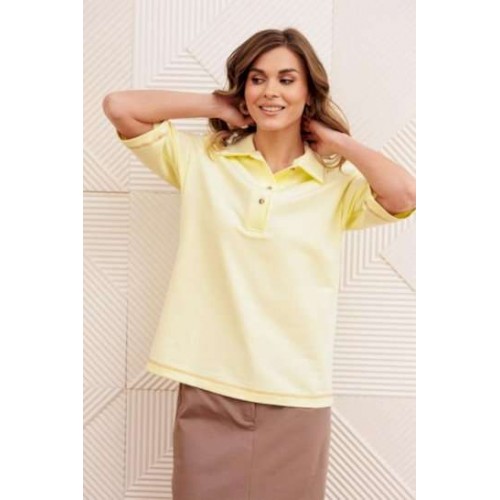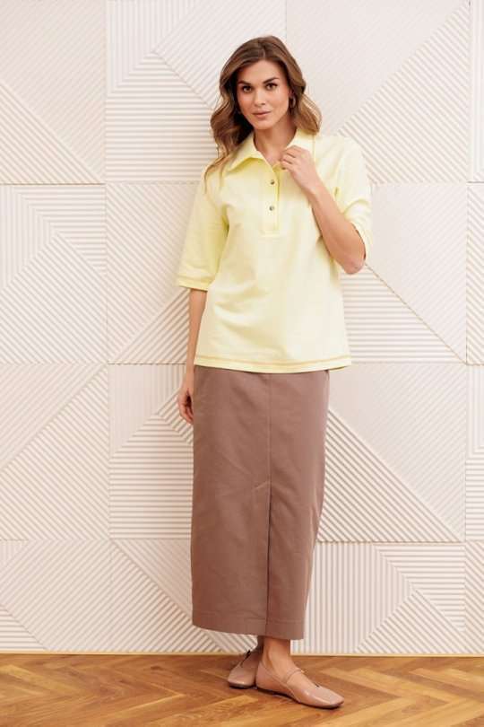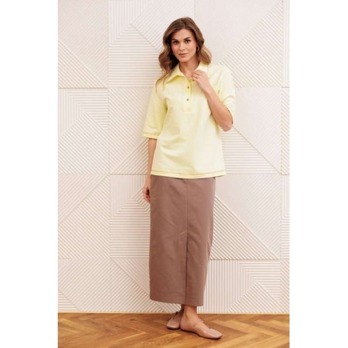 Костюм состоит из джемпера и юбки. Джемпер прямого силуэта с воротником поло. Рукав втачной одношовный. По низу изделия, по низу рукава и по воротнику проложена отделочная строчка. Длина джемпера- 66 см, длина рукава - 30 см. Юбка прямого силуэта выполненная из джинсовой ткани. Передняя честь юбки с вытачками, со средним швом и застежкой гульфиком на молнии и щлицей спереди. Задняя часть юбки с вытачками. Юбка на притачном поясе с затежкой на петлю и пуговицу спереди и резинками по бокам. Длина юбки с учетом пояса - 90 см.