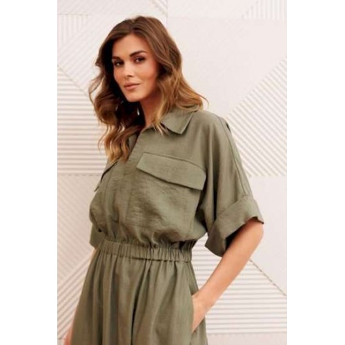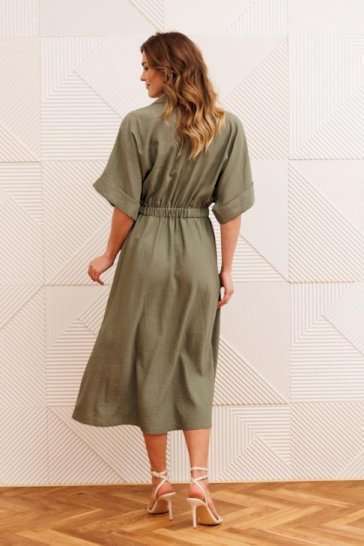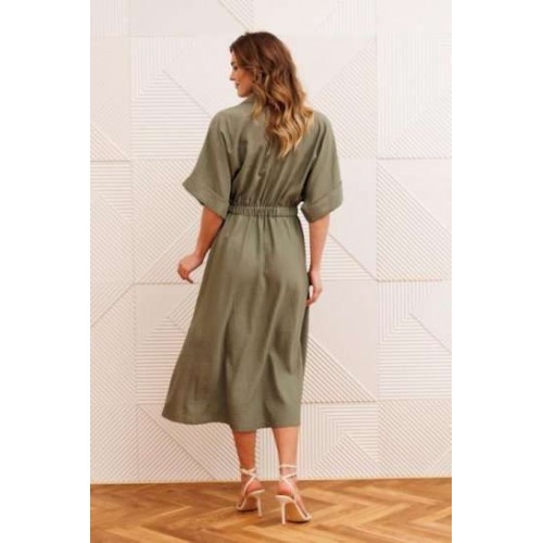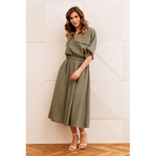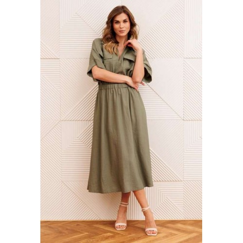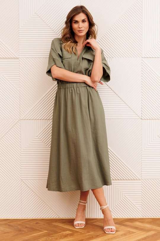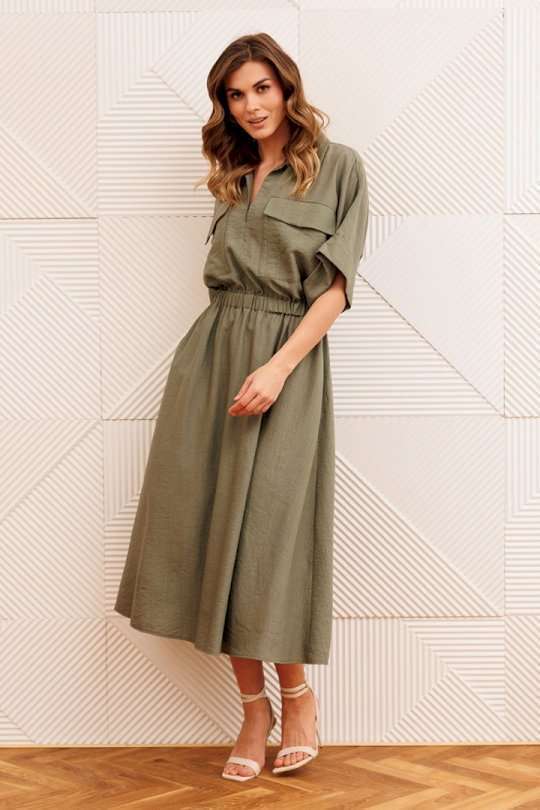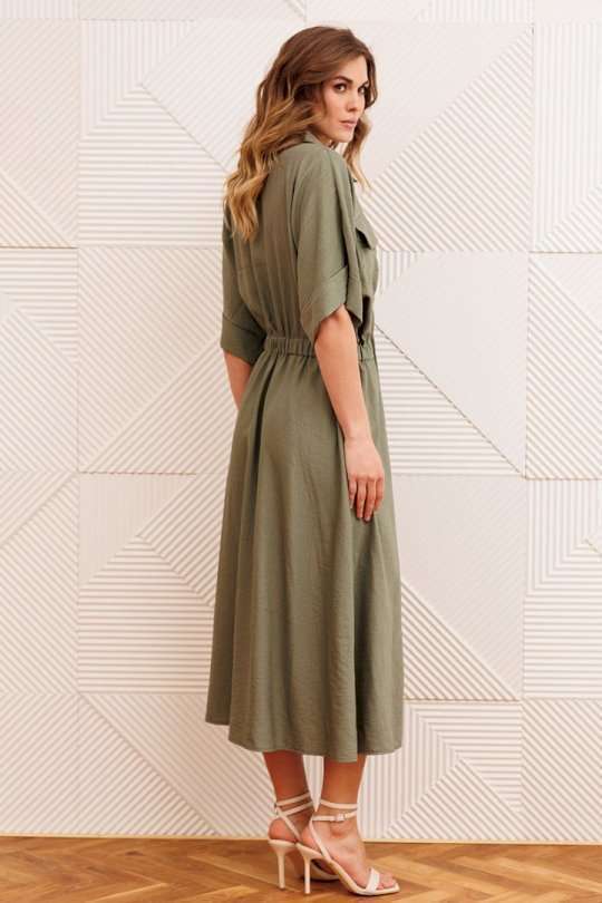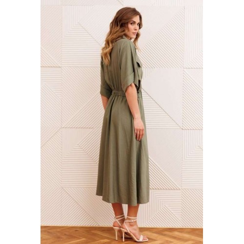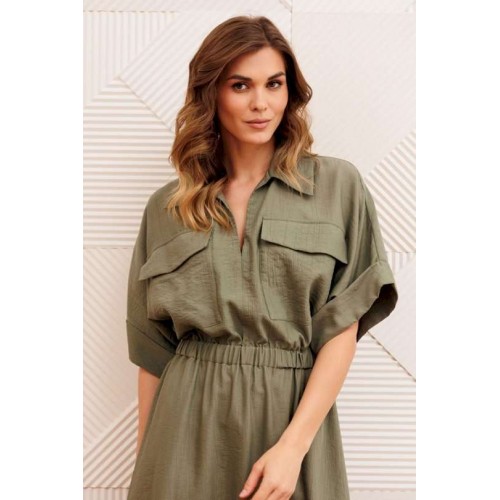 Платье А-образного силуэта с резинкой на талии. Перед с настрочным карманом и клапаном. Горловина V-образной формы. Рукав спущеное плечо с манжетой. В боковых швах карманы.