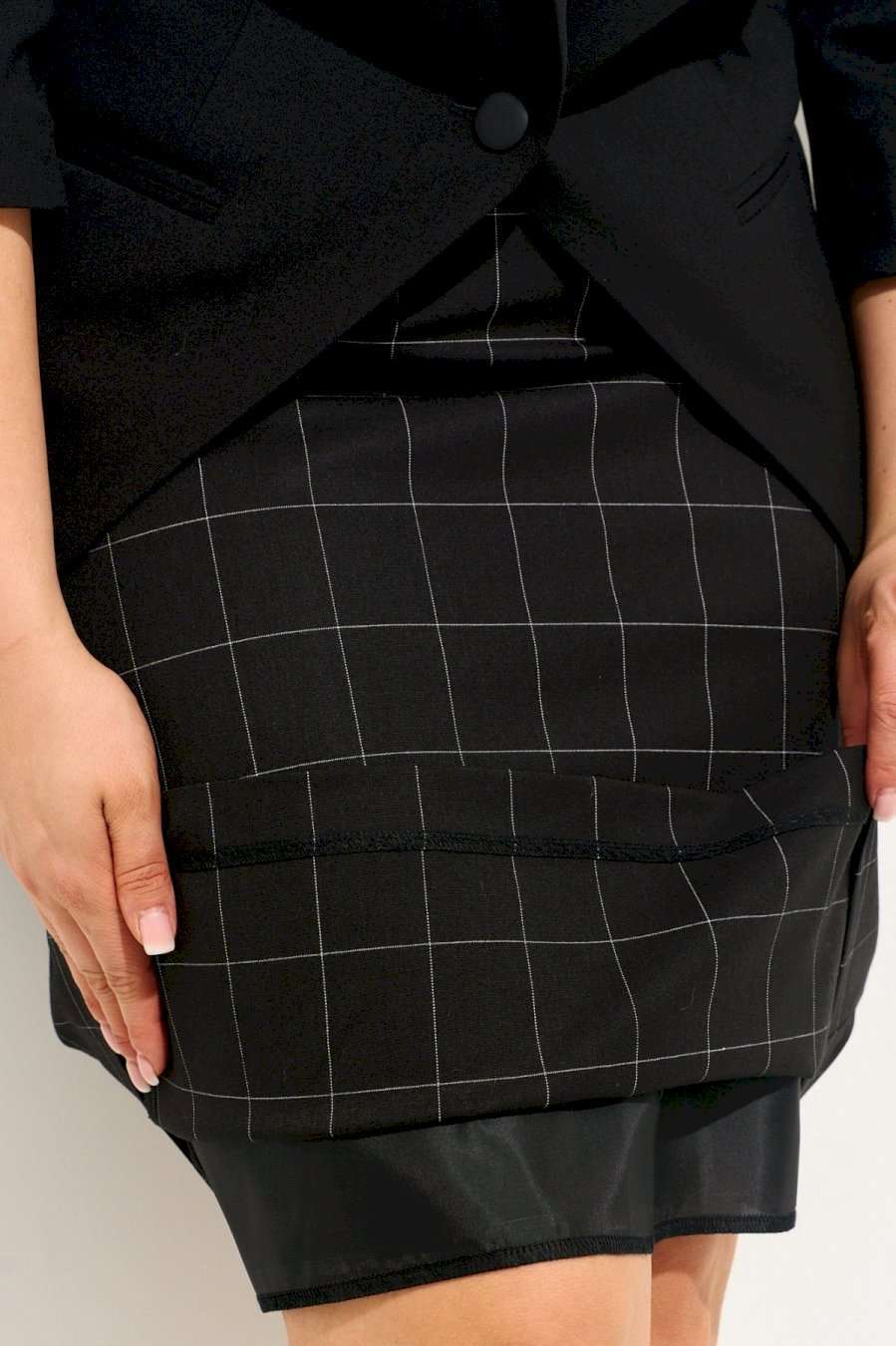 Костюм женский, состоящий из жакета и юбки, выполнен из костюмной ткани средней плотности. Жакет полуприлегающего силуэта на подкладке; рукава втачные; по переду прорезные фунциональные карманы "в рамку"; воротник "шаль"; застежка на петлю и пуговицу. Юбка полуприлегающего силуэта выполнена из ткани "компаньона " в клетку на эластичной подкладке с притачным поясом, в боковые швы которого вставлена резинка для лучшего прилегания; по спинке шлица; застежка на молнию, петлю и пуговицу. Костюм полностью соотвествует заявленному размеру. Пожалуйста, пользуйтесь таблицей замеров готового изделия. Уход за костюмной тканью: - рекомендована бережная стирка при t не выше 30 градусов.