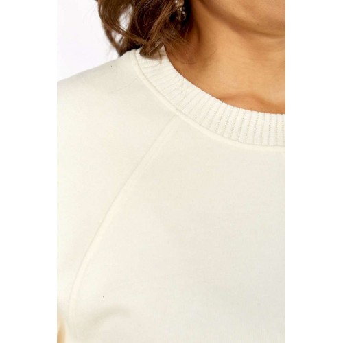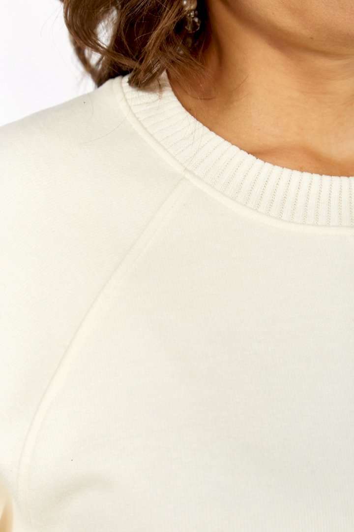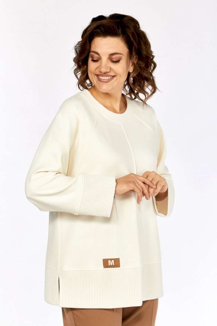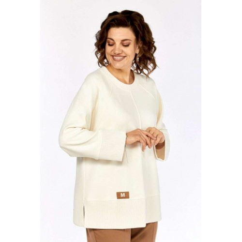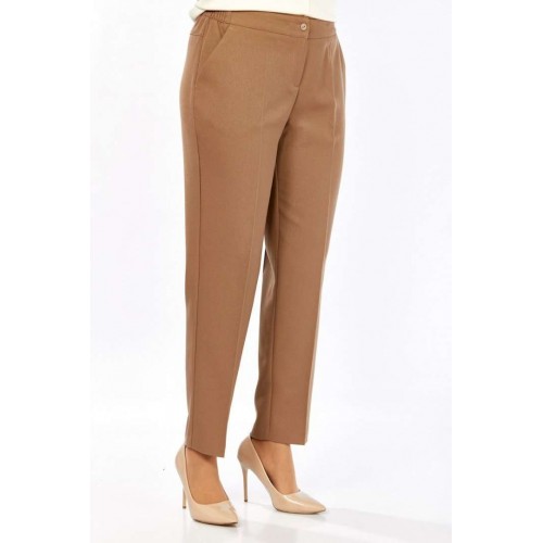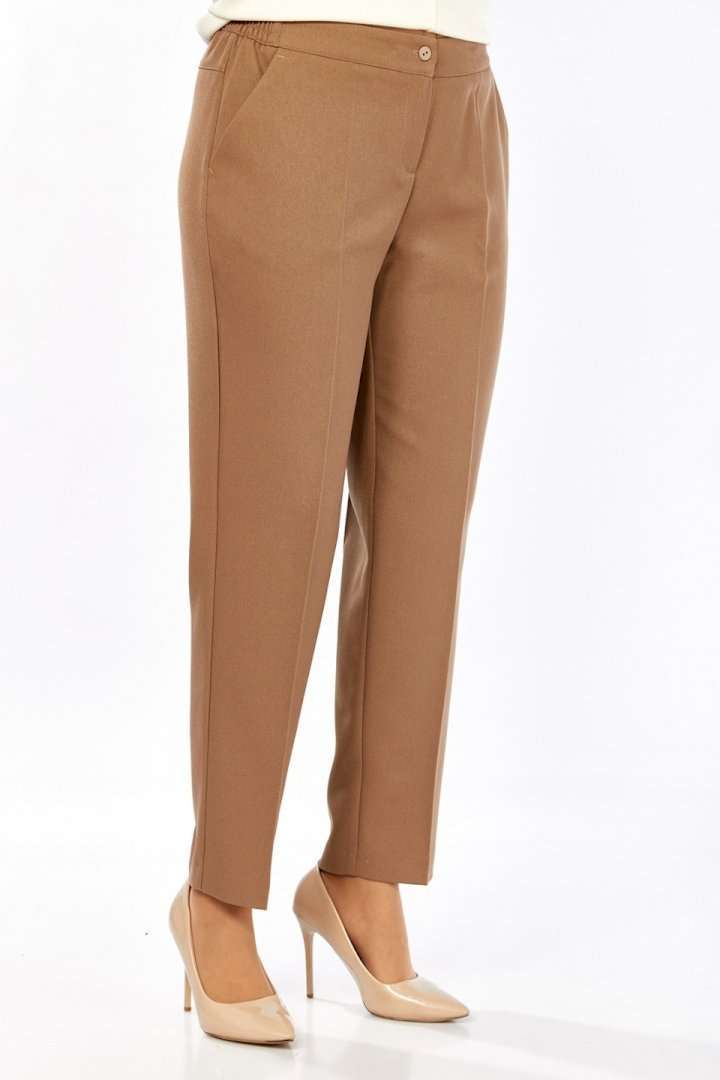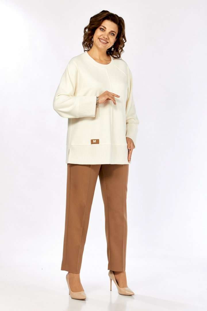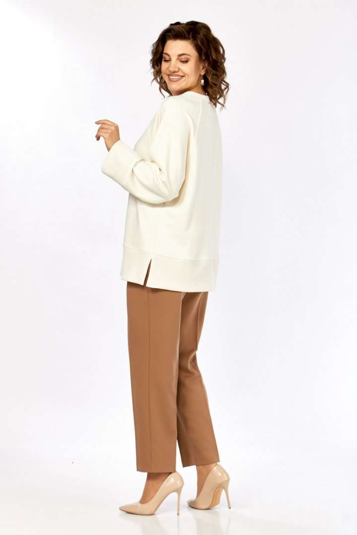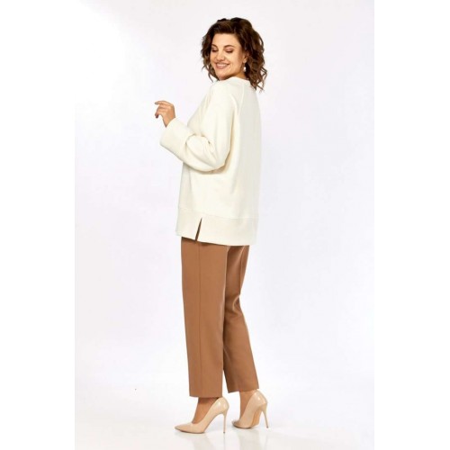 Комплект женский брючный, состоит из джемпера и брюк. Джемпер свободного кроя, изготовлен из трикотажного полотна, комбинированный. Горловина круглой формы. Рукава реглан. В боковых швах обработаны разрезы по низу. Горловина, низ изделия и низ рукавов изготовлены из отделочной ткани. Отделка — нашивка по переду. Брюки классические из костюмной ткани. В брюках обработан пояс, частично на резинке. Застежка на молнию, петлю и пуговицу. В брюках обработаны боковые карманы. Сзади обработана кокетка. Обращаем Ваше внимание, что цвет на экране может отличаться от реального.