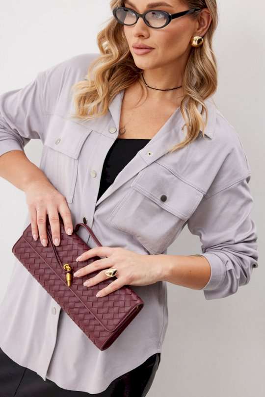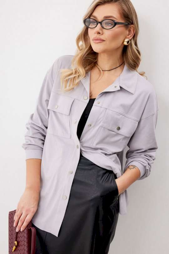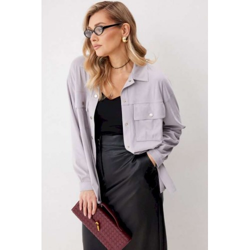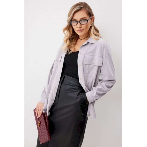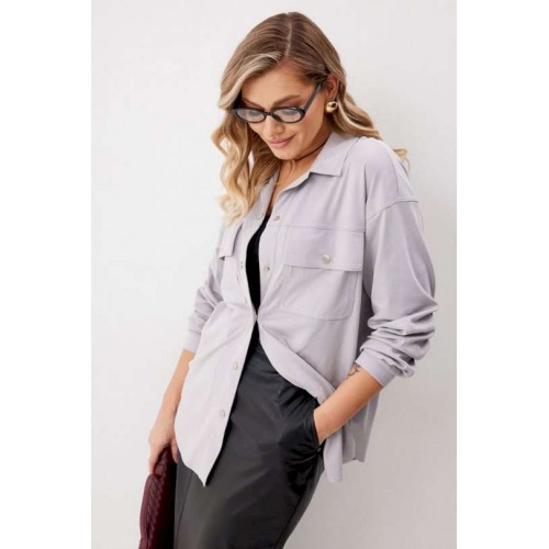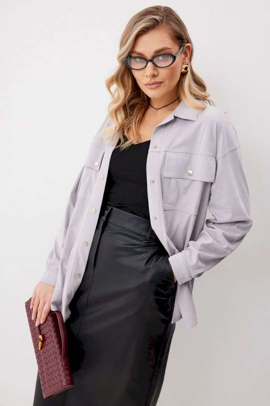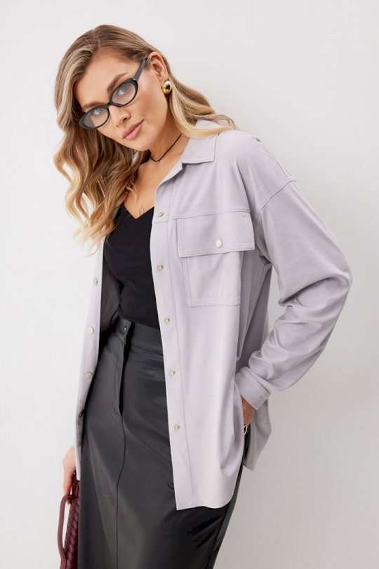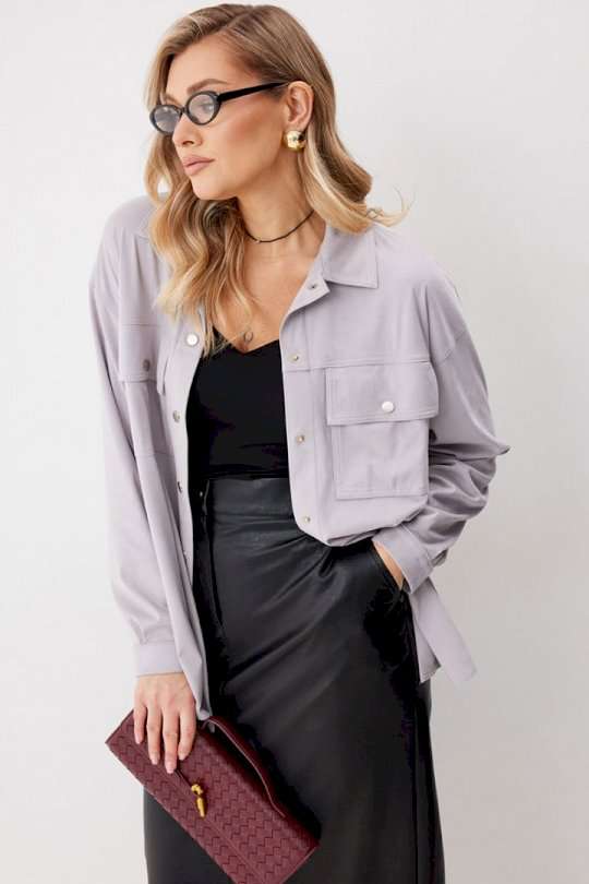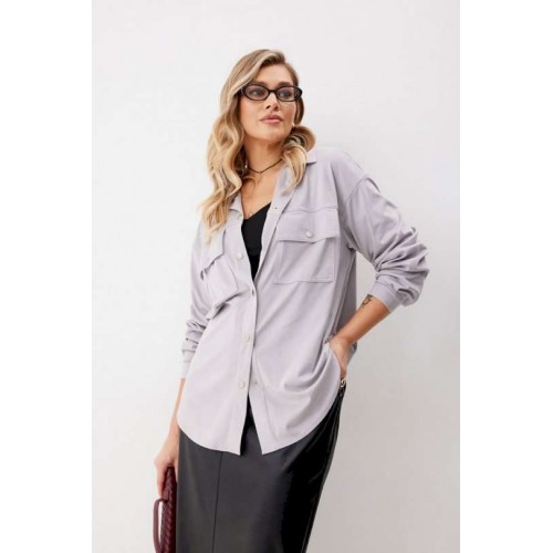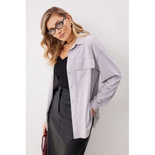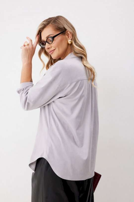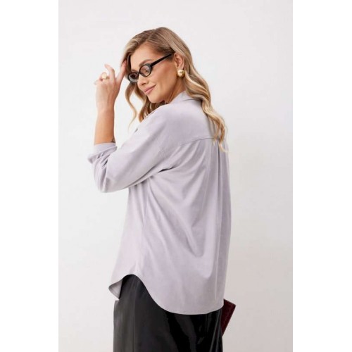Блузка женская прямого силуэта из замшевой ткани длиной за линию бедер. По переду блузки отрезные кокетки и нагрудные накладные карманы с клапаном, застегивающиеся на кнопку. Спинка с отрезной кокеткой и встречной складкой. Линия плеча спущена. Рукав рубашечный втачной по низу с 2 –мя складками и отрезной манжетой, застегивающейся на кнопку. Воротник втачной рубашечный. Линия низа имеет фигурную форму. Воротник, кокетки, карманы, линия проймы отстрочены отделочными строчками. Застежка на кнопки центральная.