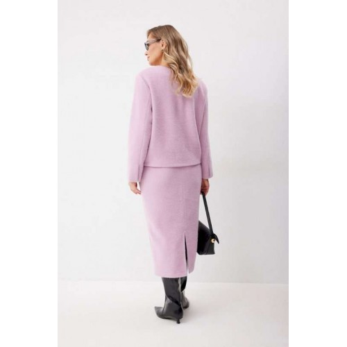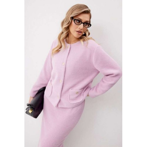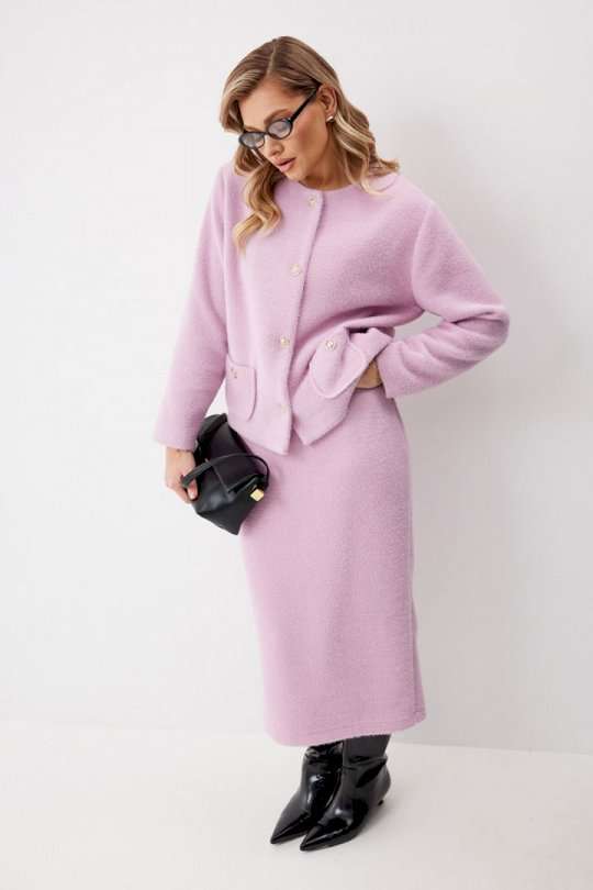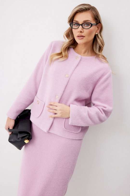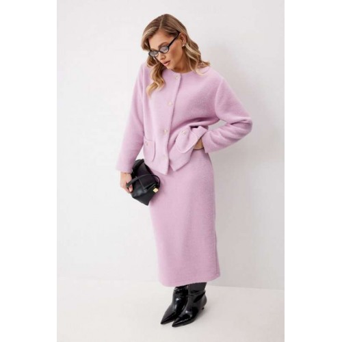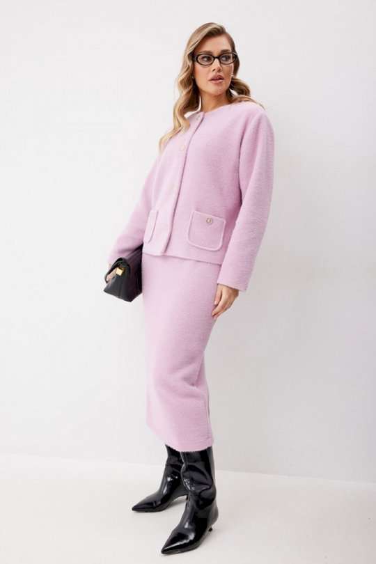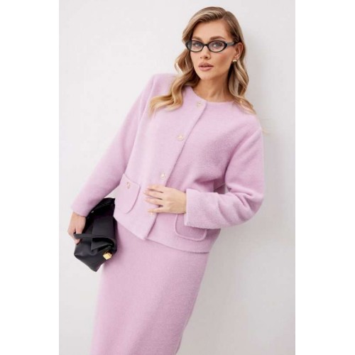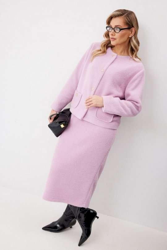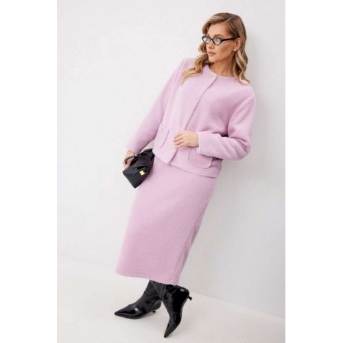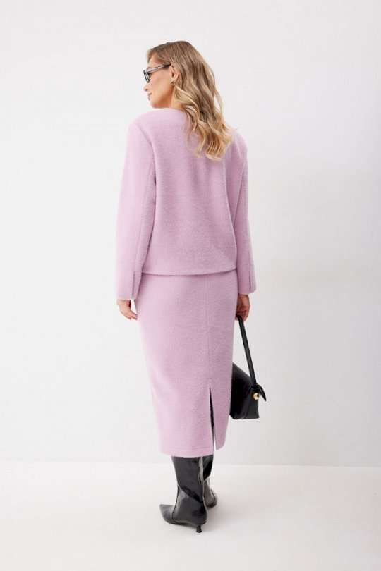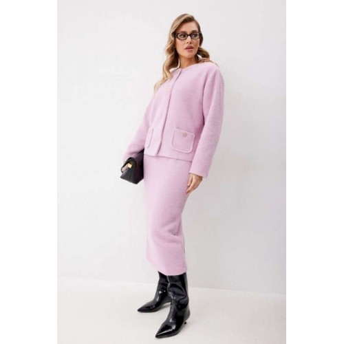 Костюм женский состоящий из жакета и юбки. Жакет женский из трикотажной ткани прямого силуэта на подкладке. На деталях переда настрочены накладные карманы округлой формы застегивающиеся на декоративные кнопки. Спинка прямая. Рукав двухшовный с имитацией шлицы. Горловина округлой формы. Жакет застегивается на декоративные кнопки. Юбка - карандаш из трикотажной тканина подкладке, длиной за колено. По переду юбки застрочены вытачки. По спинке юбки в среднем шве обработан разрез и застежка- «молния». Пояс юбки цельнокроеный с резинкой по переду. Длина спинки жакета 57,7см, длина рукава 62,5 см, длина юбки по боковому шву 90 см.