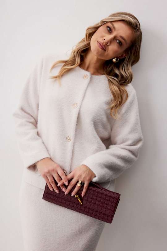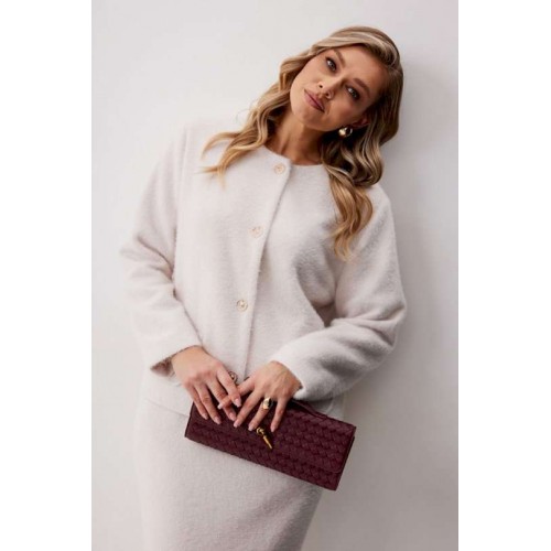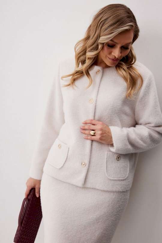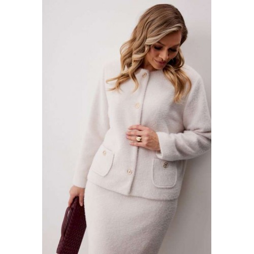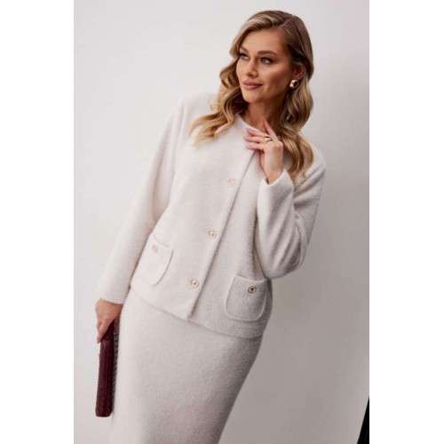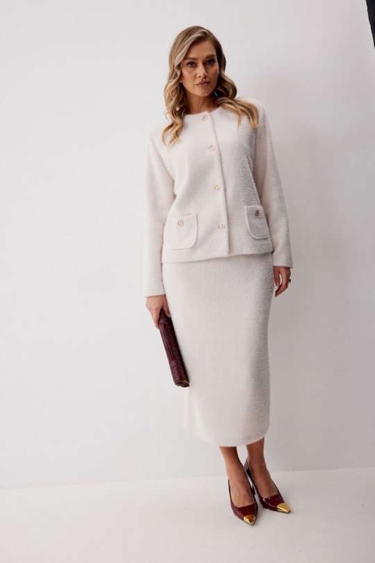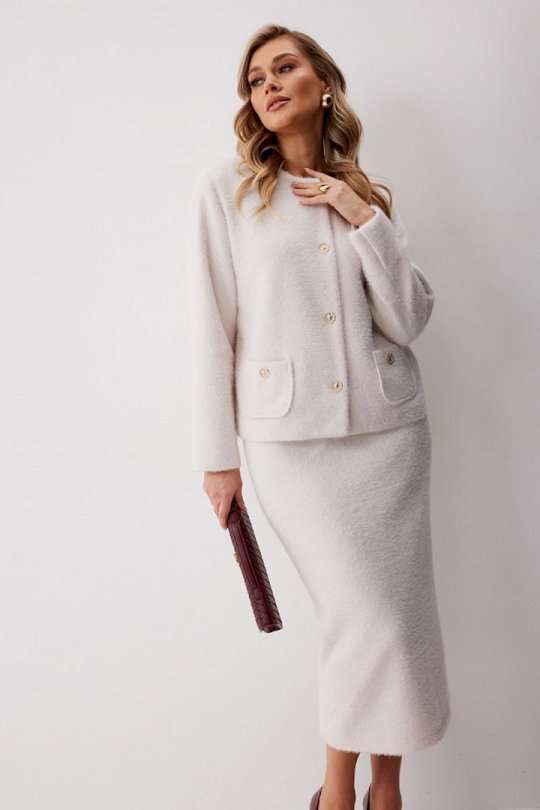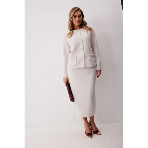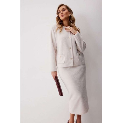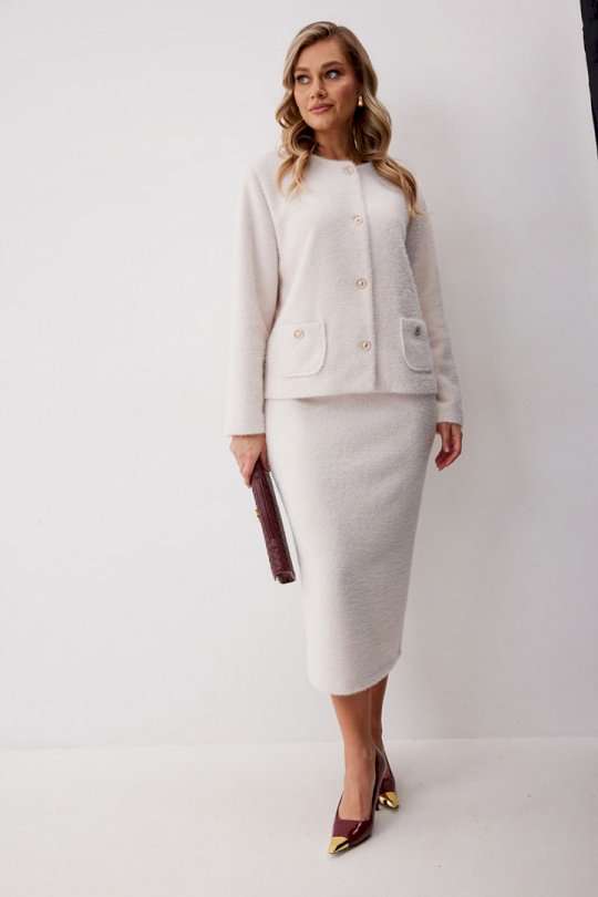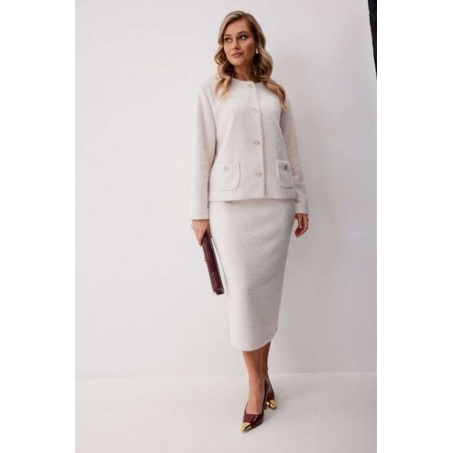 Костюм женский состоящий из жакета и юбки. Жакет женский из трикотажной ткани прямого силуэта на подкладке. На деталях переда настрочены накладные карманы округлой формы застегивающиеся на декоративные кнопки. Спинка прямая. Рукав двухшовный с имитацией шлицы. Горловина округлой формы. Жакет застегивается на декоративные кнопки. Юбка - карандаш из трикотажной тканина подкладке, длиной за колено. По переду юбки застрочены вытачки. По спинке юбки в среднем шве обработан разрез и застежка- «молния». Пояс юбки цельнокроеный с резинкой по переду. Длина спинки жакета 57,7см, длина рукава 62,5 см, длина юбки по боковому шву 90 см.