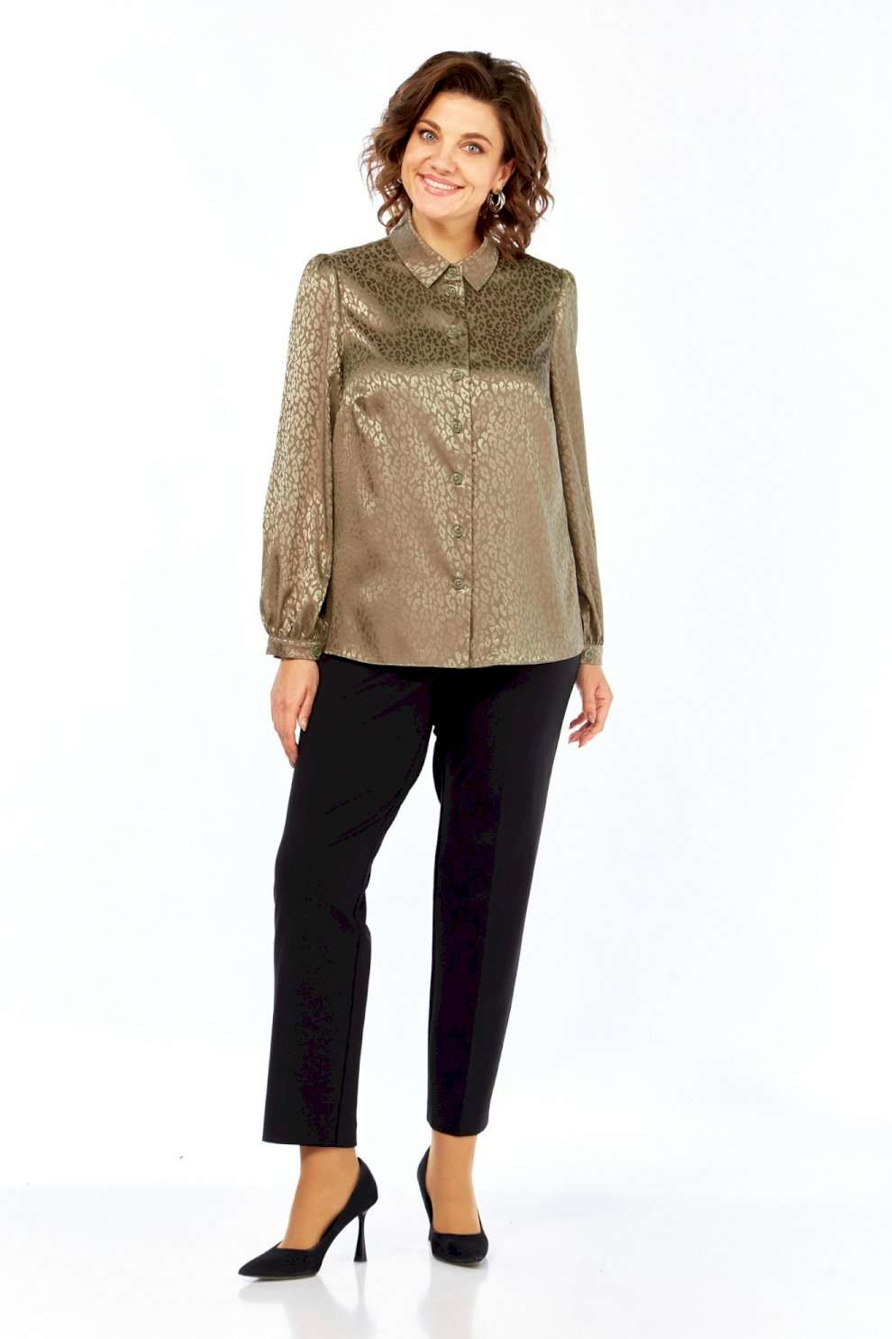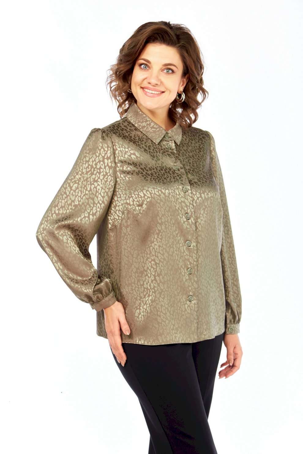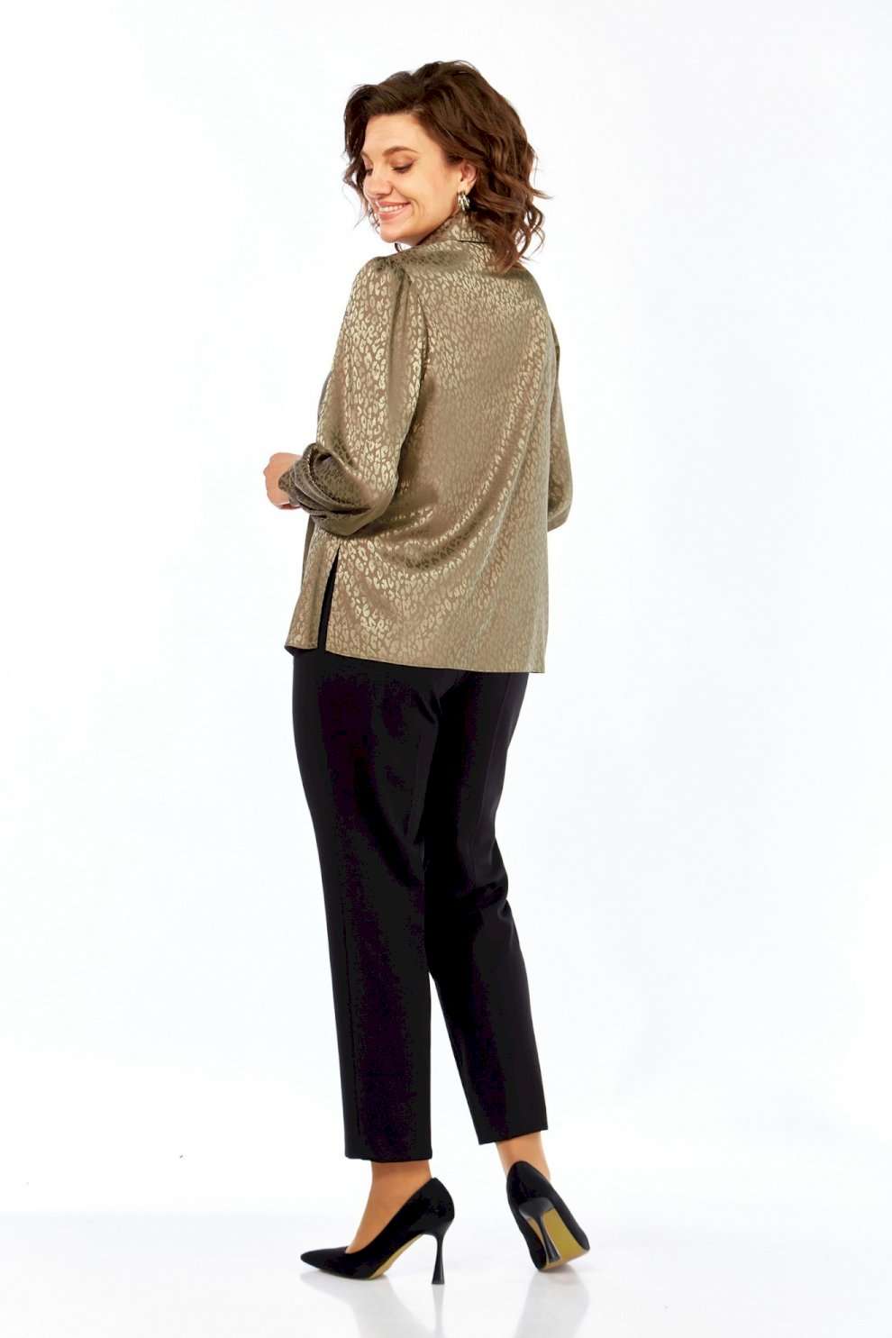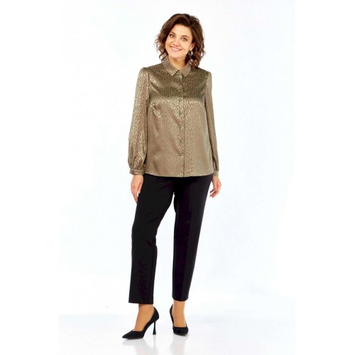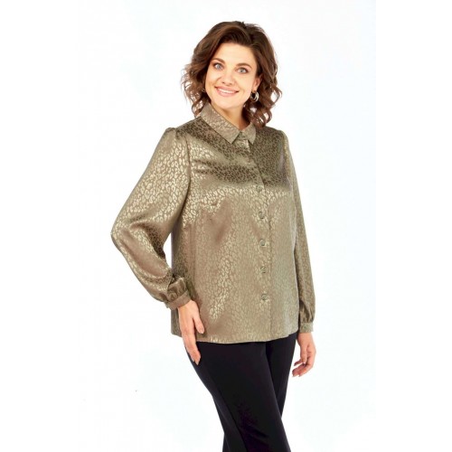 Блузка прямого силуэта, выполнена из ткани типа тонкого атласа с жаккардовым рисунком. Воротник на стойке, застежка на пуговицы, по боковым швам разрезы. Рукав длинный, расширенный, сверху небольшая сборка, внизу тоже сборка + притачная манжета с пуговицей.