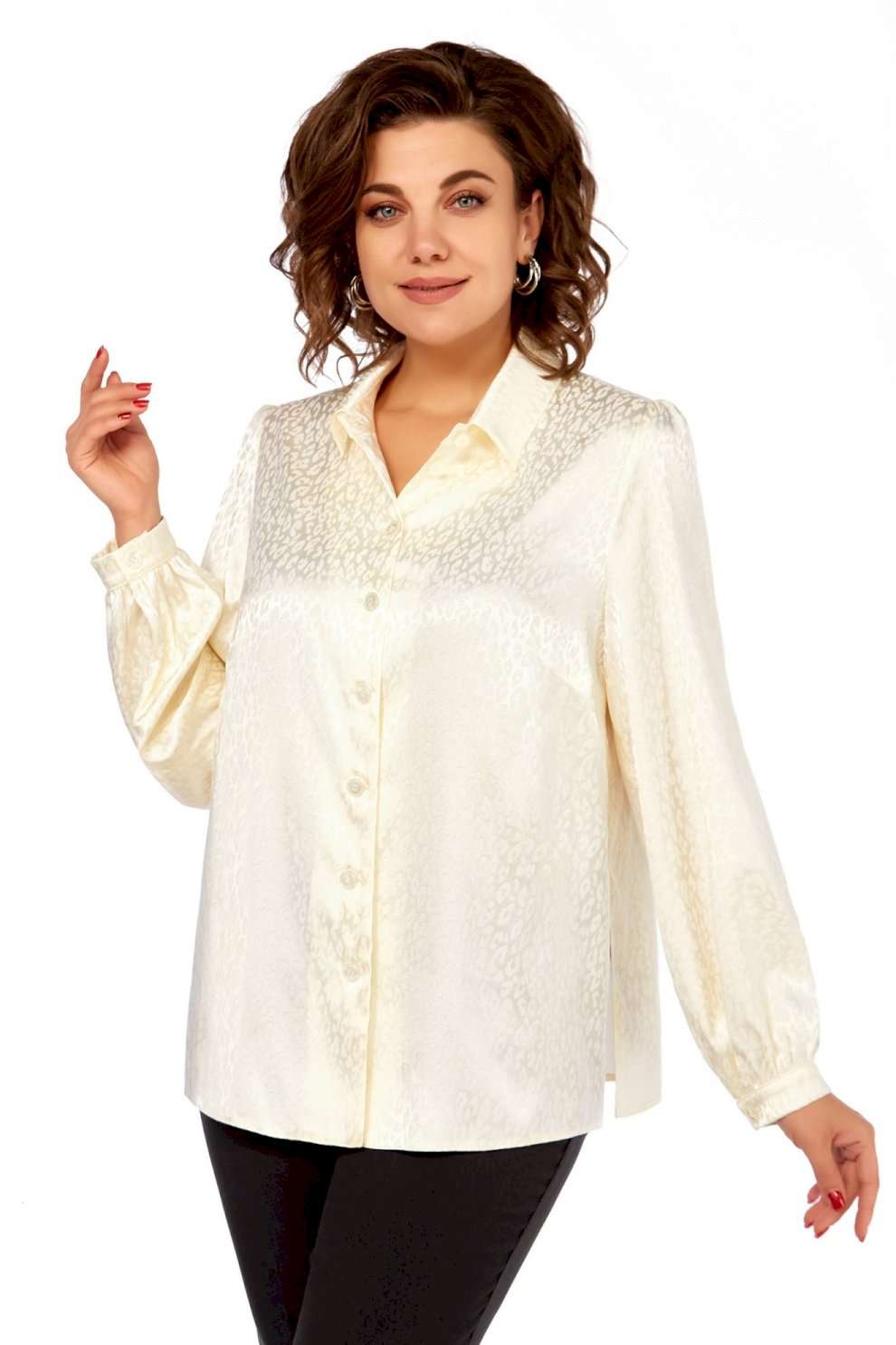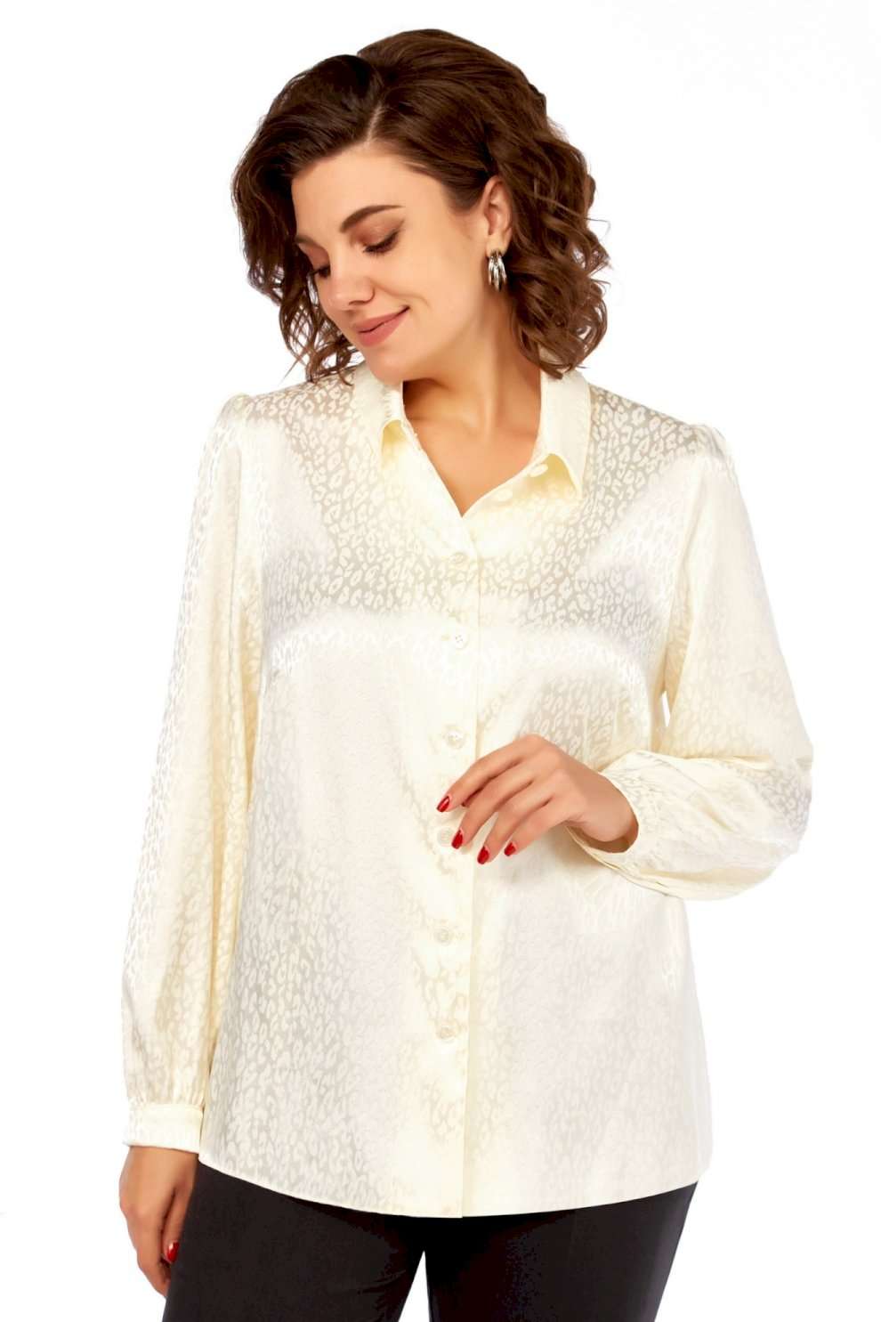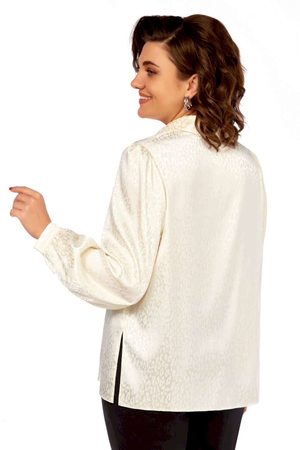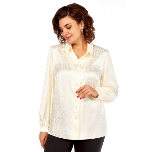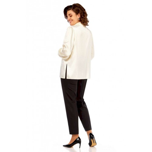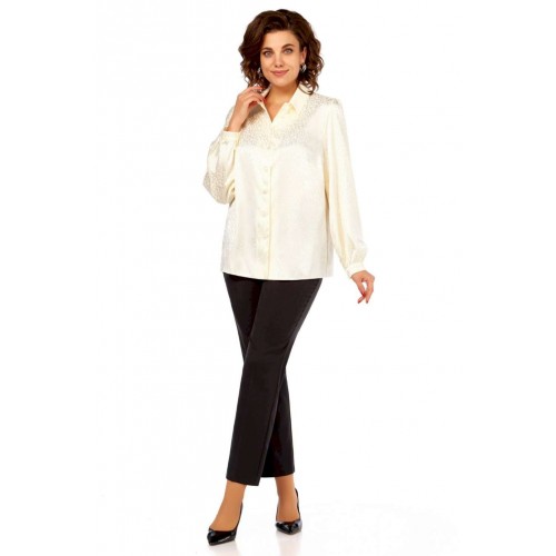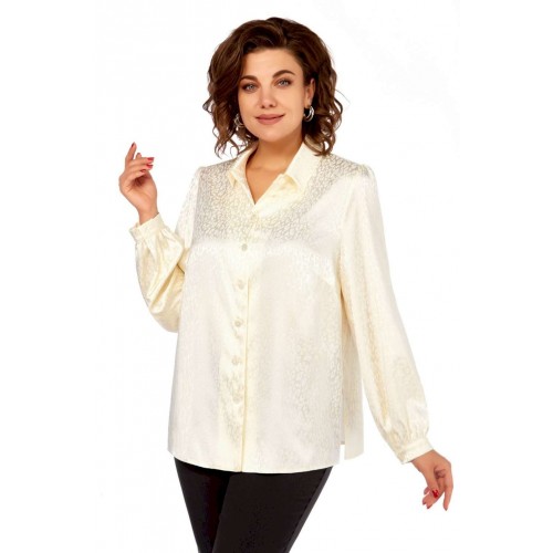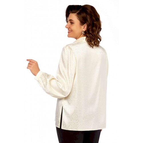 Блузка прямого силуэта, выполнена из ткани типа тонкого атласа с жаккардовым рисунком. Воротник на стойке, застежка на пуговицы, по боковым швам разрезы. Рукав длинный, расширенный, сверху небольшая сборка, внизу тоже сборка + притачная манжета с пуговицей.