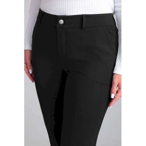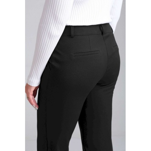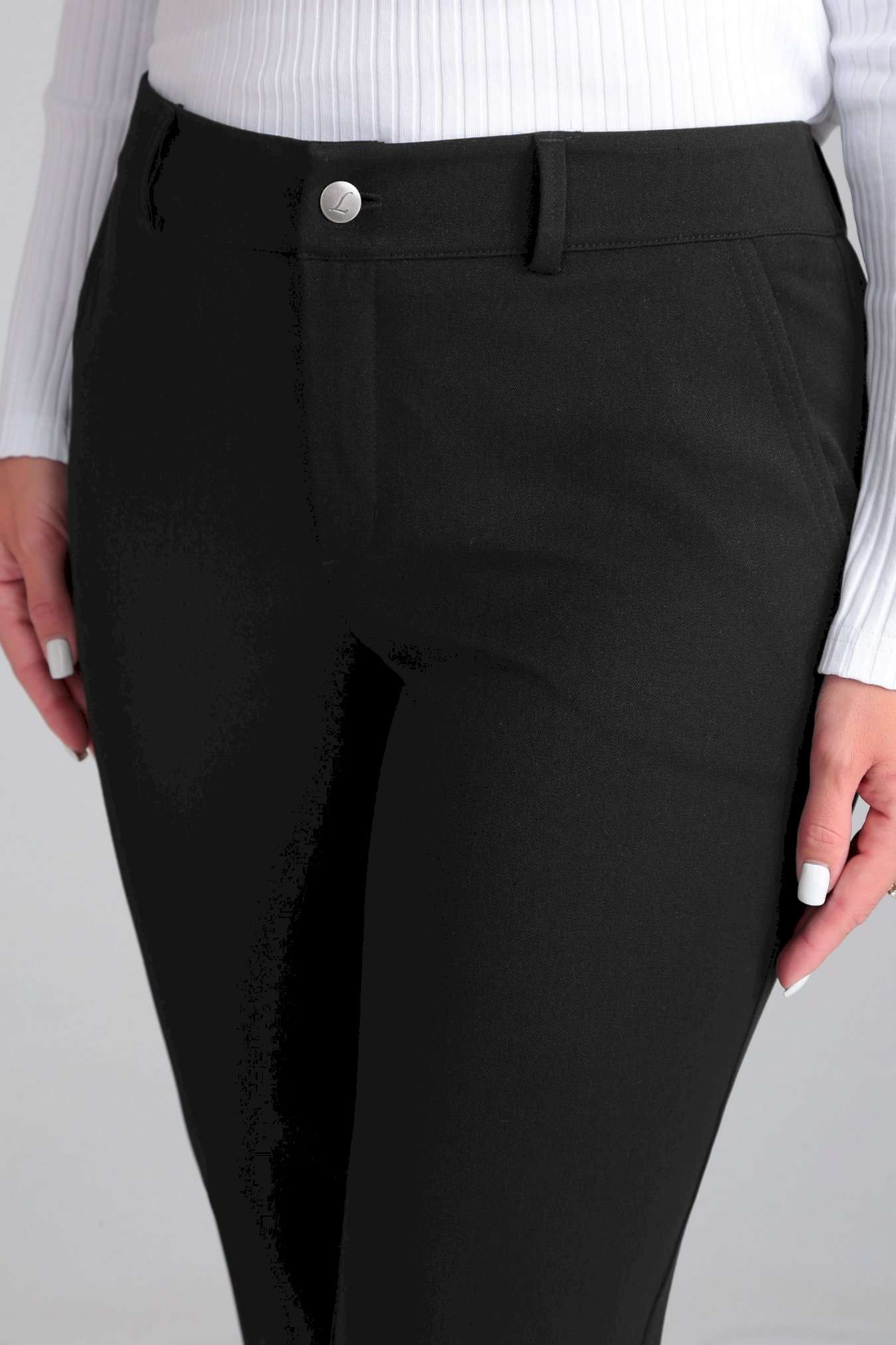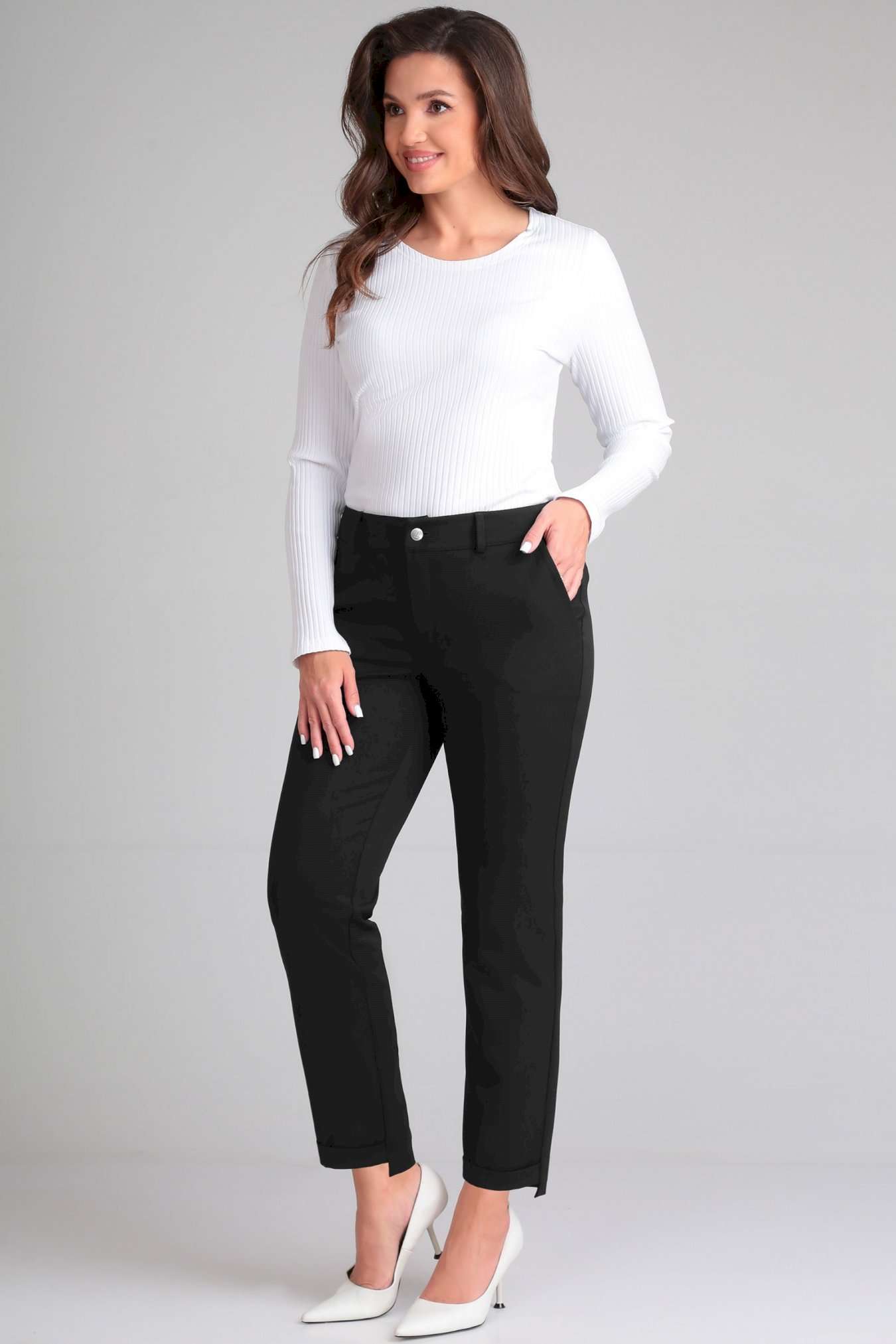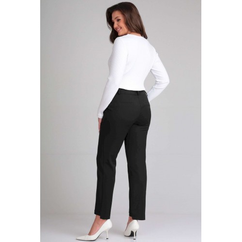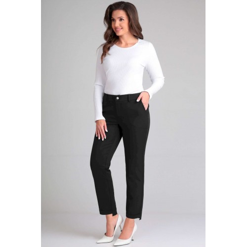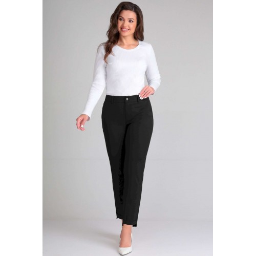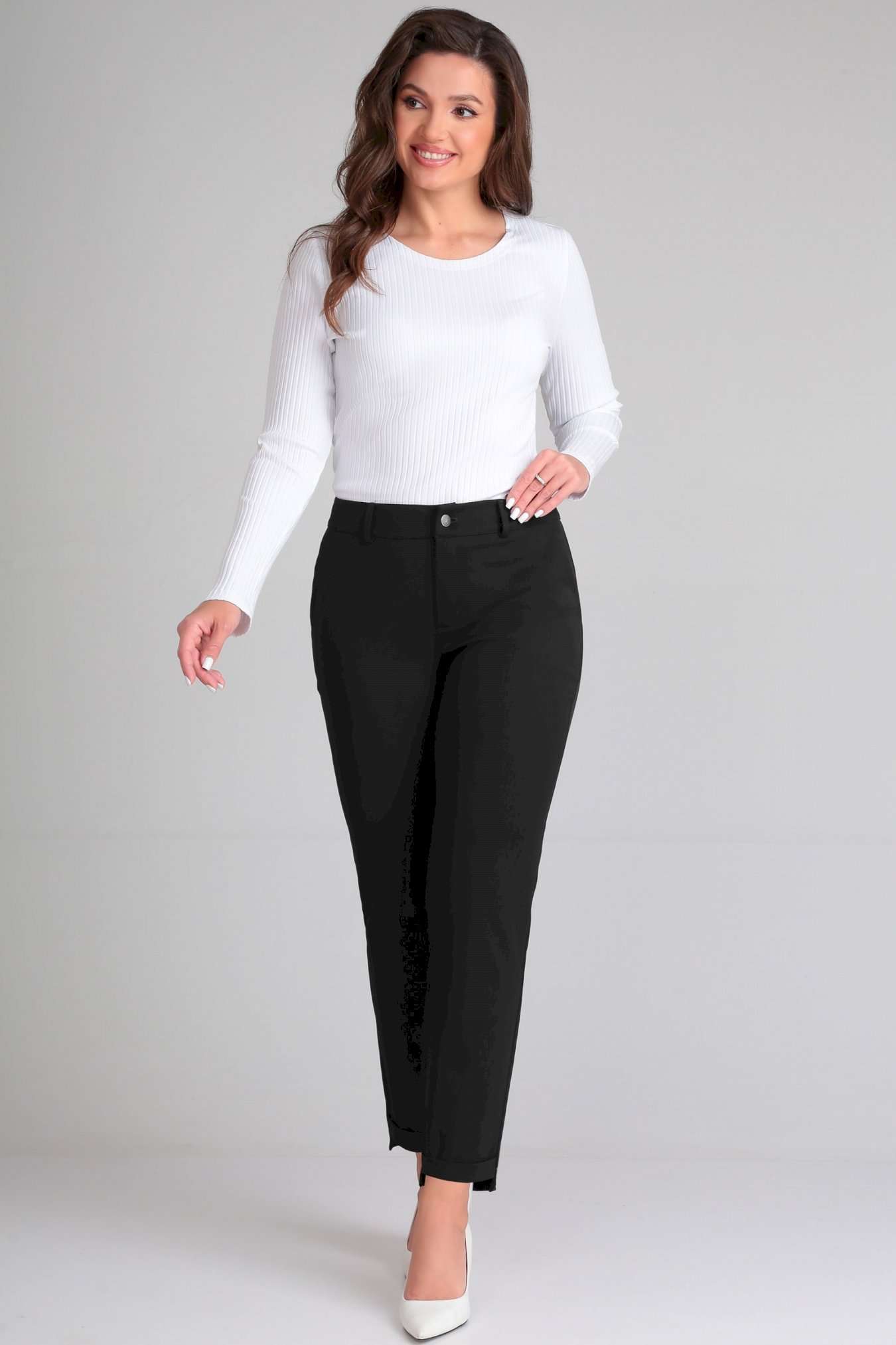 Брюки укороченные, на притачном поясе имеются шлевки. В размерах 56-60 по бокам в пояс вставлена резинка. Застёжка на молнию и джинсовую пуговицу. По переду изделия расположены функциональные боковые карманы с декоративной отстрочкой, по задним половинкам карманы-обманки с листочкой. Низ изделия ассиметричный-передние половинки брюк короче, а задние половинки длиннее. Эти удобные брюки - отличный вариант для повседневной носки.