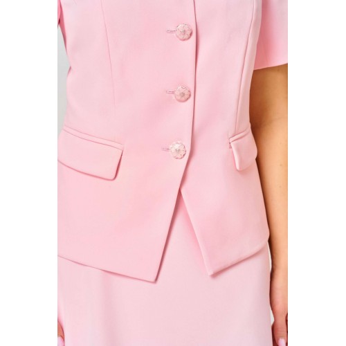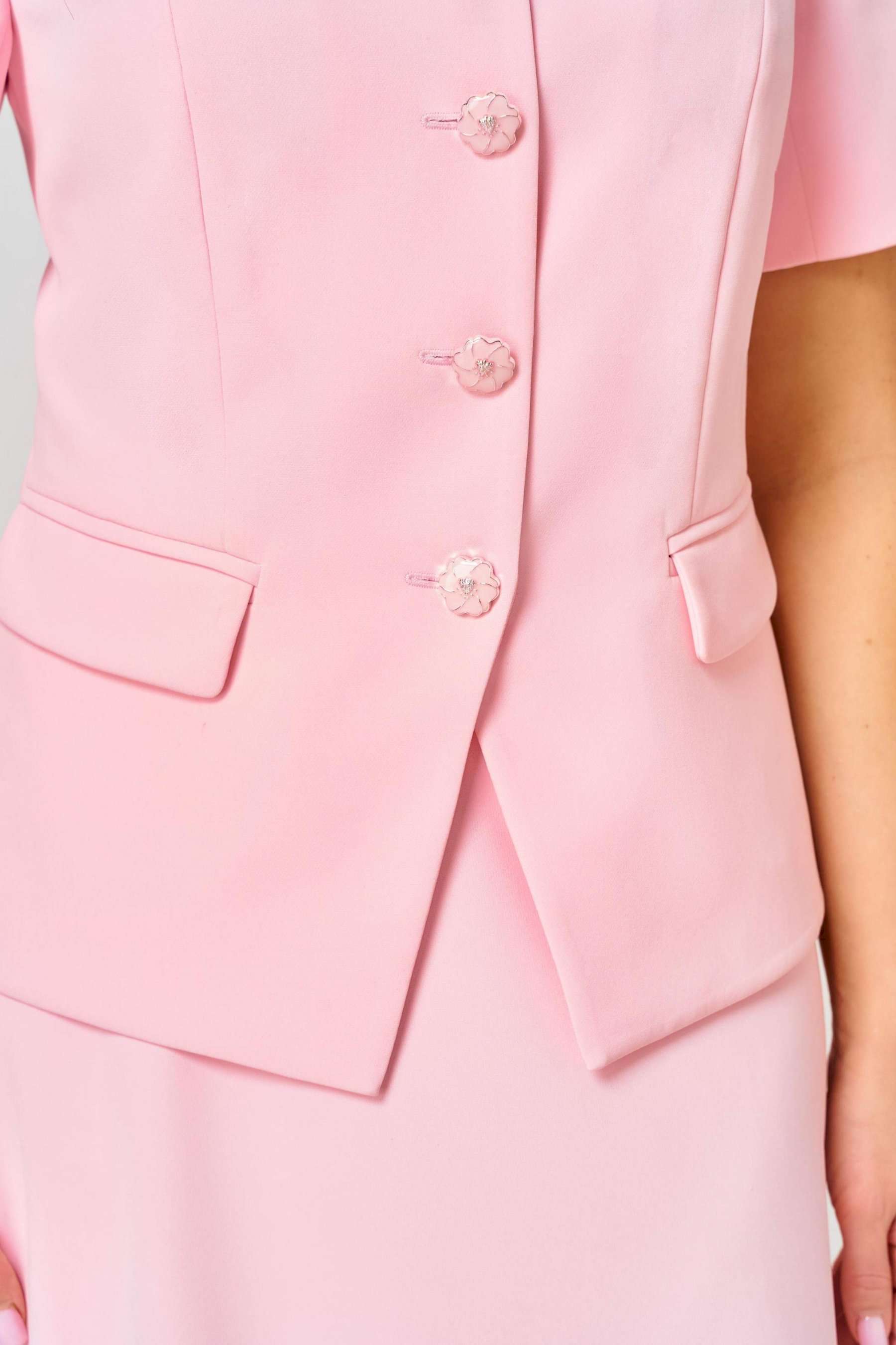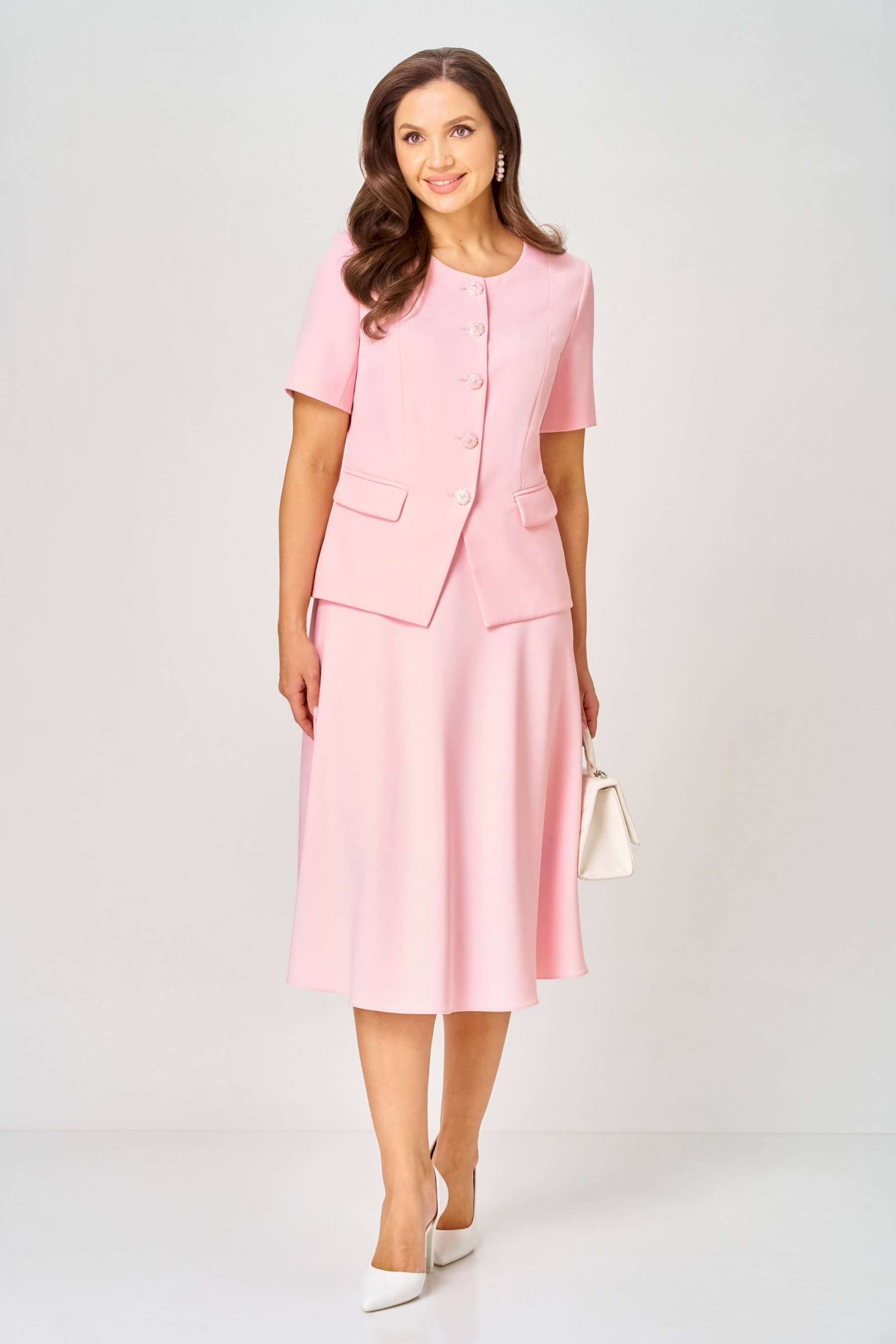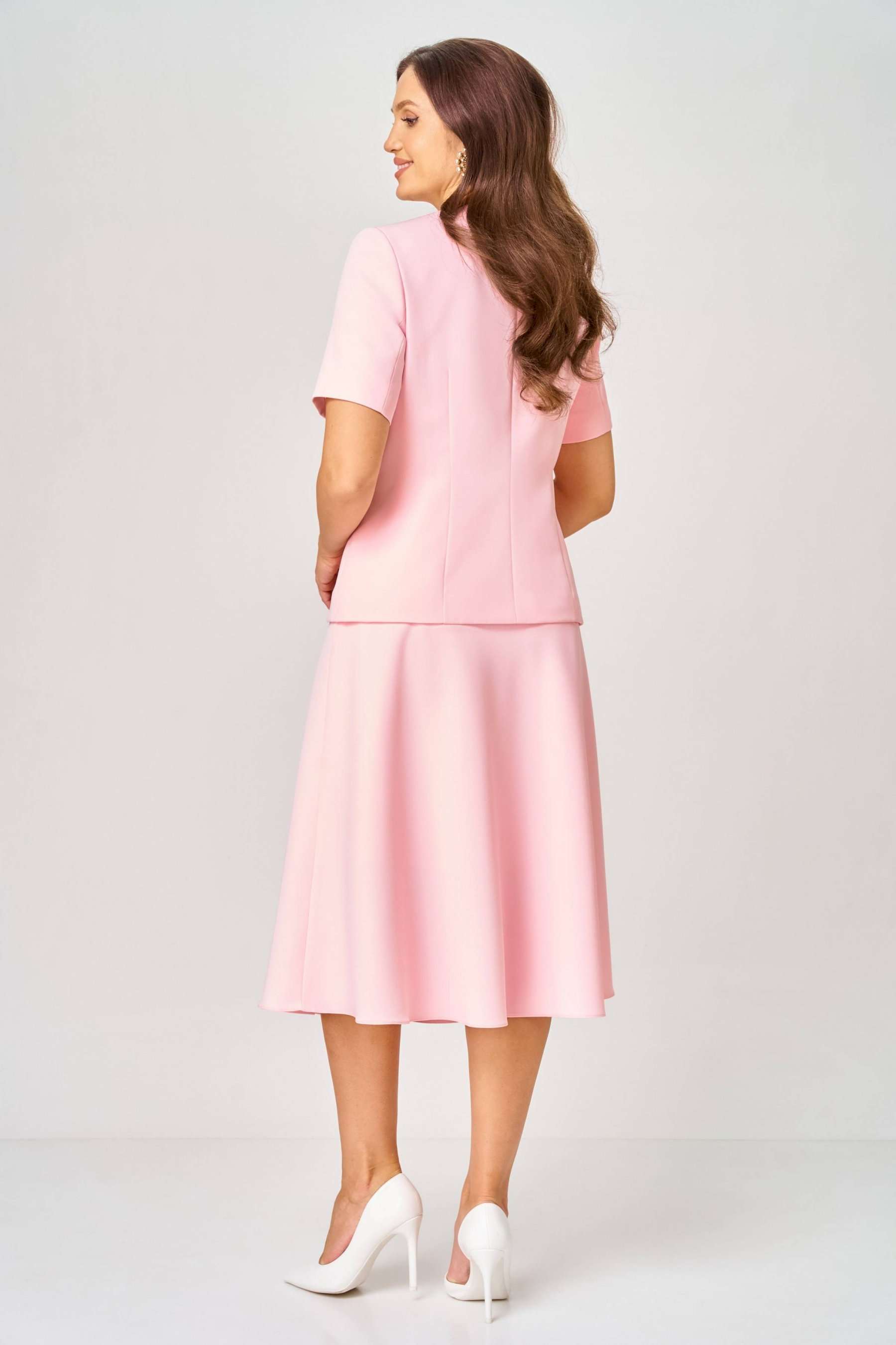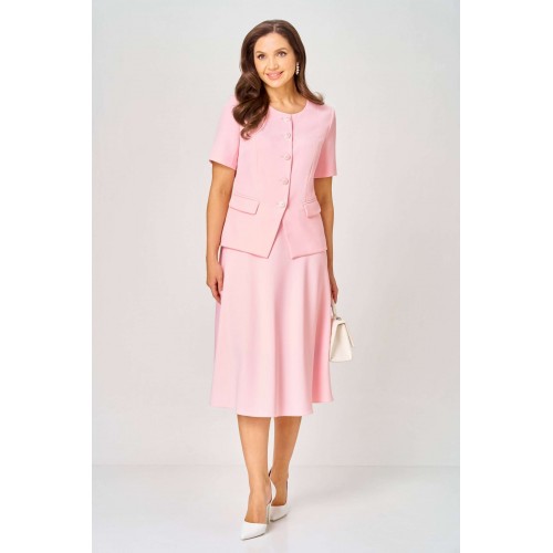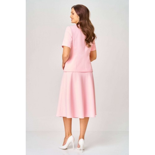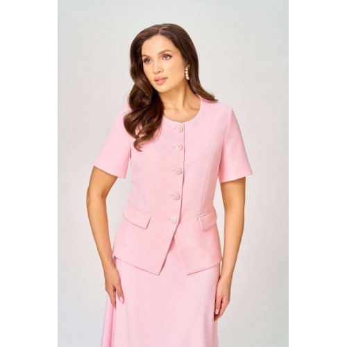 Комплект состоит из жакета и юбки и изготовлен из костюмной ткани , тактильно-приятной на ощупь , износостойкой, устойчивой к появлению заломов, простой в уходе. Жакет полуприлегающего силуэта на подкладке. Перед с двумя рельефами, выходящими от плеча, с прорезными карманами в рамку с клапаном, с центральной застёжкой на пуговицы. Вырез горловины круглый. Низ переда фигурный. Рукав короткий, двухшовный на подкладке. Спинка со средним швом и двумя талиевыми вытачками. Юбка колоколообразной формы, на подкладке, кроеная по косой, с притачным поясом и застёжкой на молнию в боковом шве. Женственный, нарядный и нежный, как сама весна, комплект покорит Вас своей изысканностью и элегантностью и идеально подойдёт и для работы в офисе, и для торжественного случая .
