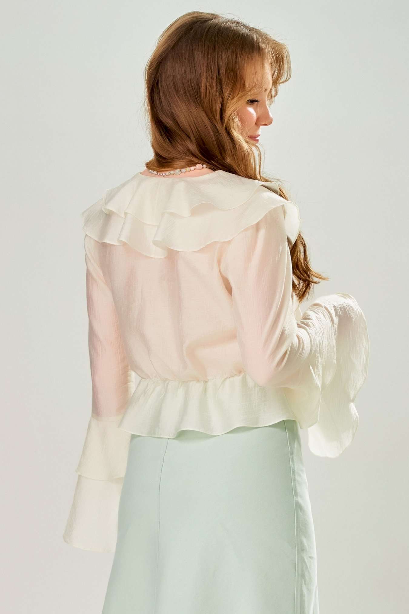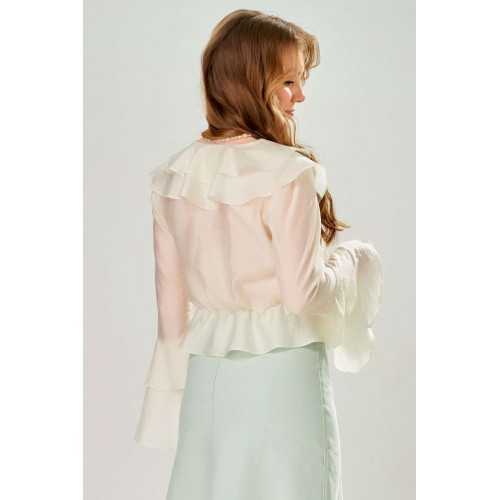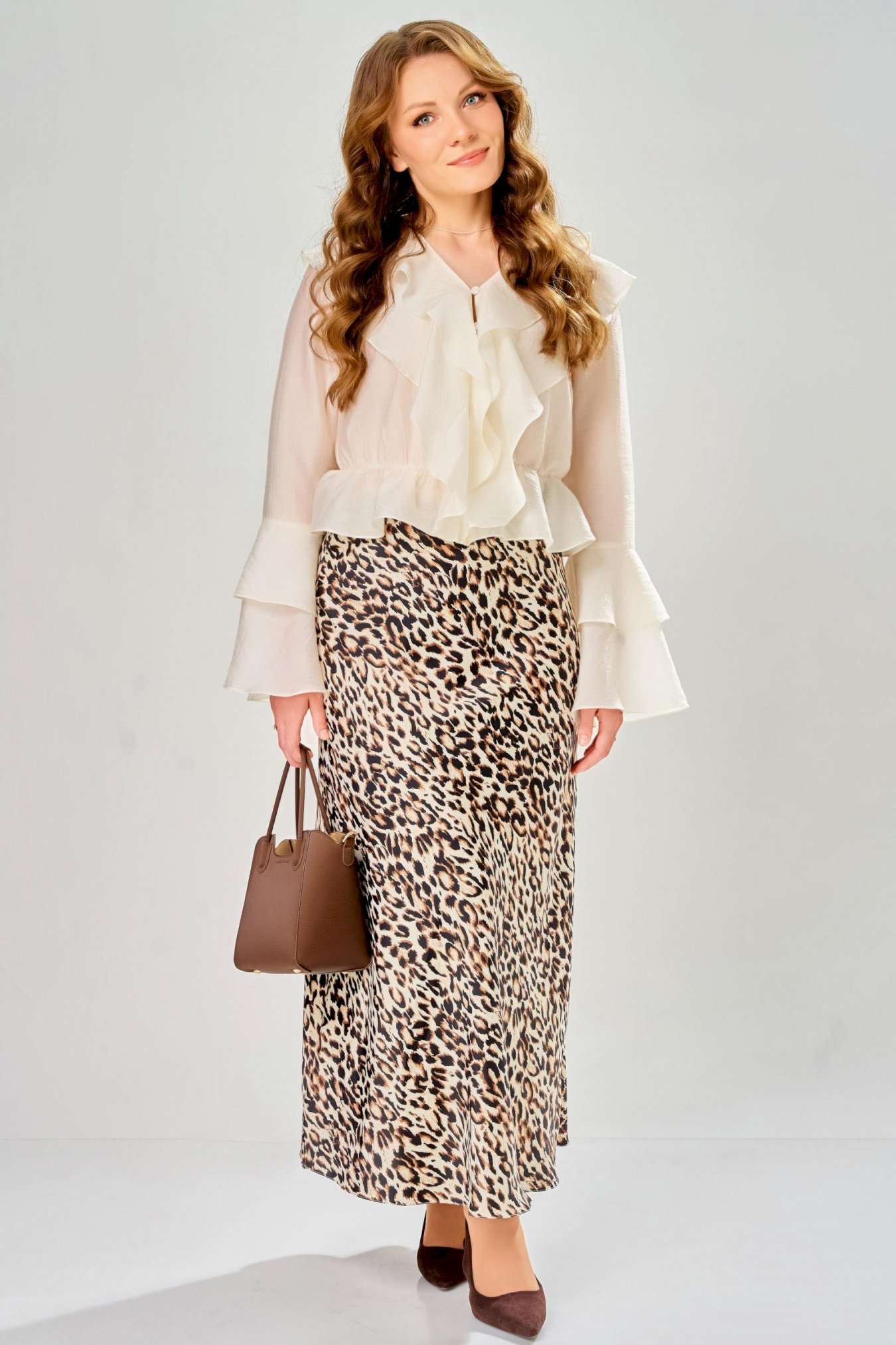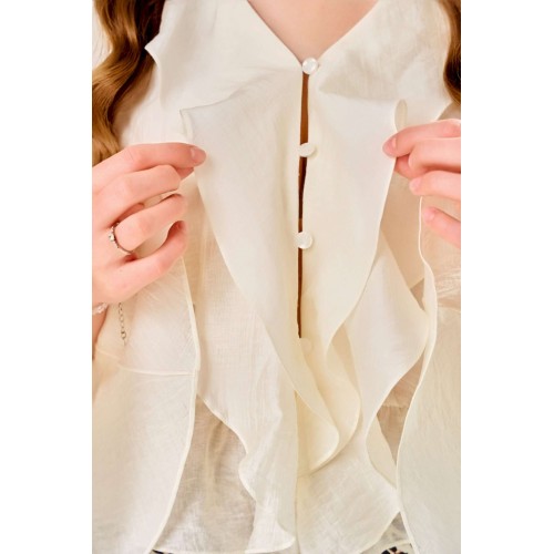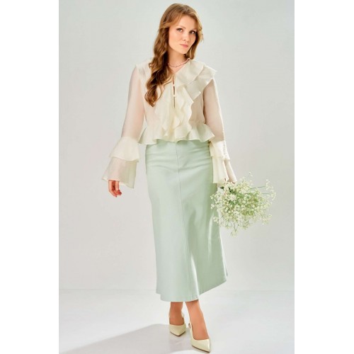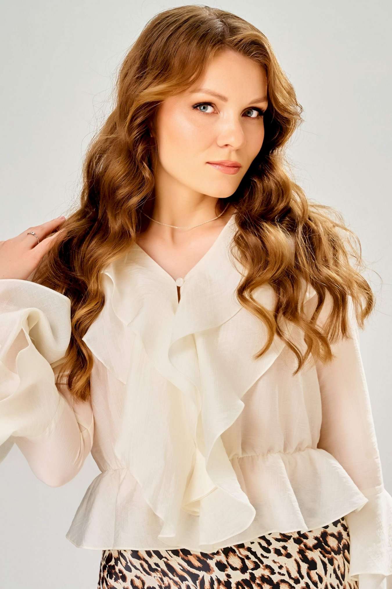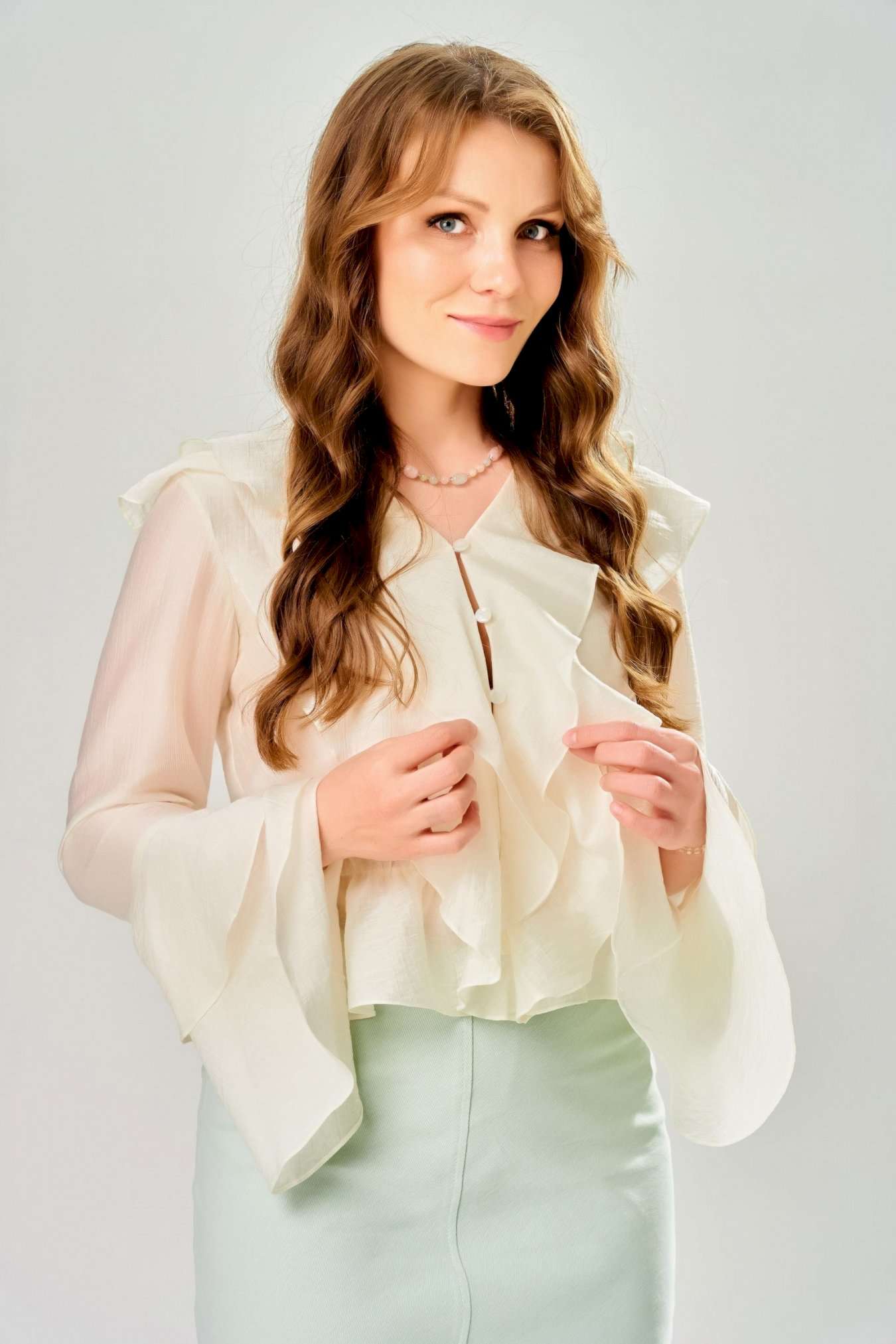Блузка \"Милеса\" выполнена из текстильной ткани \"Вуаль Верона\", в составе которой присутствует тенсел и полиамид. Блузка, отрезная по талии на резинке. Застежка в блузке на петли и пуговицы, с потайной планкой. Блузку украшает двойной волан, с полочки переходящий на спинку. Рукава втачные одношовные. По низу рукавов двойные воланы. Эта нарядная блузка отлично подойдет для носки с брюками и юбкой. Нарядная, элегантная и эффектная блузка \"Милеса\".