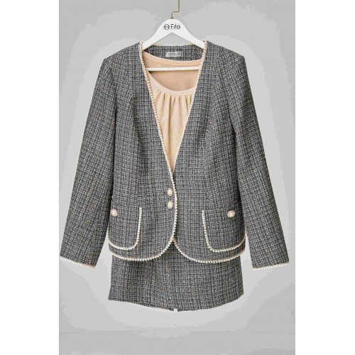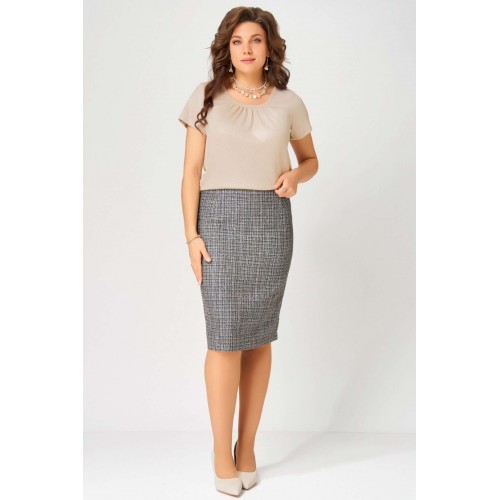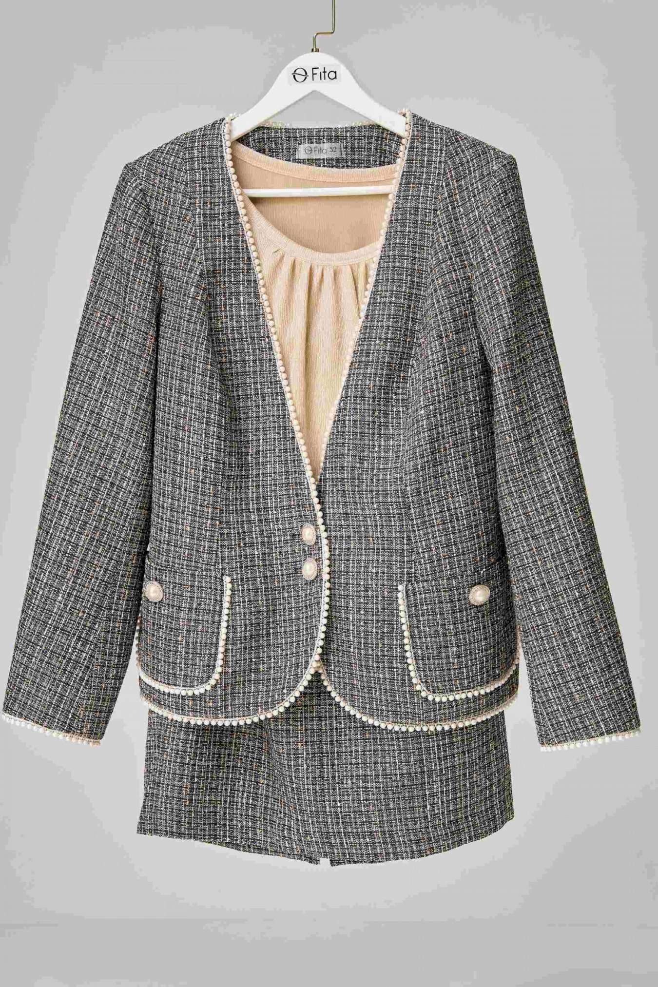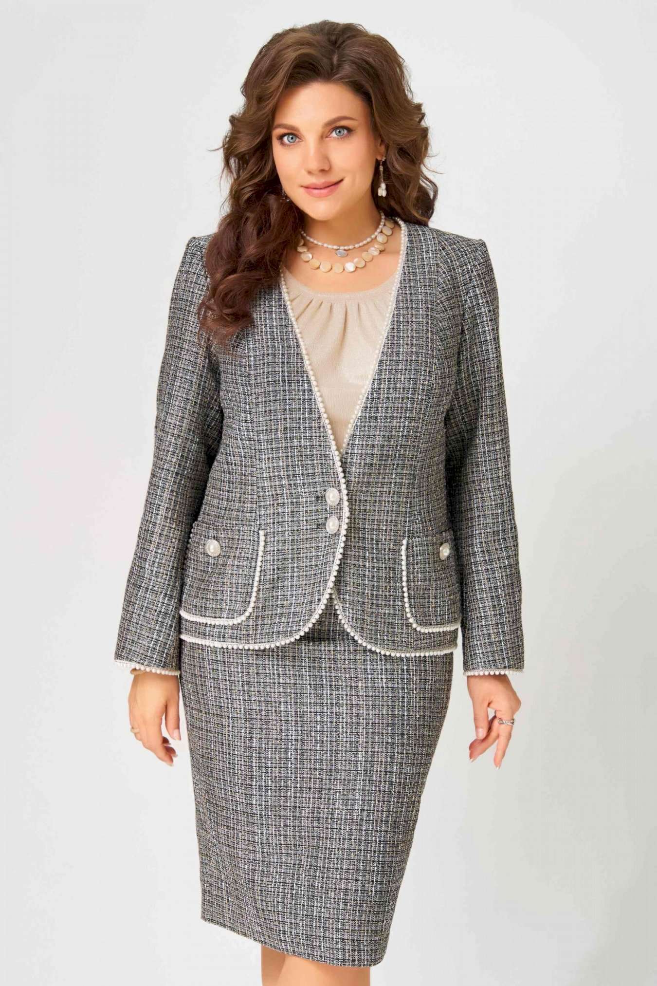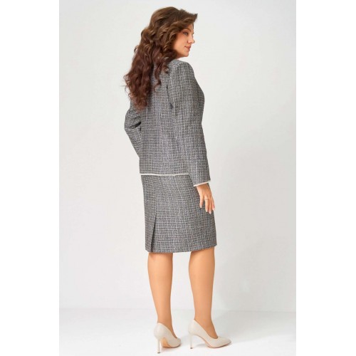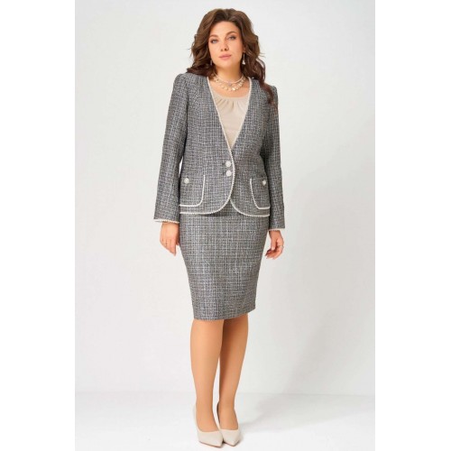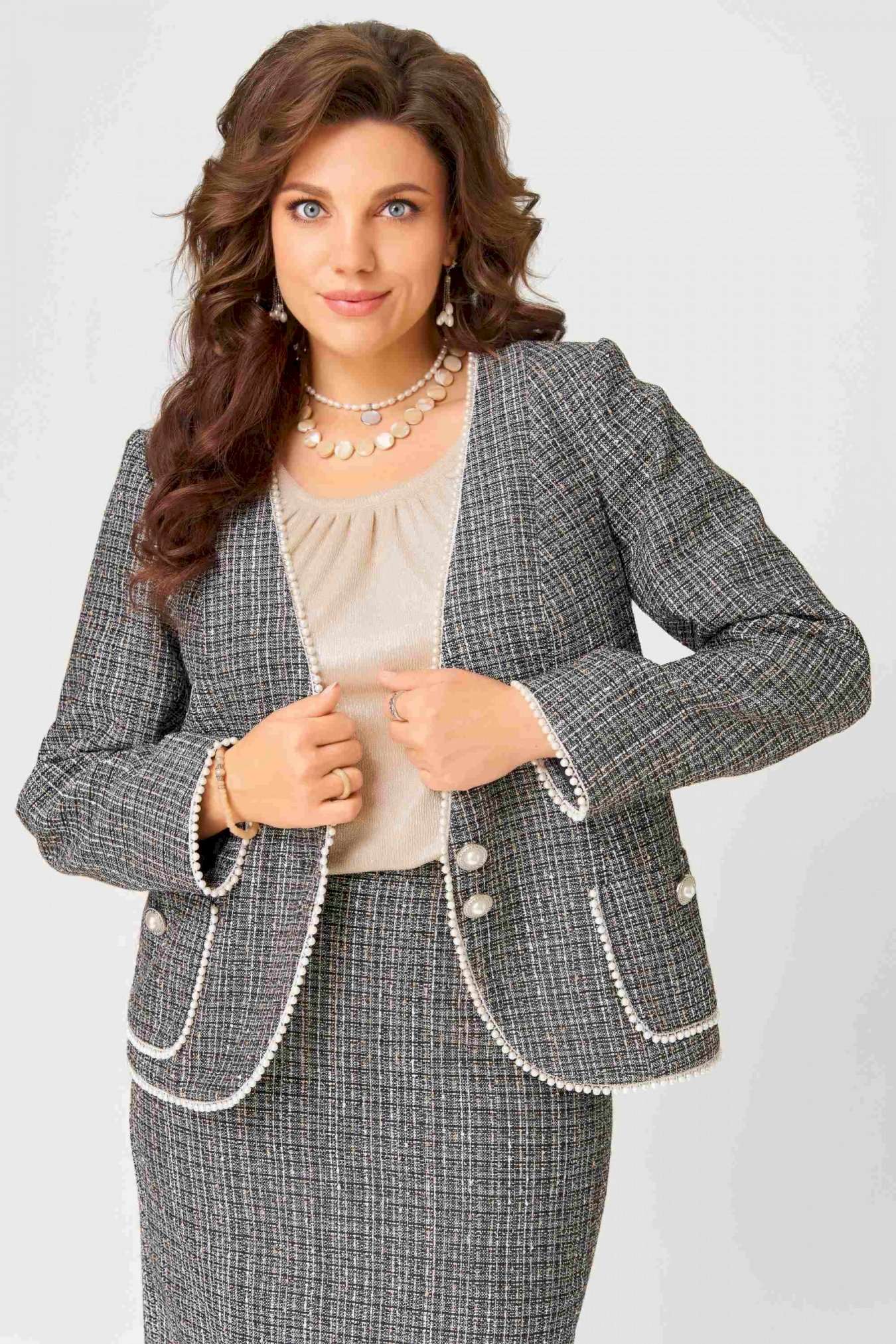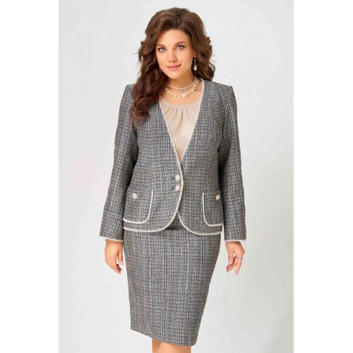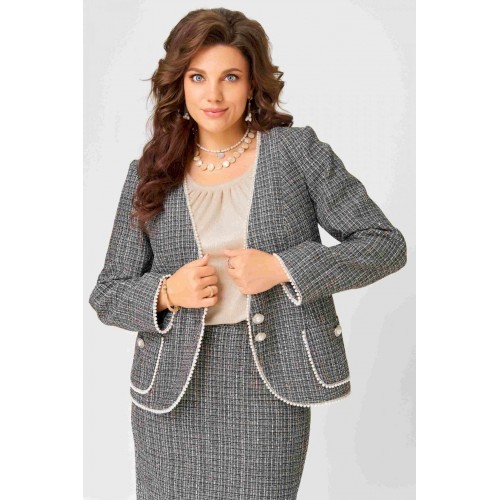 Нарядный комплект тройка \"\"Ясиня\"\" состоит из жакета, юбки и нарядного джемпера. Жакет на подкладке полуприлегающего силуэта. Застежка в жакете однобортная на две пуговицы. По полочке рельефы, два накладных кармана, обрамленных декоративной тесьмой с застежкой на петлю и пуговицу. По спинке рельефы. По краю борта в жакете, по низу изделия и по низу рукавов настрочена декоративная тесьма. Юбка выполнена из твидовой ткани, зауженная к низу. Пояс притачной, по бокам резинка. По спинке шлица и застёжка на потайную молнию и пуговицу. Низ юбки обработан швом в подгибку с открытым срезом. Джемпер выполнен из трикотажного нарядного полотна. Горловина в жакете обработана окантовкой, по горловине - легкая сборка, рукава втачные одношовные. Низ изделия и рукавов подшиты на распошивалке. \"\"Ясиня\"\" — нарядная тройка, которая легко впишется в повседневность. Жакет, юбка и джемпер создают элегантный образ, подходящий как для торжеств, так и для рабочих будней. Стиль, комфорт и женственность — в каждой детали.