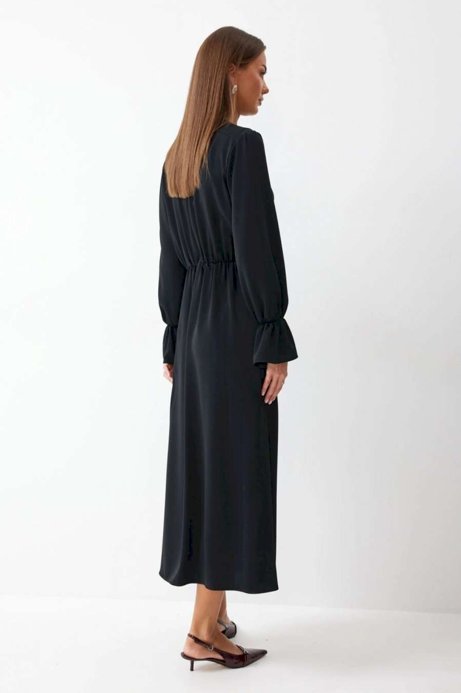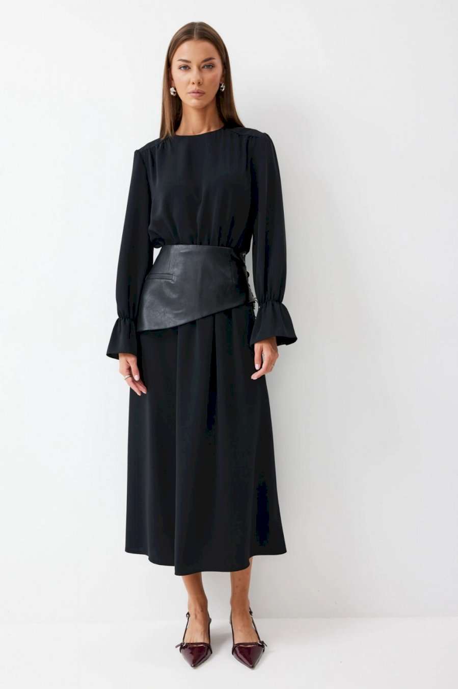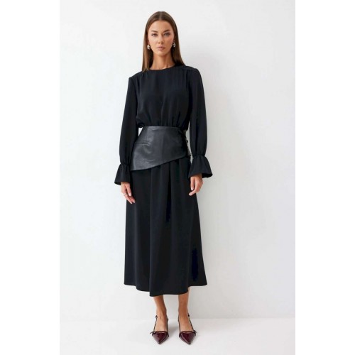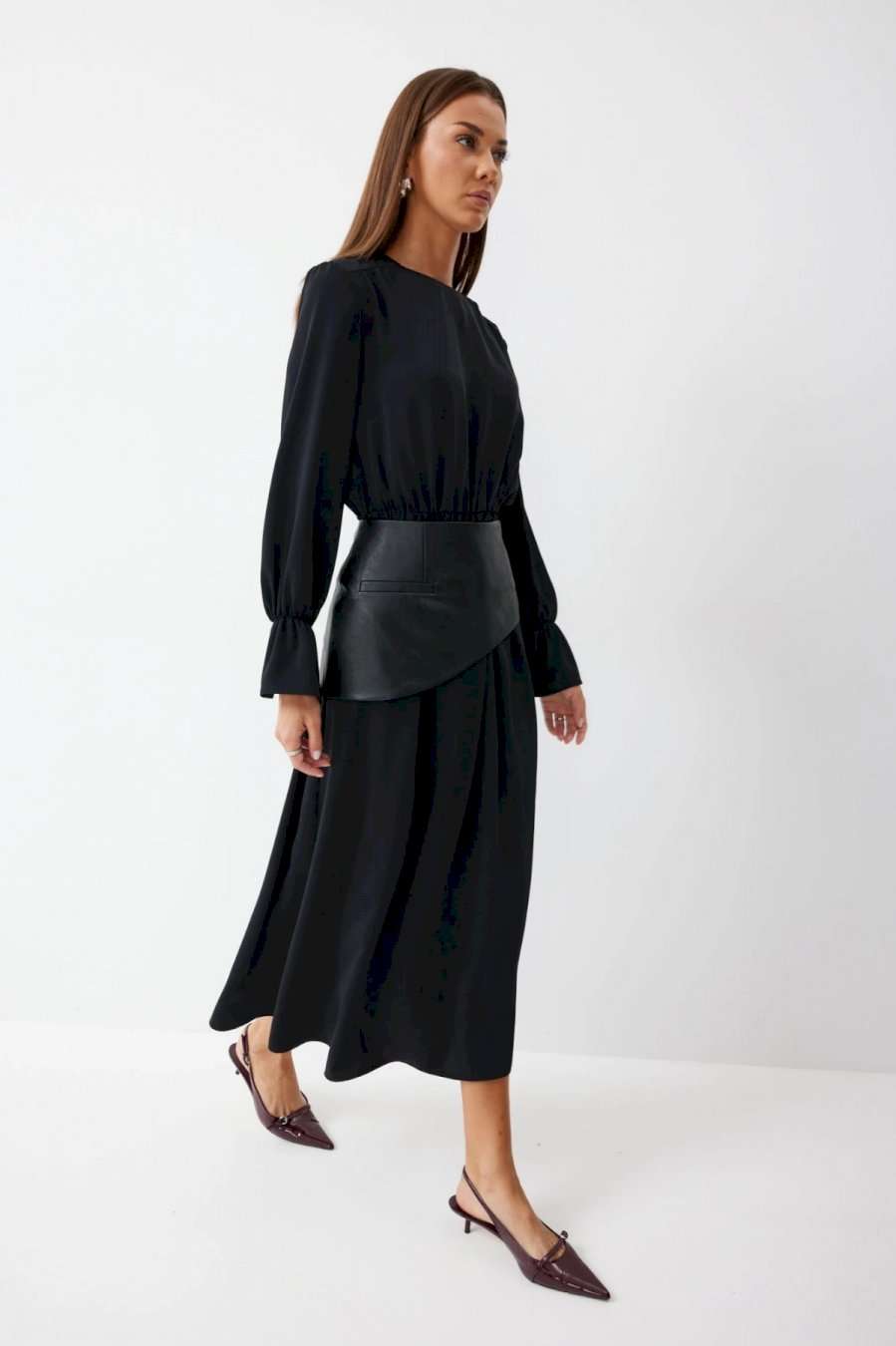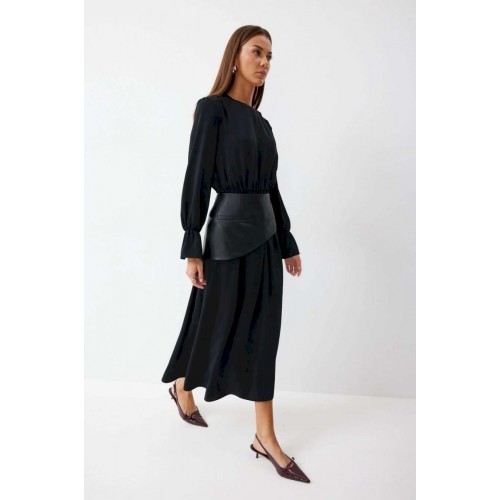Платье полуприлегающего силуэта из струящейся ткани. В области талии расположен подрез, с эластичной тесьмой. Рукав втачной, со сборкой по плечу, по низу волан, собранный на резинку. Юбка А-силуэта. Платье дополняет съёмная деталь в виде баски из эко кожи, с шнуровкой в боковом шве. Подробное описание Длина (в 44-48 р. – 125 см) (в 50 -54 р. – 126 см) Длина рукава 61 см