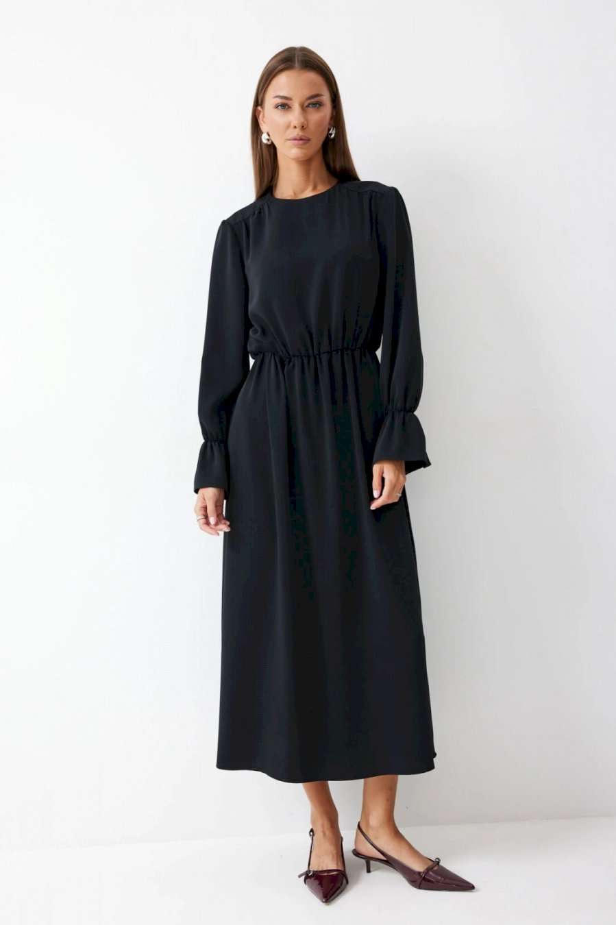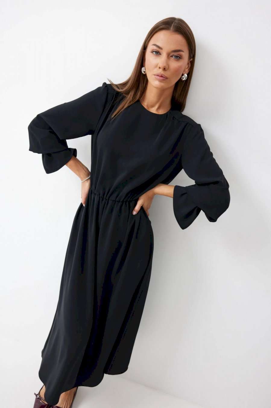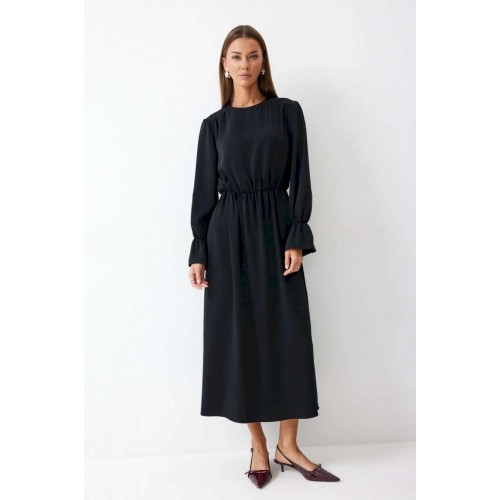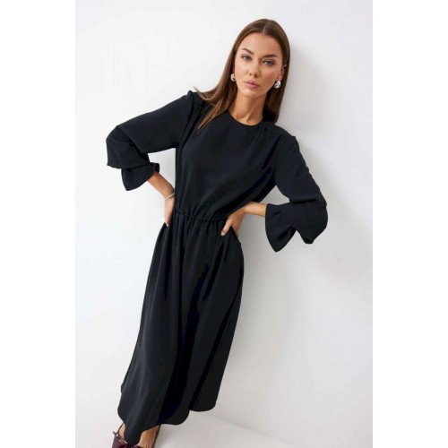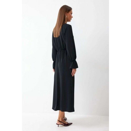 Платье полуприлегающего силуэта из струящейся ткани. В области талии расположен подрез, с эластичной тесьмой. Рукав втачной, со сборкой по плечу, по низу волан, собранный на резинку. Юбка А-силуэта. Платье дополняет съёмная деталь в виде баски из эко кожи, с шнуровкой в боковом шве. Подробное описание Длина (в 44-48 р. – 125 см) (в 50 -54 р. – 126 см) Длина рукава 61 см
