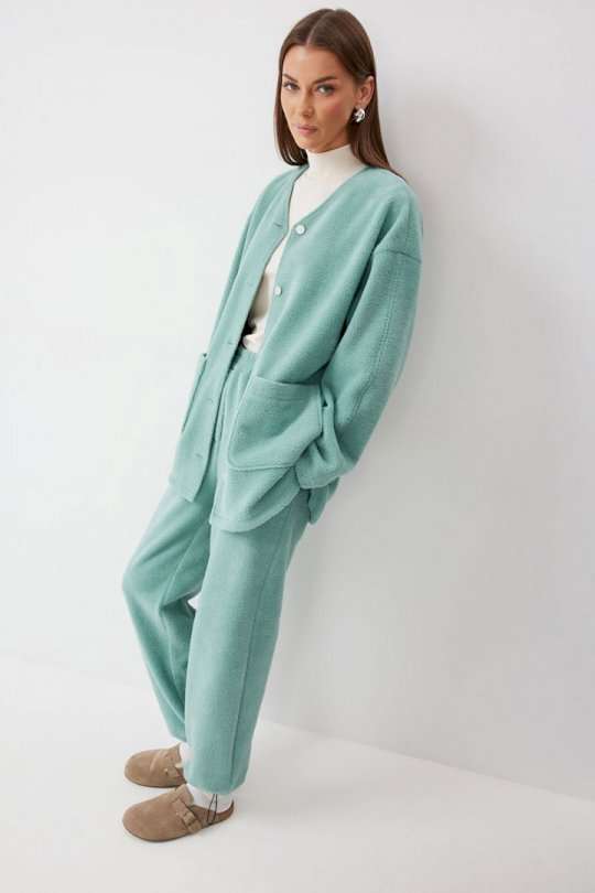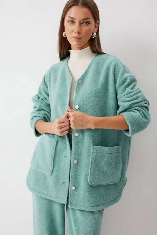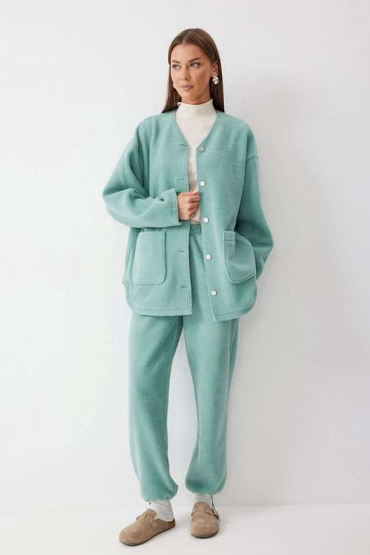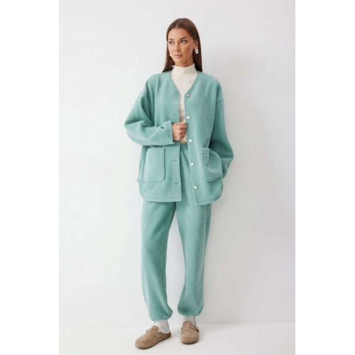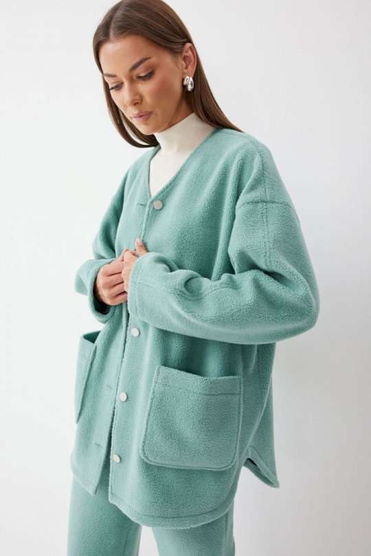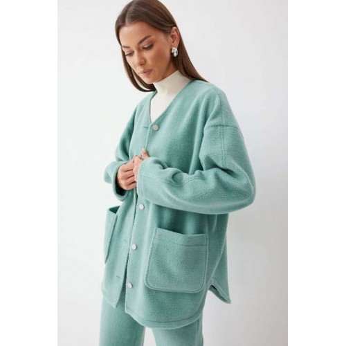 Жакет прямого силуэта с фигурным низом из трикотажного полотна. Горловина округлая, по центру застежка на кнопки. Рукав со спущенной линией плеча. По переду накладные карманы. Жакет без подкладки. Обращаем ваше внимание, что фурнитура может отличаться от фото. Подходит на рост 164-170 см. Длина жакета (44-48р - 75см)(50-54р - 78см)(56-60р - 80см). Длина рукава (44-48р - 74см)(50-54р - 76,5см)(56-60р - 79см).