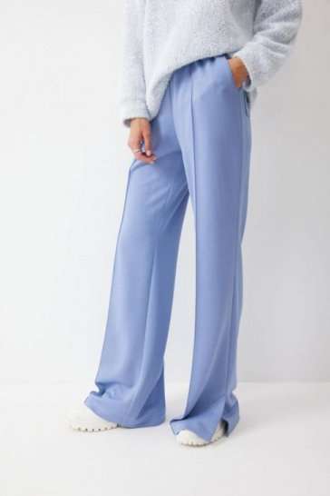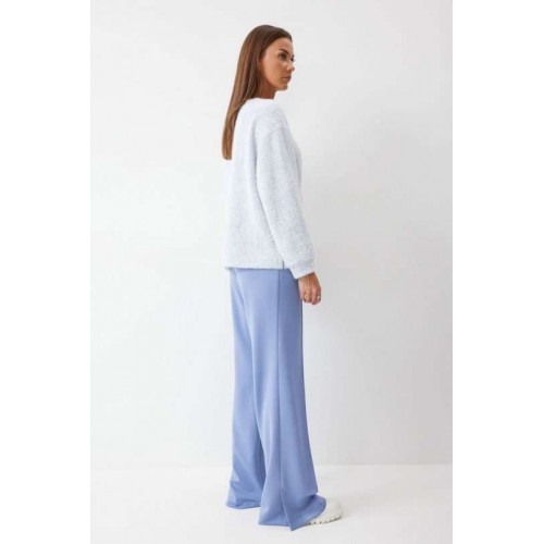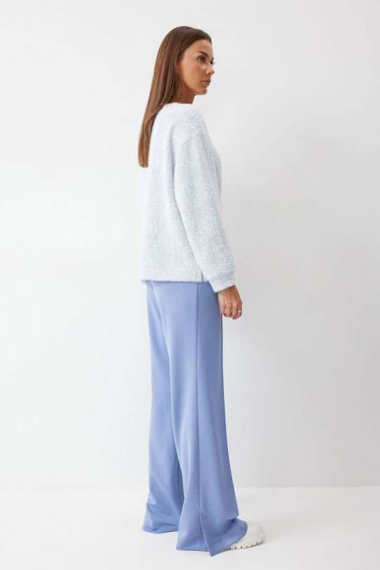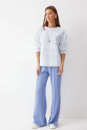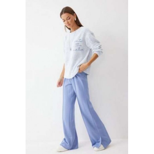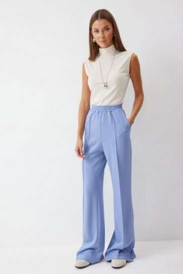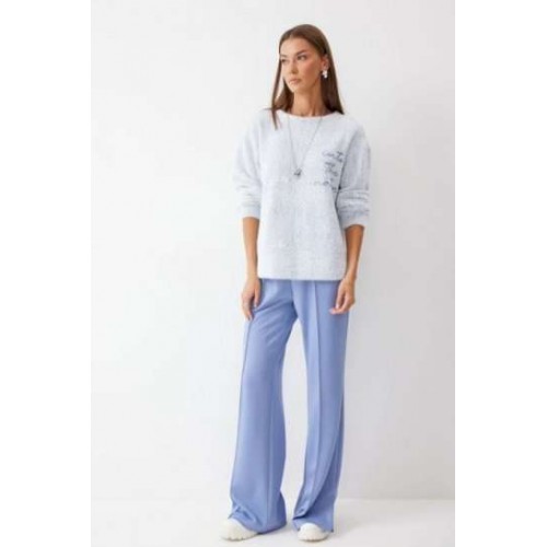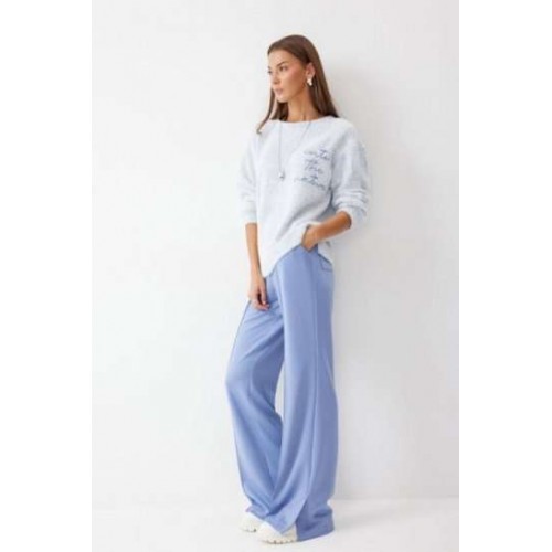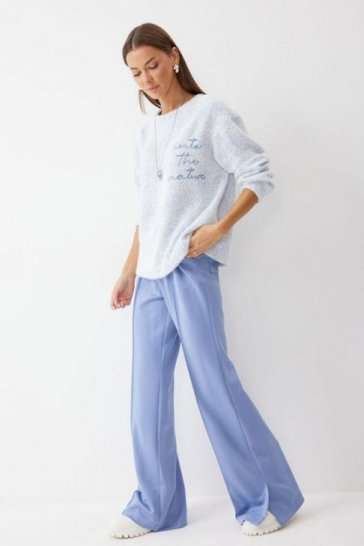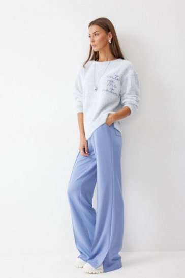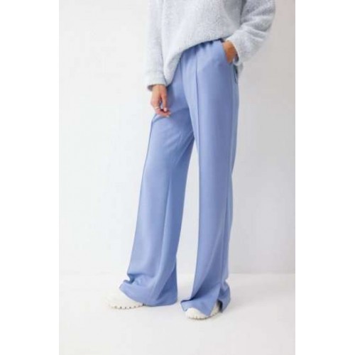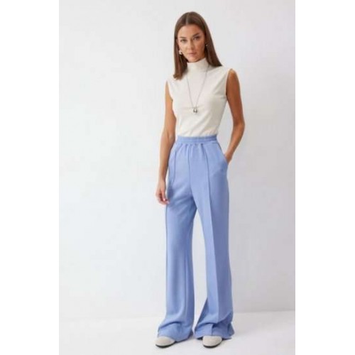 Брюки прямого силуэта из трикотажного полотна. По верху брюк притачной пояс на резинке. На передних половинках брюк обработаны карманы и защипы. На задних – карманы. По низу внешнего шва брюк шлицы. Подходит на рост 164-170 см. Длина брюк (44-48р - 107+4,5см пояс)(50-54р - 108+4,5см пояс)(56-60р - 109+4,5см пояс).
