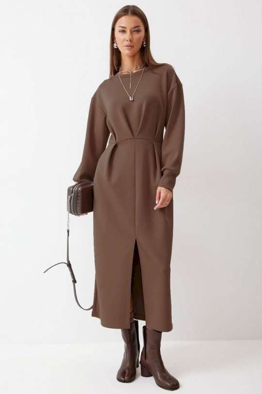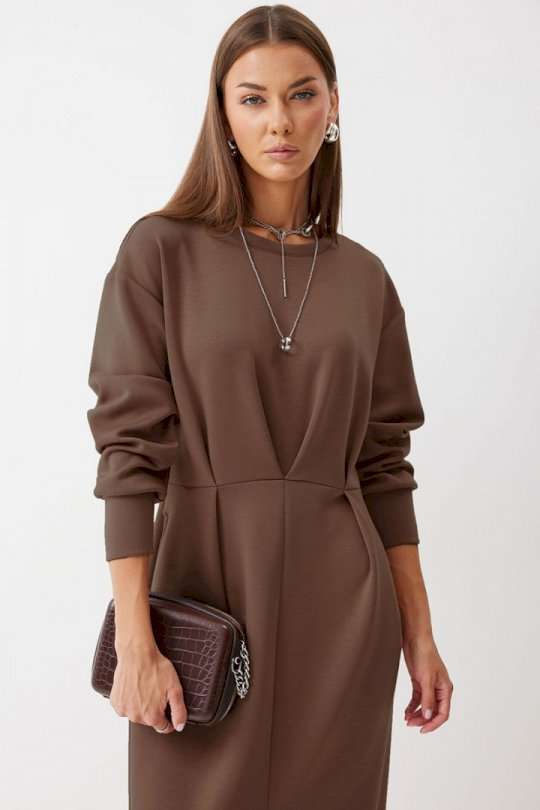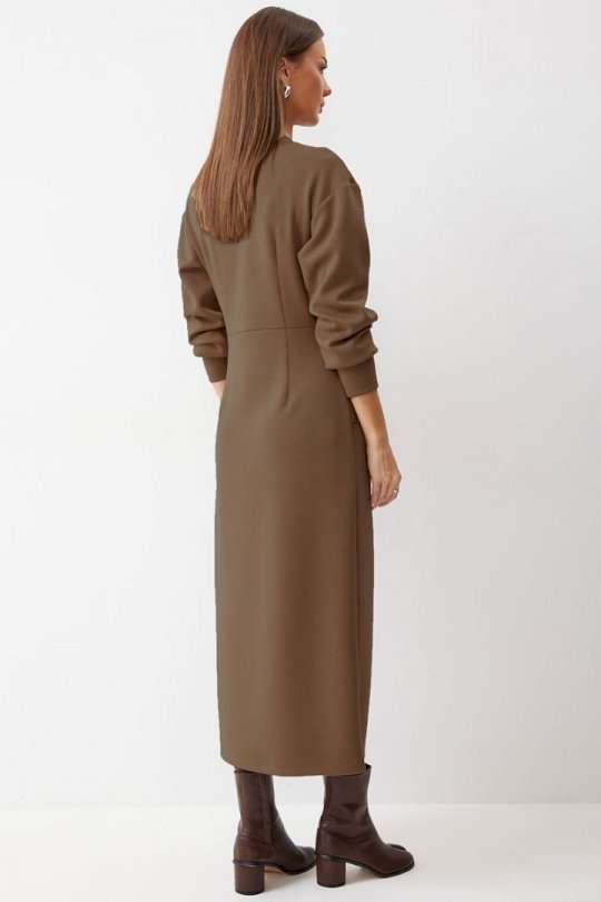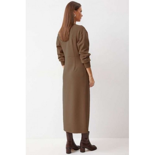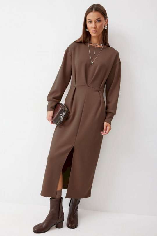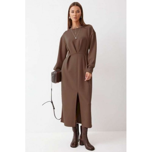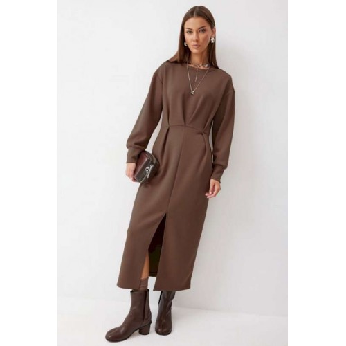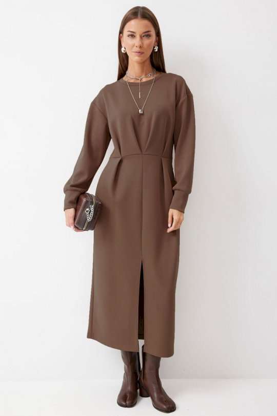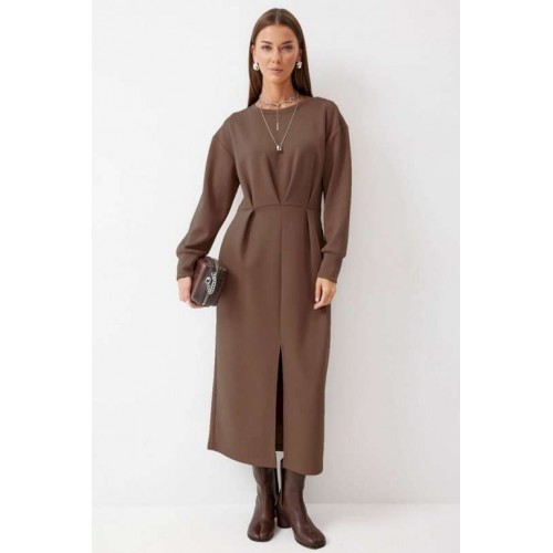 Платье полуприлегающего силуэта из трикотажного полотна. Горловина округлая. Рукав со спущенной линией плеча по низу манжета. Платье отрезное по линии талии. По переду на талии складки. В боковом шве функциональные карманы. В центральном шве юбки разрез. Подходит на рост 164-170 см. Длина платья 126 см. Длина рукава от горловины 72 см.