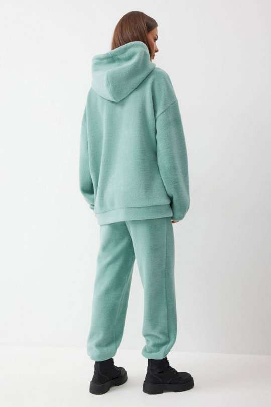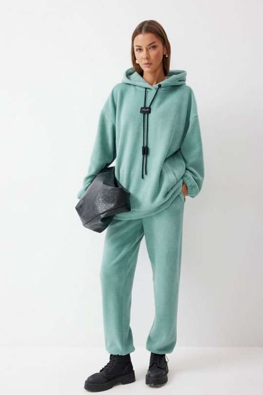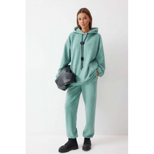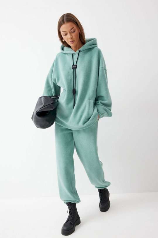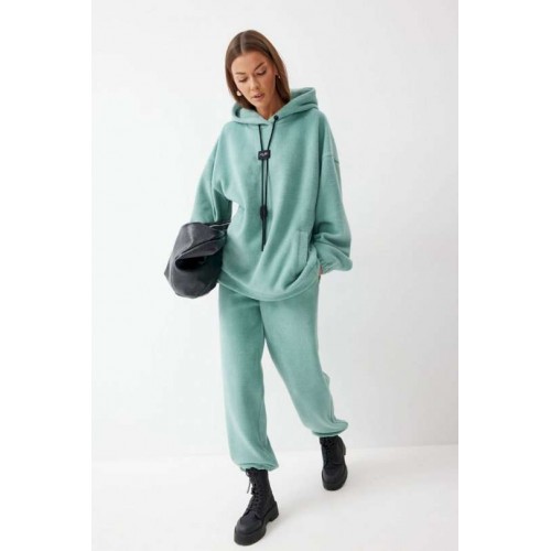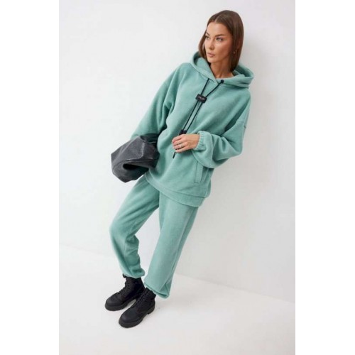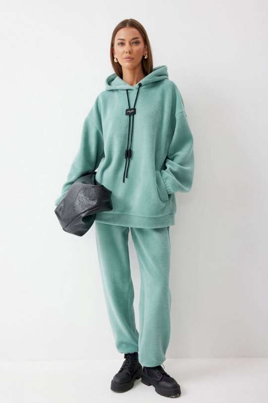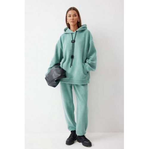 Костюм, состоящий из джемпера и брюк. Джемпер прямого силуэта из комфортного трикотажного полотна. Горловина обработана капюшоном. Рукав со спущенной линией плеча, по низу на резинке. По низу джемпера притачной пояс. По переду декоративная нашивка и шнур. Брюки прямого силуэта из комфортного трикотажного полотна. По верху брюк притачной пояс на резинке. На передних половинках брюк обработаны карманы. Ширина брюк по низу регулируется за счет эластичной тесьмы и фиксаторов. Обращаем ваше внимание, что фурнитура может отличаться от фото. Подходит на рост 164-170 см. Длина джемпера 70 см. Длина рукава от горловины (44-48р – 76см)(50-54р - 76,5см). Длина брюк (44-48р -100+4,5см)(50-54р - 101+4,5см).