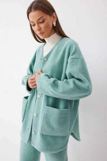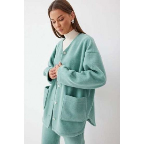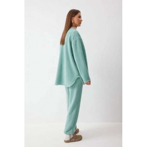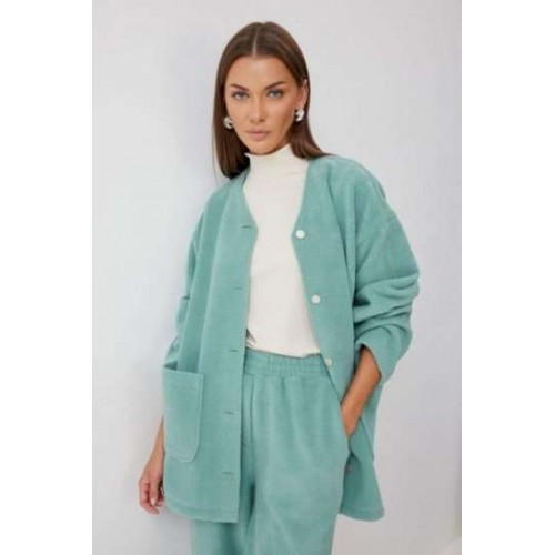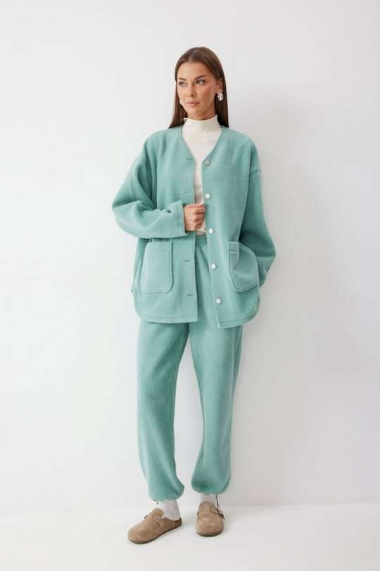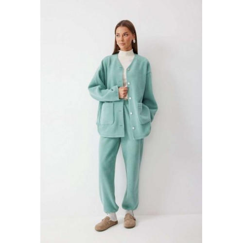 Костюм, состоящий из жакета и брюк. Жакет прямого силуэта с фигурным низом из трикотажного полотна. Горловина округлая, по центру застежка на кнопки. Рукав со спущенной линией плеча. По переду накладные карманы. Жакет без подкладки. Обращаем ваше внимание, что фурнитура может отличаться от фото. Брюки прямого силуэта из комфортного трикотажного полотна. По верху брюк притачной пояс на резинке с декоративной нашивкой. На передних половинках обработаны карманы. Ширина брюк по низу регулируется за счет эластичной тесьмы и фиксаторов. Обращаем ваше внимание, что фурнитура может отличаться от фото. Подходит на рост 164-170 см. Длина жакета (44-48р - 75см)(50-54р - 78см)(56-60р - 80см). Длина рукава (44-48р - 74см)(50-54р - 76,5см)(56-60р - 79см). Длина брюк (44-48р -100+4,5см)(50-54р - 101+4,5см).